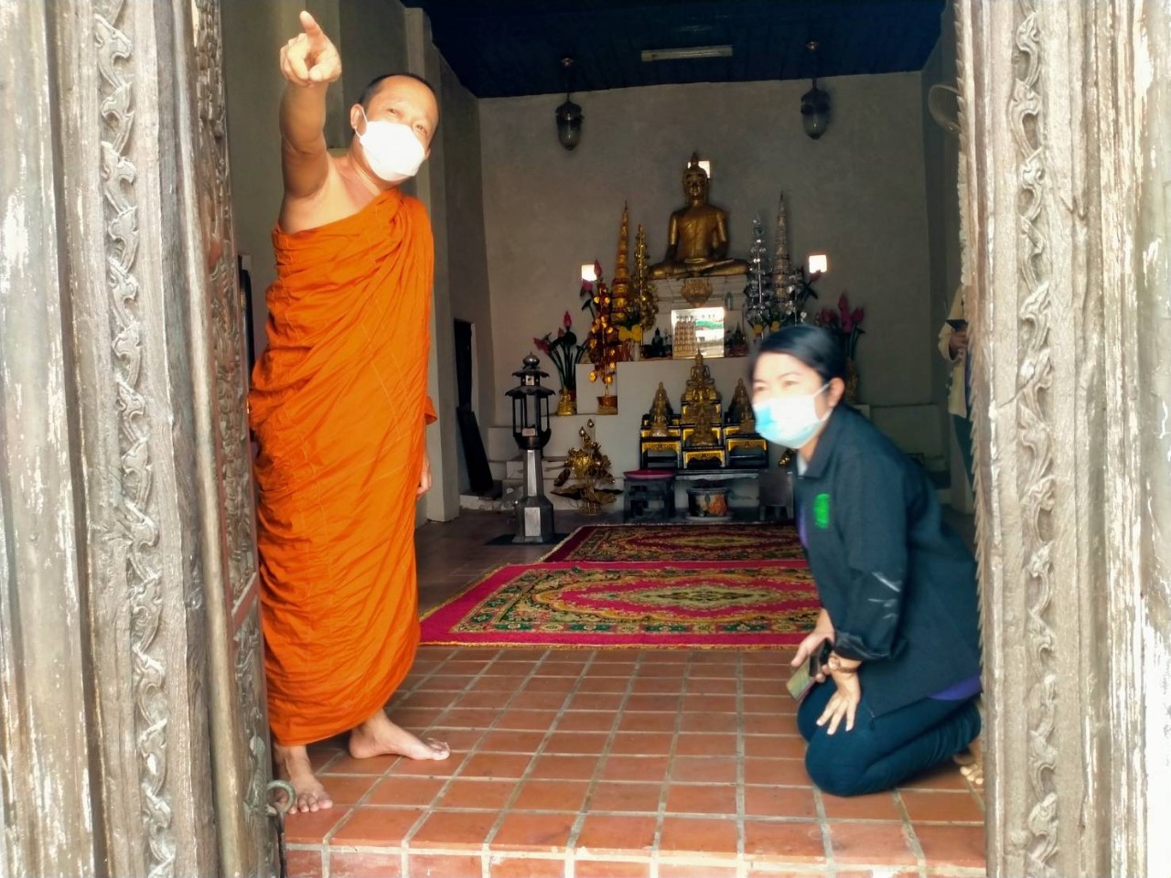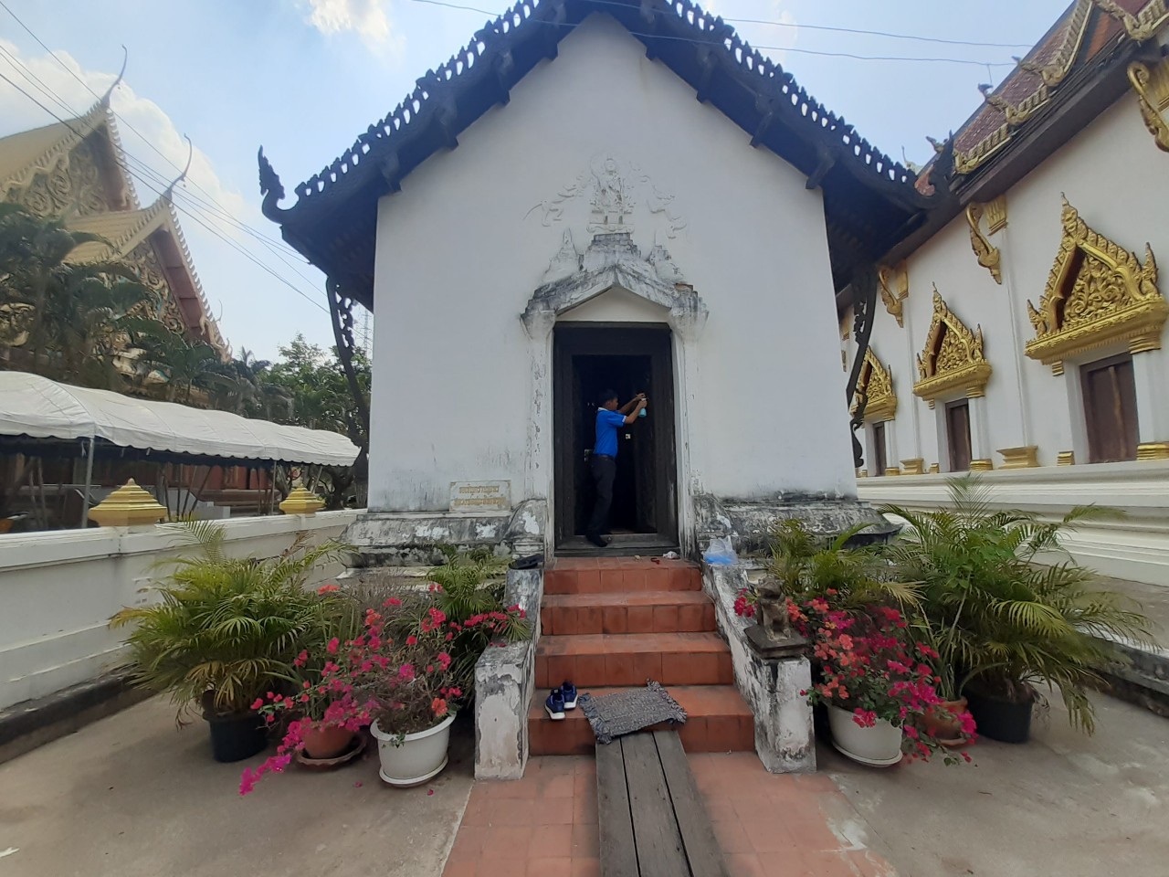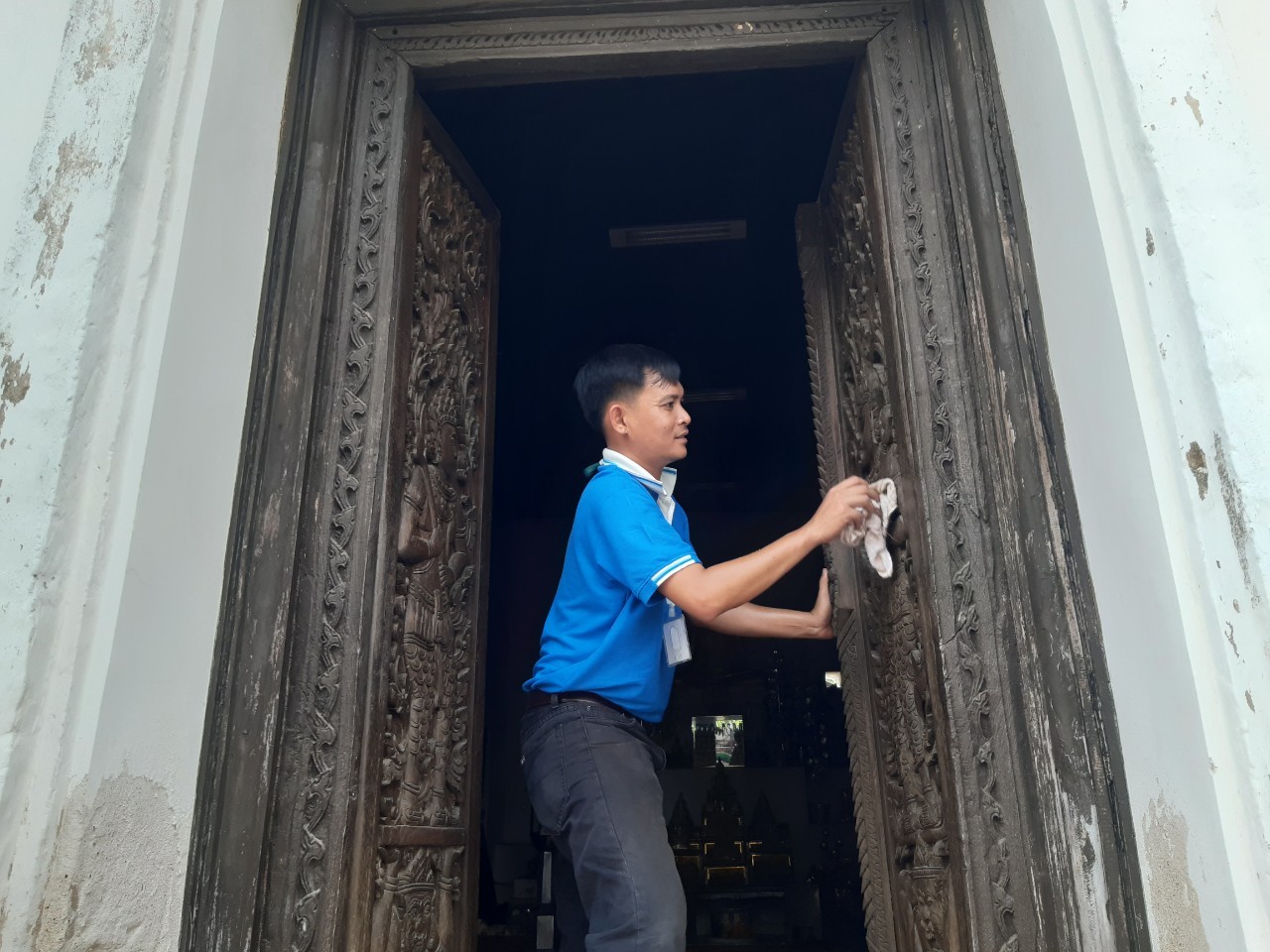 ดำเนินการทำความสะอาดบานประตูไม้แกะสลักอุโบสถเก่า วัดสุวรรณาวาส ตำบลโคกพระ อำเภอกันทรวิชัย จังหวัดมหาสารคาม