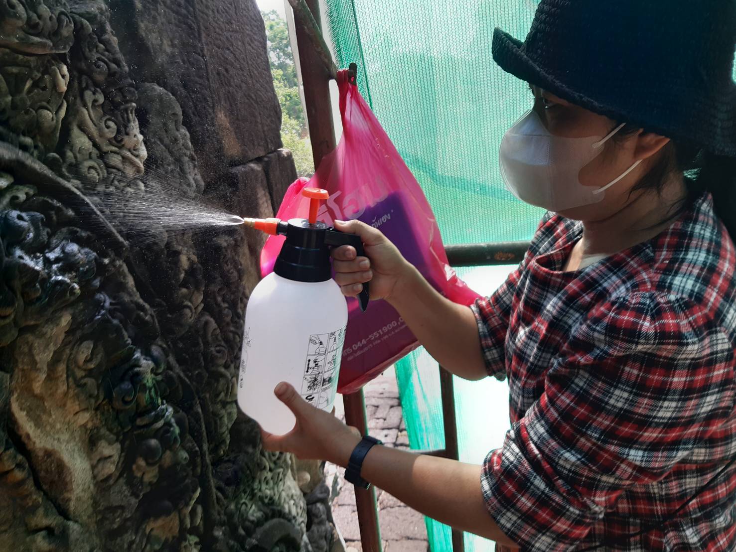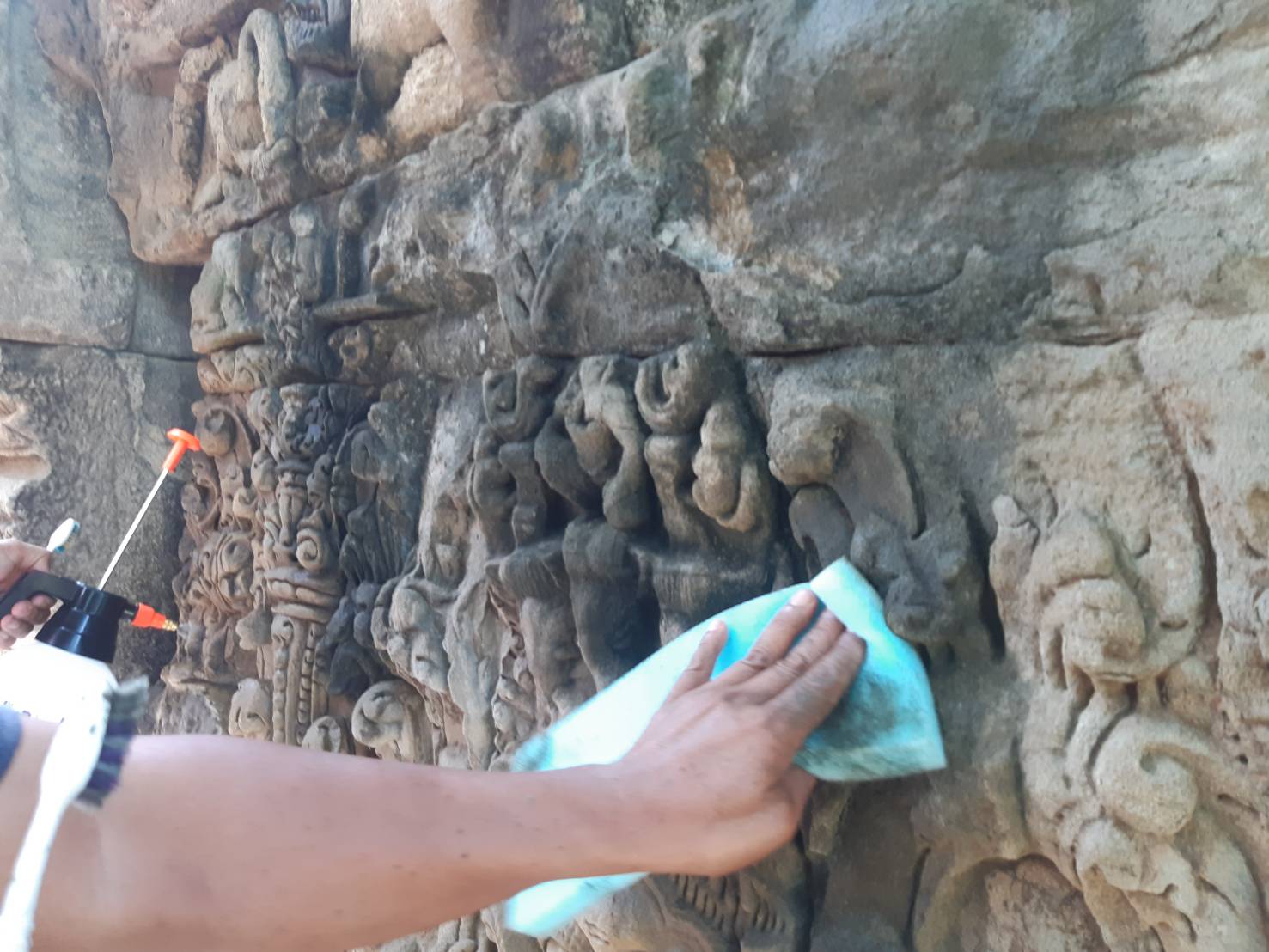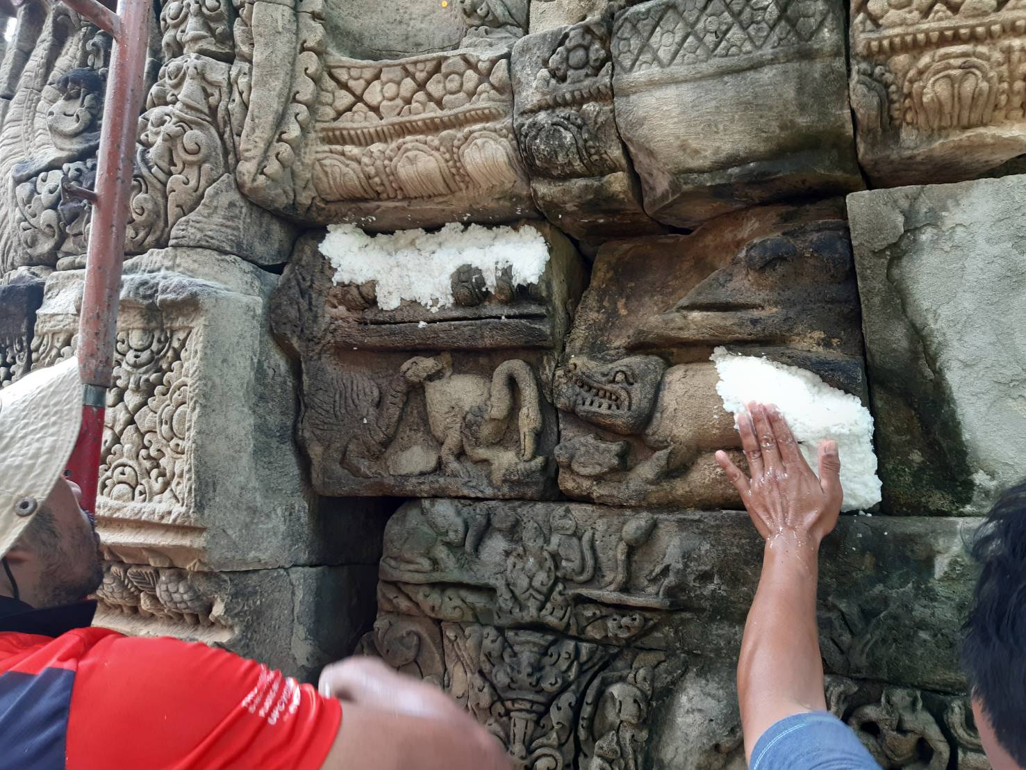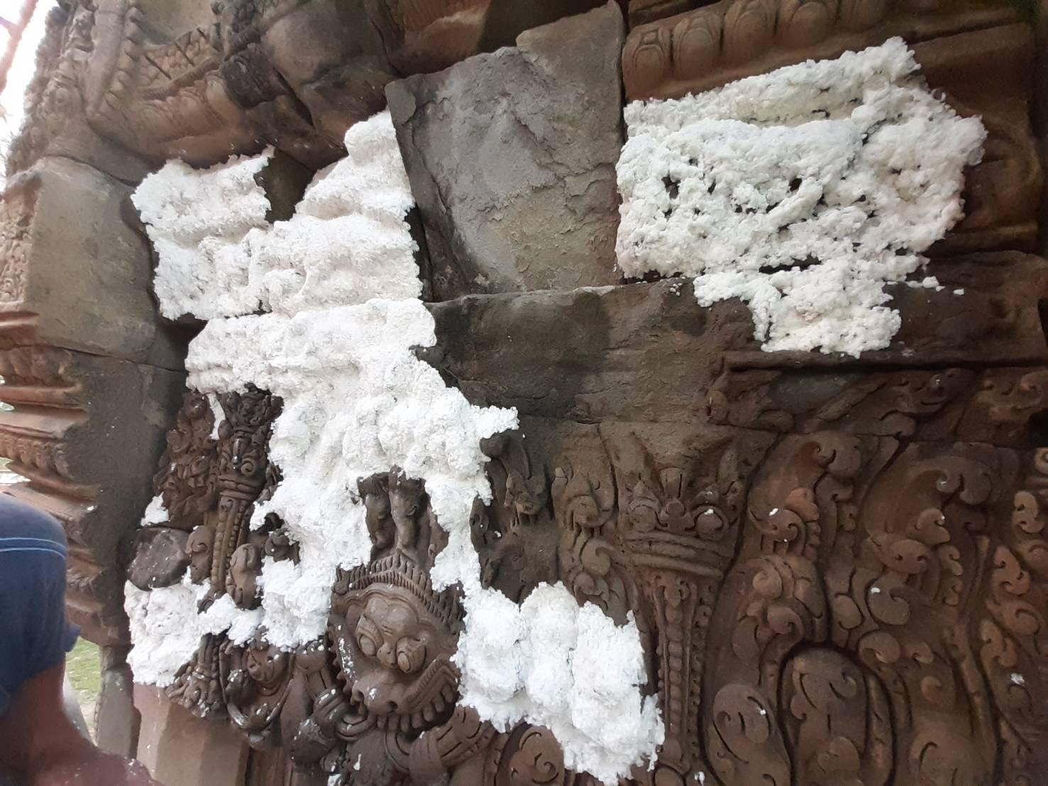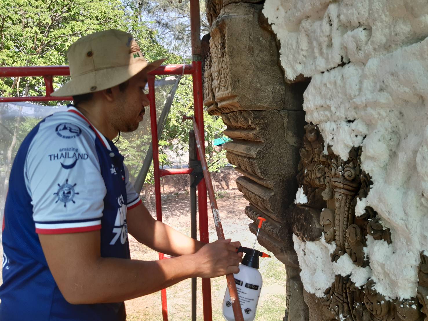 - ดำเนินการดูดเกลือด้วยเยื่อกระดาษบริสุทธิ์ Cellolose power บริเวณที่มีค่าเกลือเข้มข้น บนหน้าบันและทับหลังทิศใต้ และทิศเหนือ