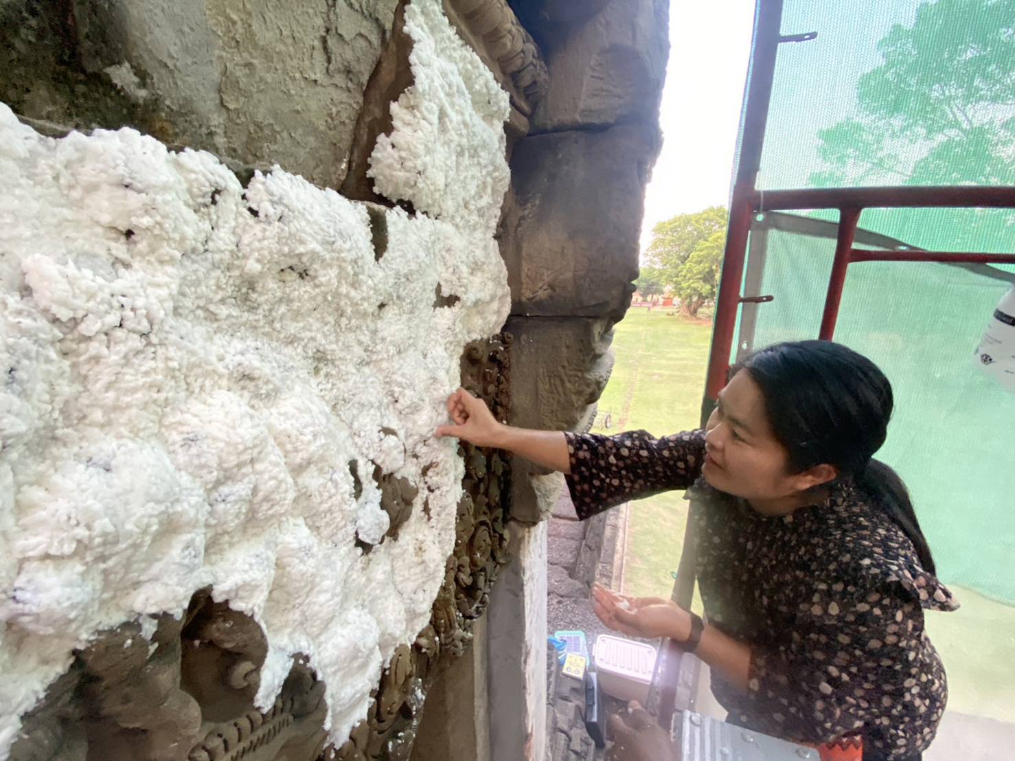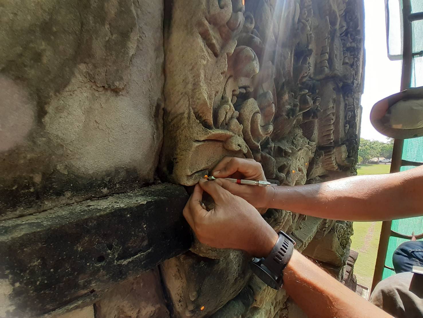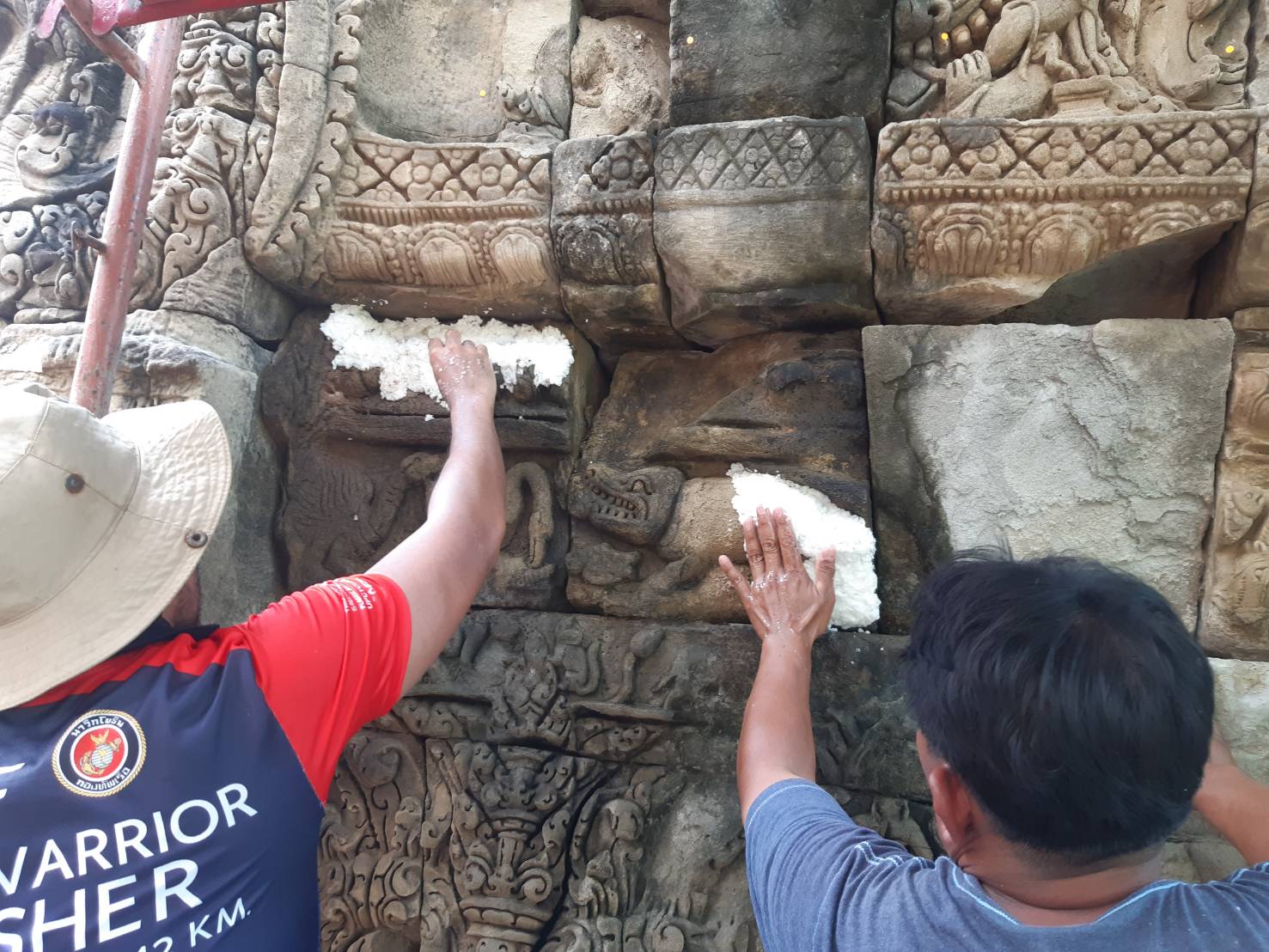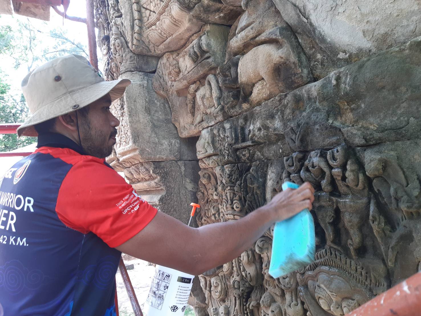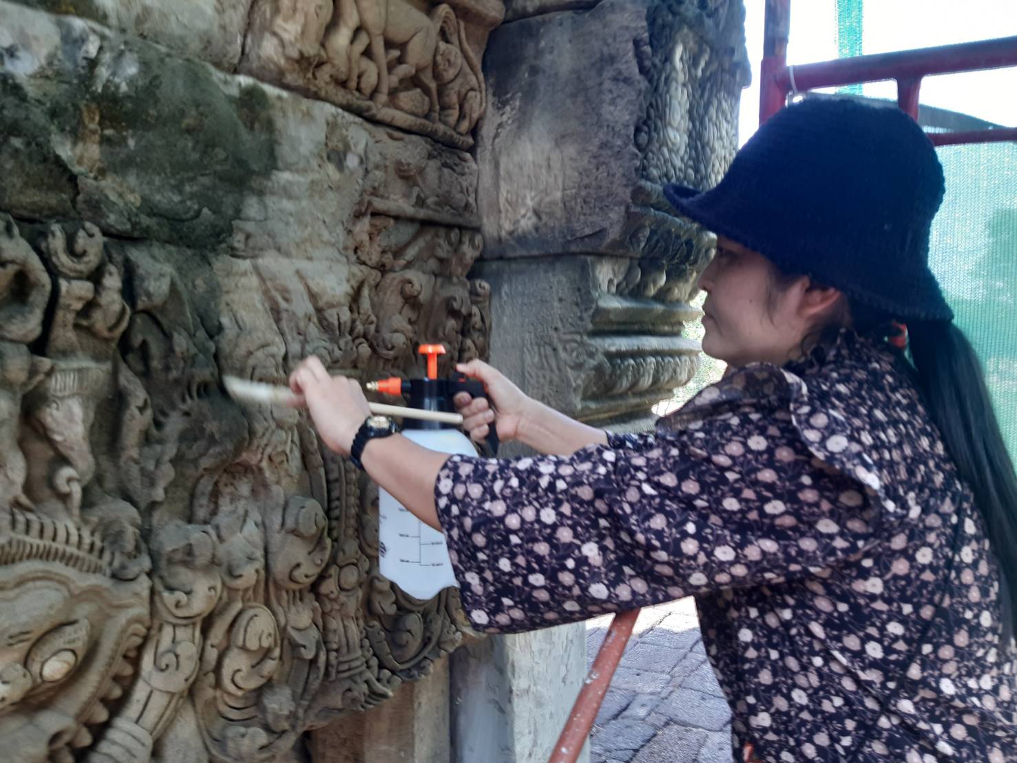 - ดำเนินการดูดเกลือด้วยเยื่อกระดาษบริสุทธิ์ Cellolose power บริเวณที่มีค่าเกลือเข้มข้น บนหน้าบันและทับหลังทิศใต้ และทิศเหนือ