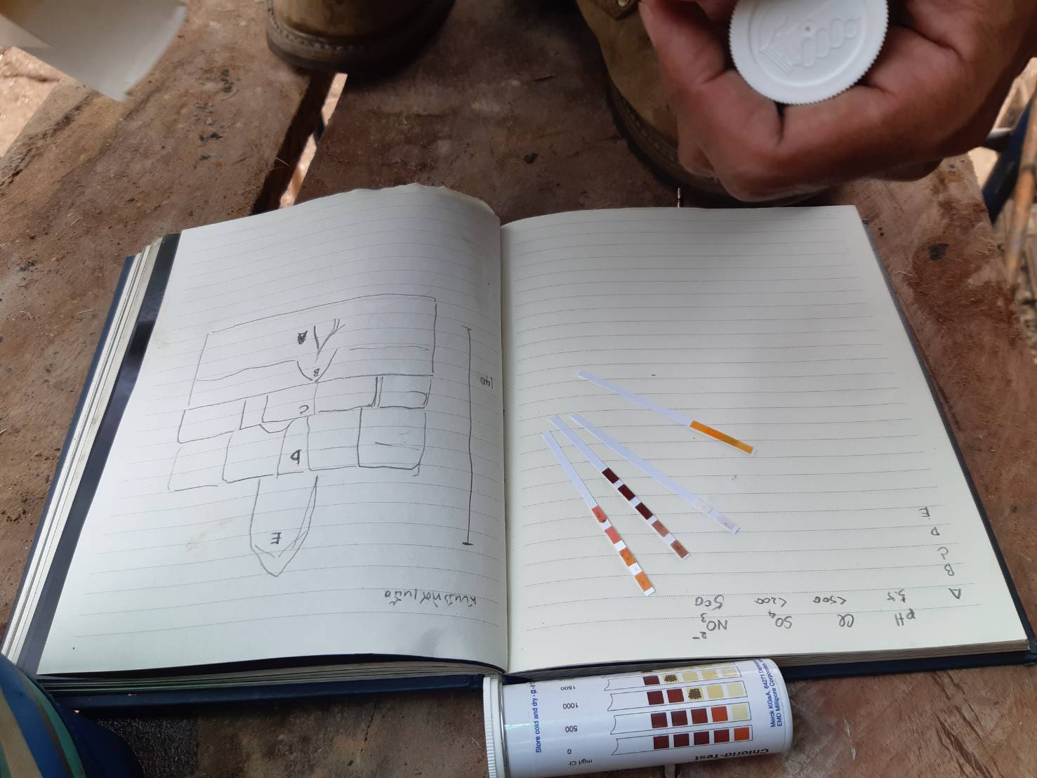 - ดำเนินการทดสอบค่าเกลือที่ละลายน้ำได้ ๔ ชนิด โดยแตะทดสอบบนเยื่อกระดาษบริสุทธิ์ที่ใช้ทำการดูดเกลือ จำนวน ๕ จุด ทิศเหนือ และทิศใต้