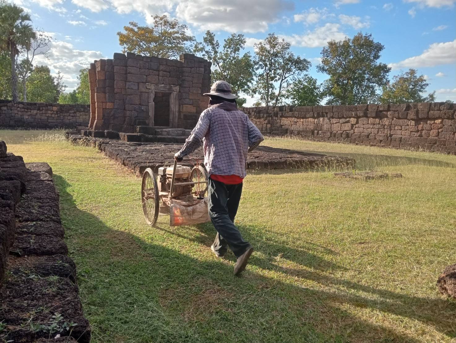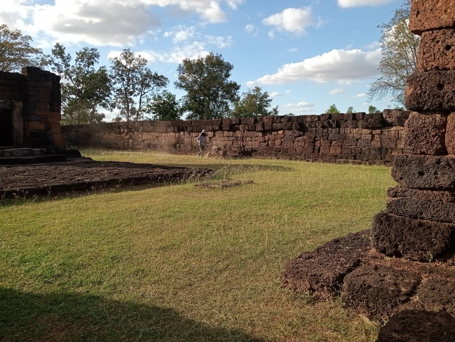 การดำเนินงานถากถางกำจัดวัชพืชโบราณสถานปราสาทช่างปี่ ตำบลช่างปี่ อำเภอศีขรภูมิ จังหวัดสุรินทร์ ในวันจันทร์ที่ ๑๘ ธันวาคม ๒๕๖๖