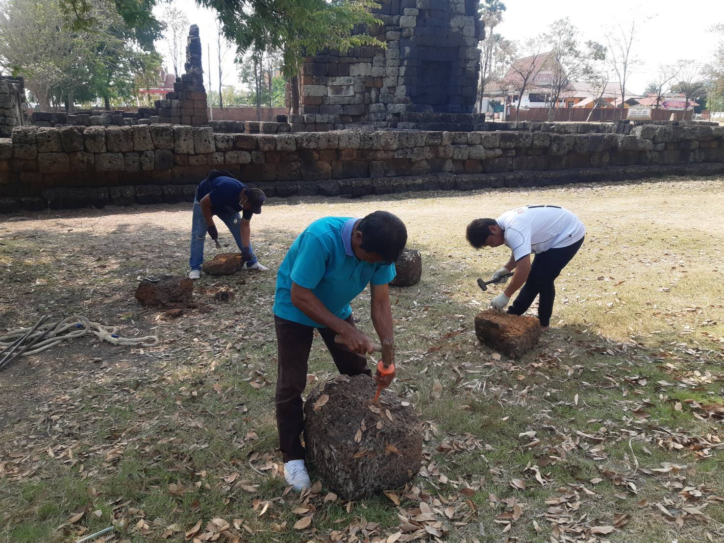 - ดำเนินการสกัดศิลาแลงให้ได้ขนาดที่ลงตัวพอดีกับพื้นที่ว่างของฐานปราสาทประธาน