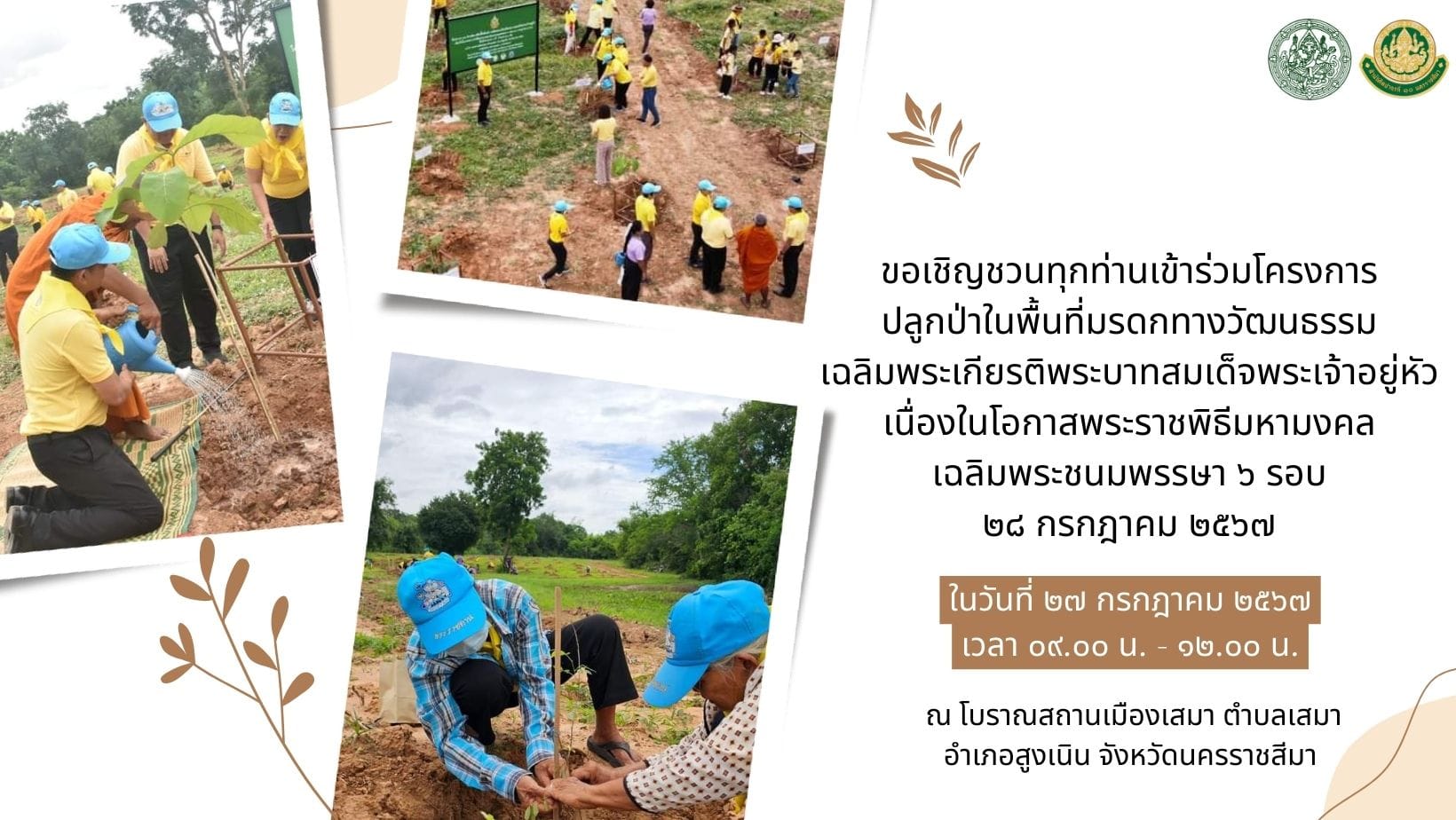 ขอเชิญชวนทุกท่านเข้าร่วมโครงการปลูกป่าในพื้นที่มรดกทางวัฒนธรรม เฉลิมพระเกียรติพระบาทสมเด็จพระเจ้าอยู่หัว เนื่องในโอกาสพระราชพิธีมหามงคลเฉลิมพระชนมพรรษา ๖ รอบ ๒๘ กรกฎาคม ๒๕๖๗
