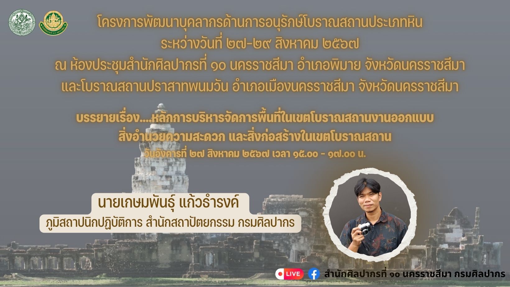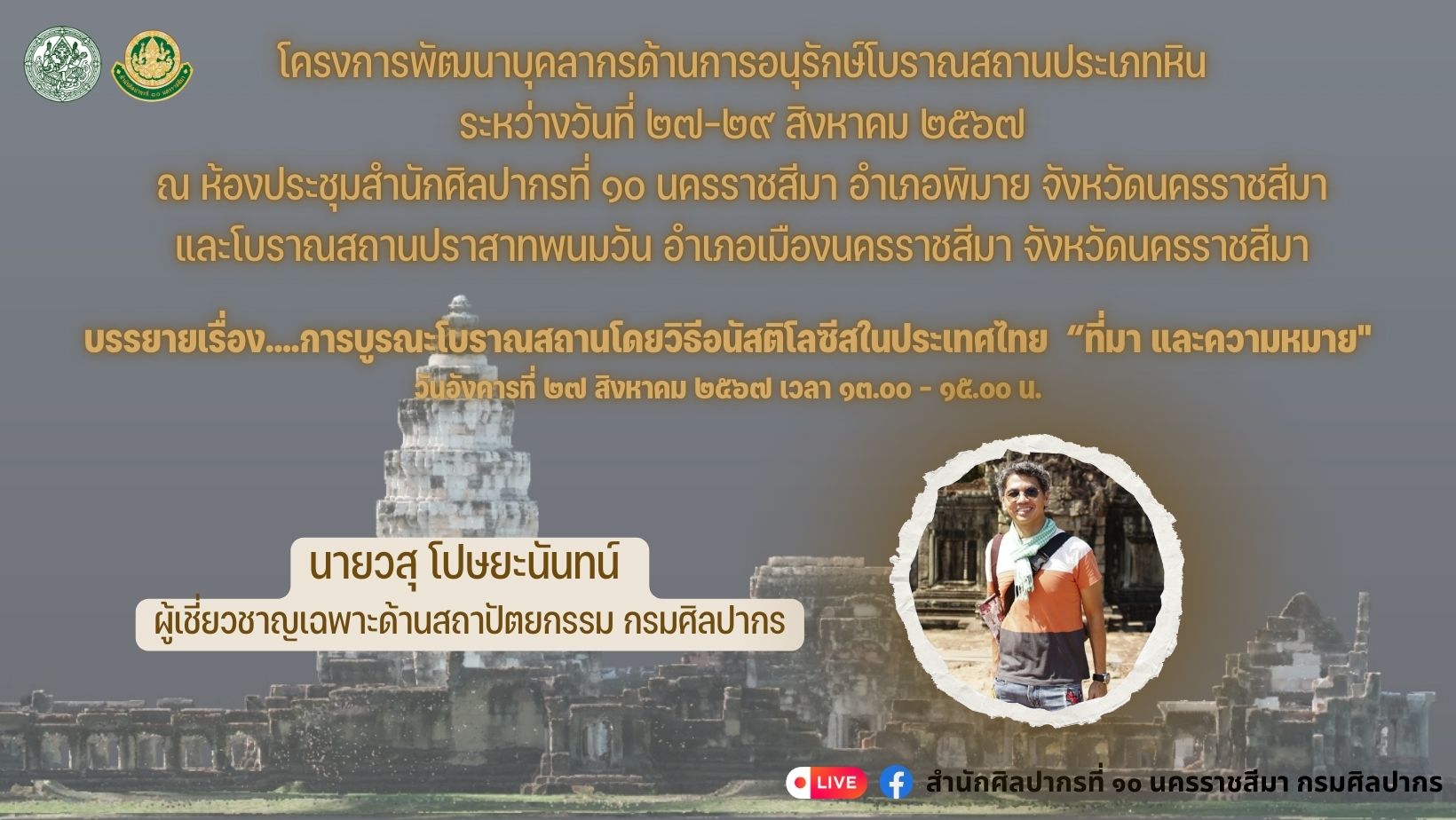 สำนักศิลปากรที่ ๑๐ นครราชสีมา ขอเชิญรับชม Facebook Live โครงการพัฒนาบุคลากรด้านการอนุรักษ์โบราณสถานประเภทหิน ในวันอังคารที่ ๒๗ สิงหาคม ๒๕๖๗