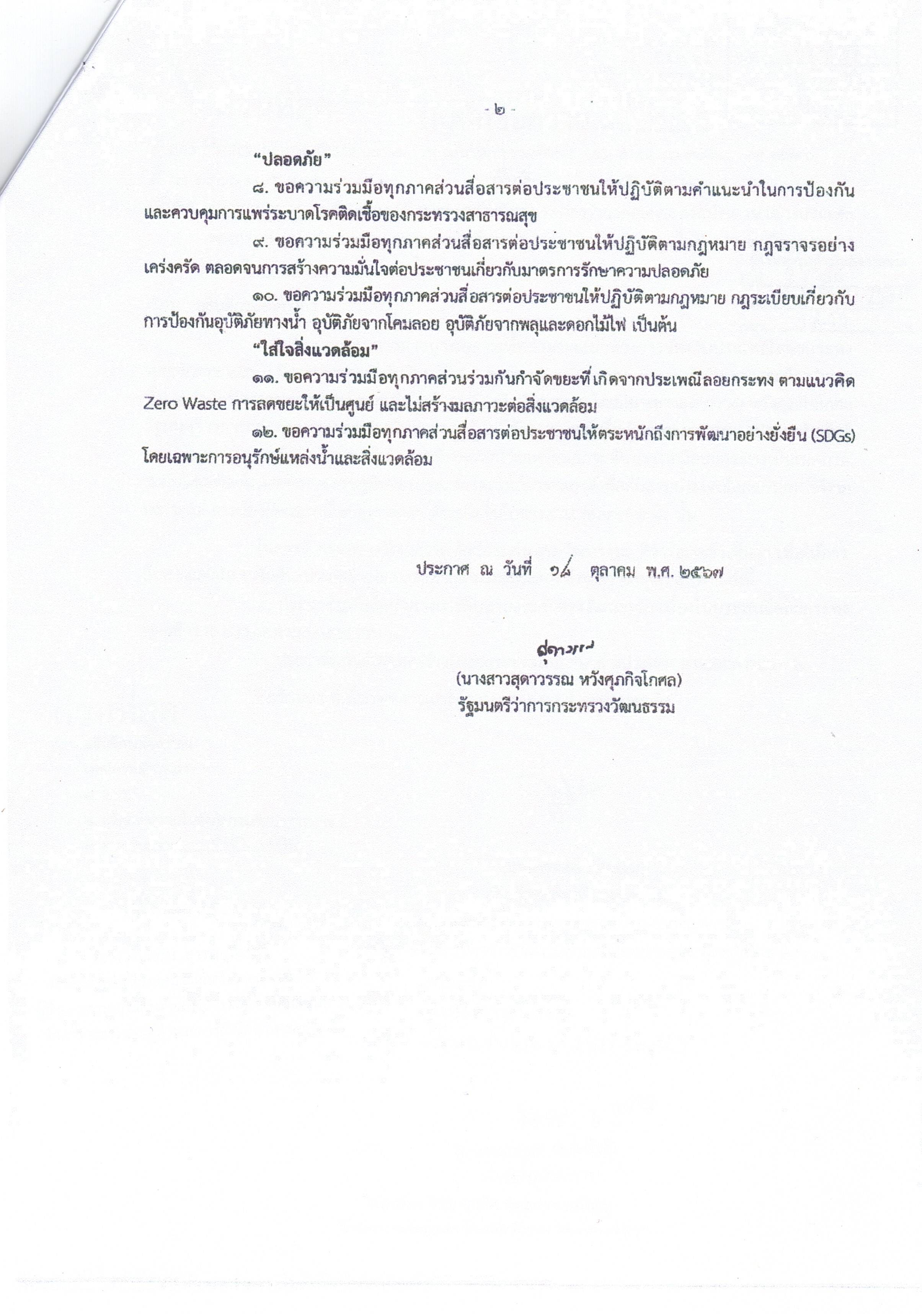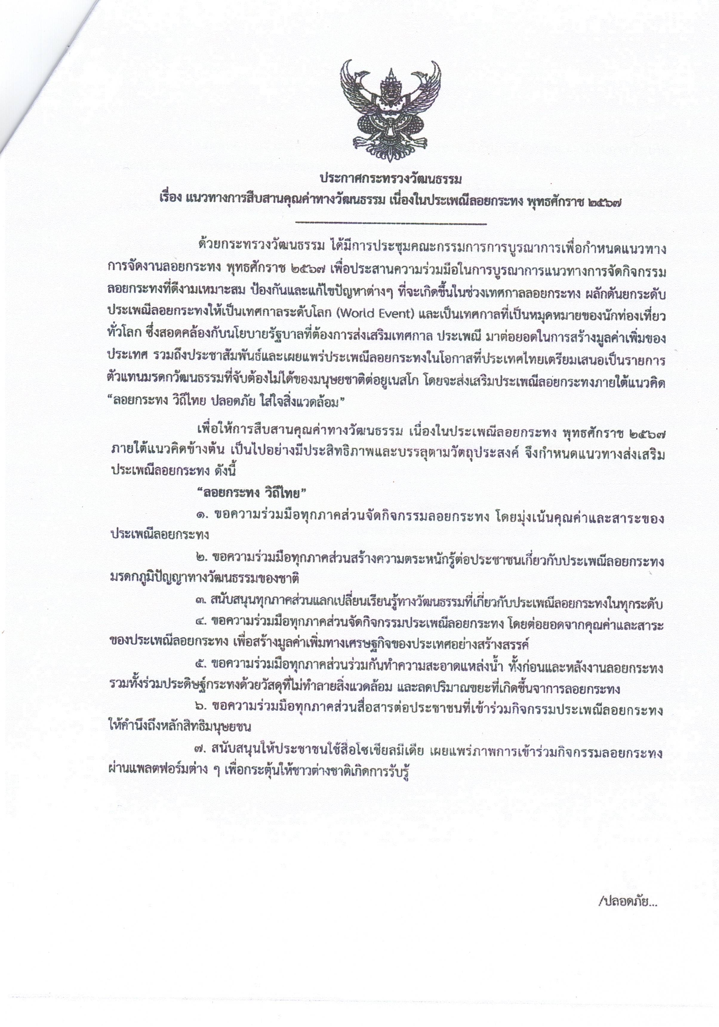 ประกาศกระทรวงวัฒนธรรม เรื่อง แนวทางการสืบสานคุณค่าทางวัฒนธรรม เนื่องในประเพณีลอยกระทง พุทธศักราช ๒๕๖๗