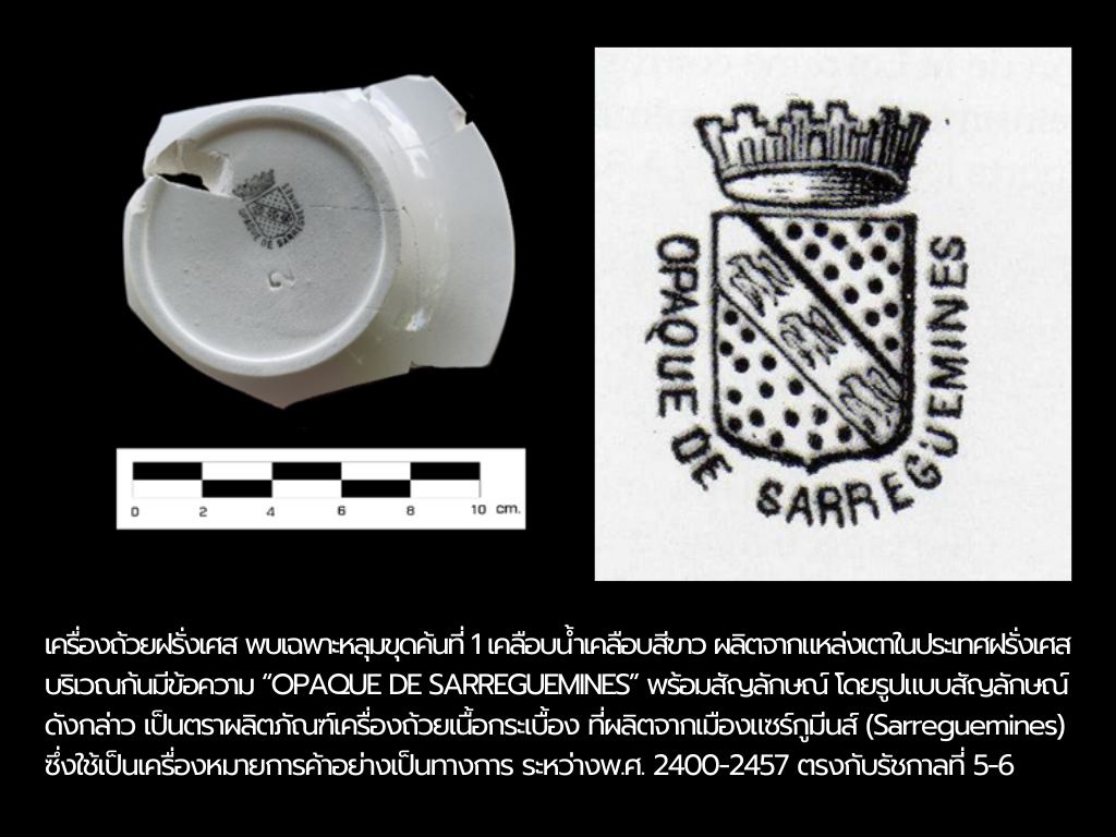 3. เครื่องถ้วยฝรั่งเศส เคลือบน้ำเคลือบสีขาว ผลิตจากแหล่งเตาในประเทศฝรั่งเศส บริเวณก้นมีข้อความ “OPAQUE DE SARREGUEMINES” พร้อมสัญลักษณ์ โดย รูปแบบสัญลักษณ์ดังกล่าว เป็นตราผลิตภัณฑ์เครื่องถ้วยเนื้อกระเบื้อง ที่ผลิตจากเมืองแซร์กูมีนส์ (Sarreguemines) ซึ่งใช้เป็นเครื่องหมายการค้าอย่างเป็นทางการ ระหว่าง พ.ศ. 2400-2457 ตรงกับรัชกาลที่ 5-6