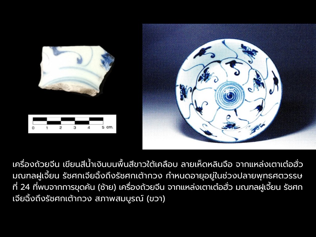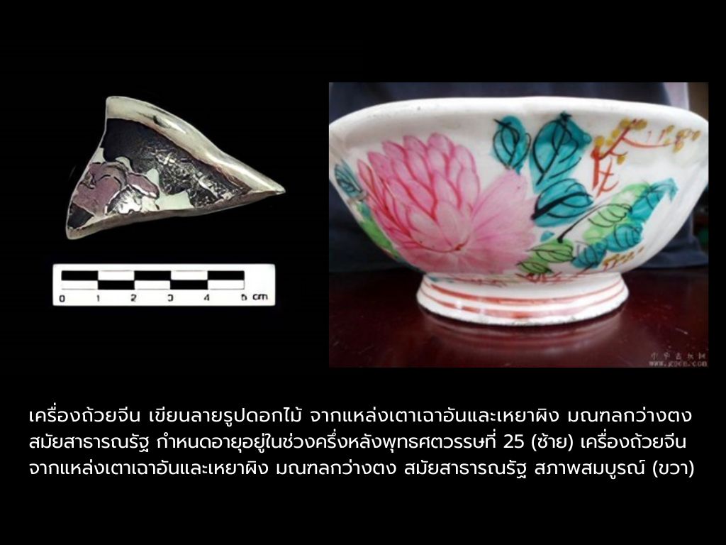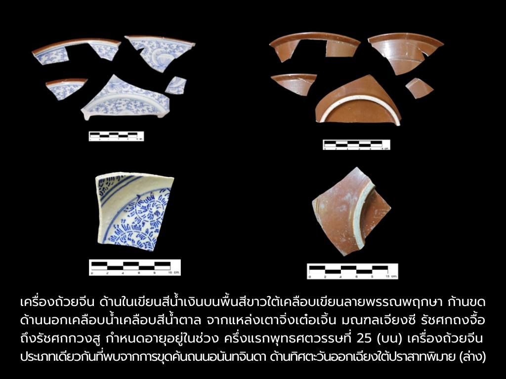 1. เครื่องถ้วยจีน โดยภาชนะทั้งหมดสามารถกำหนดอายุอยู่ในช่วง ปลายพุทธศตวรรษที่ 24-25 จากการวิเคราะห์ลวดลายและเทคนิคที่พบ ได้จัดจำแนกเครื่องถ้วยจีน ที่พบจากแหล่งเตาชิงจี แหล่งเตาจิ่งเต๋อเจิ้น และแหล่งเตาเฉาอันและเหยาผิง รวมทั้งสิ้น 3 กลุ่ม