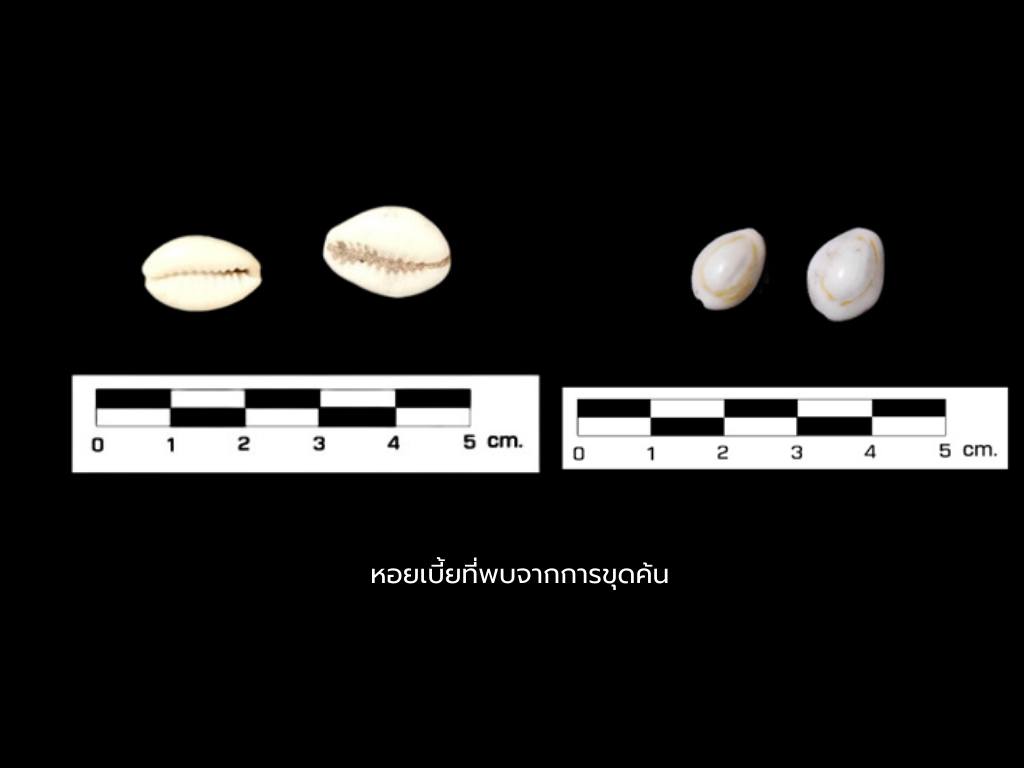 5. หอยเบี้ย จำนวน 2 สำหรับหอยเบี้ยมีการใช้เป็นเงินตราแลกเปลี่ยนมาตั้งแต่สมัยสุโขทัย อยุธยา ธนบุรี ถึง สมัยรัตนโกสินทร์ จนกระทั่งใน พ.ศ. 2405 มีประกาศยกเลิกใช้หอยเบี้ย แล้วประกาศใช้เงินตราประเภท อัฐ โสฬส ซึ่งล้นเกล้ารัชกาลที่ 5 โปรดเกล้าฯ ให้จัดทำระบบแลกเปลี่ยนเงินตราขึ้นใหม่ ซึ่งใน พ.ศ. 2405 นั้นโรงกษาปณ์ได้ผลิตเหรียญดีบุกขึ้นเป็นครั้งแรก โดยหอยเบี้ยทั้ง 2 ชิ้น พบร่วมกับเครื่องถ้วยจีน จากแหล่งเตาจิ่งเต๋อเจิ้น ผู้เขียนจึงกำหนดอายุอยู่ในช่วงครึ่งแรกพุทธศตวรรษที่ 25