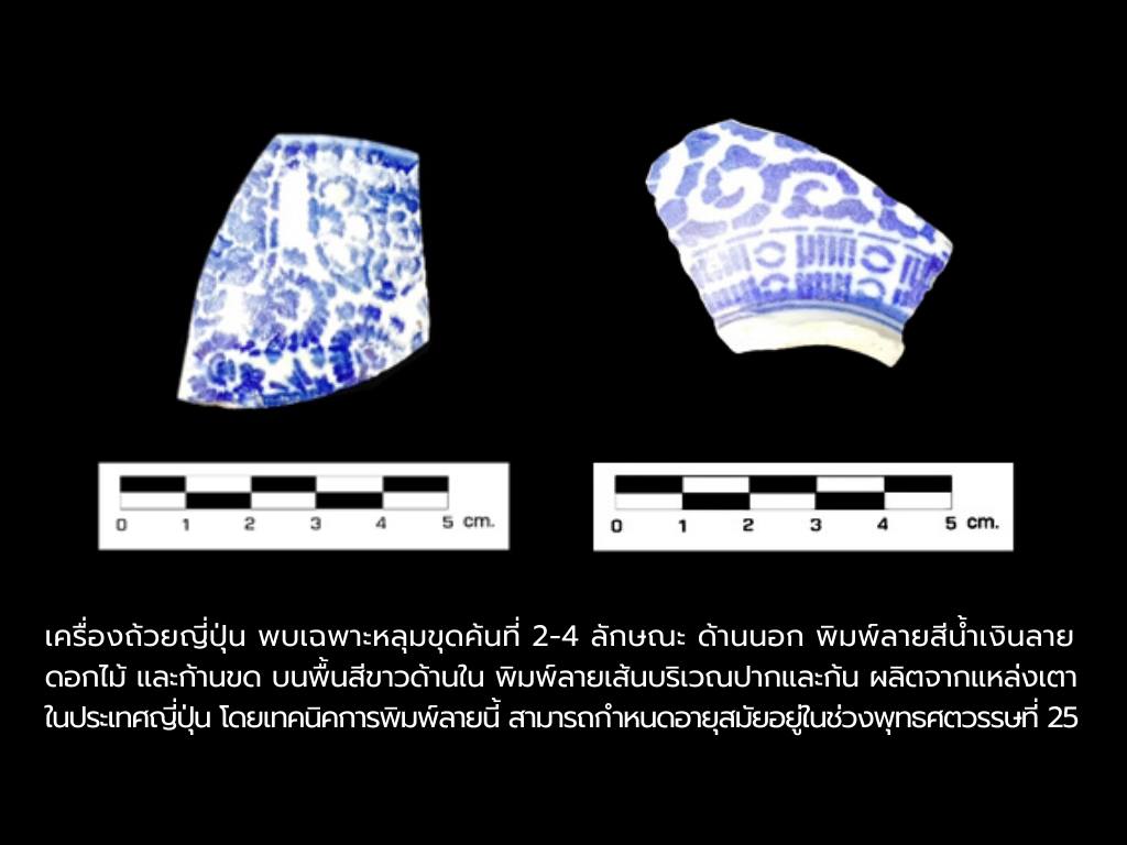 2. เครื่องถ้วยญี่ปุ่น พิมพ์ลายสีน้ำเงินลายดอกไม้ และก้านขด บนพื้นสีขาวด้านใน พิมพ์ลายเส้นบริเวณปากและก้น ผลิตจากแหล่งเตาในประเทศญี่ปุ่น โดยเทคนิคการพิมพ์ลายนี้ สามารถกำหนดอายุสมัยอยู่ในช่วงพุทธศตวรรษที่ 25