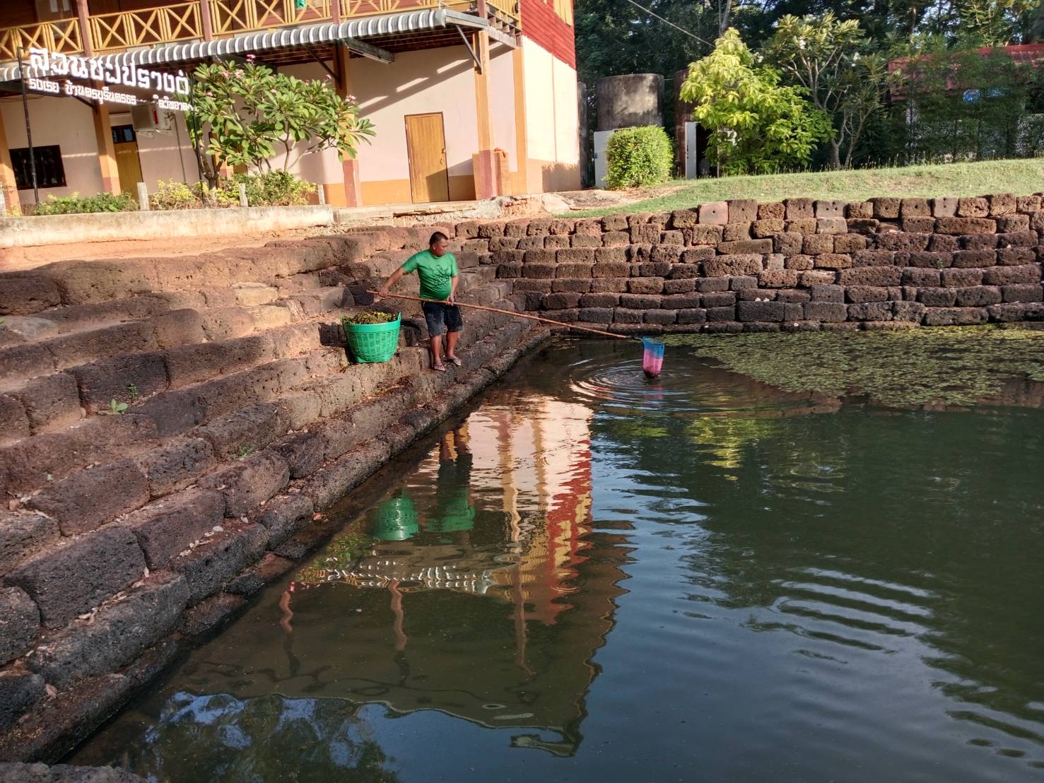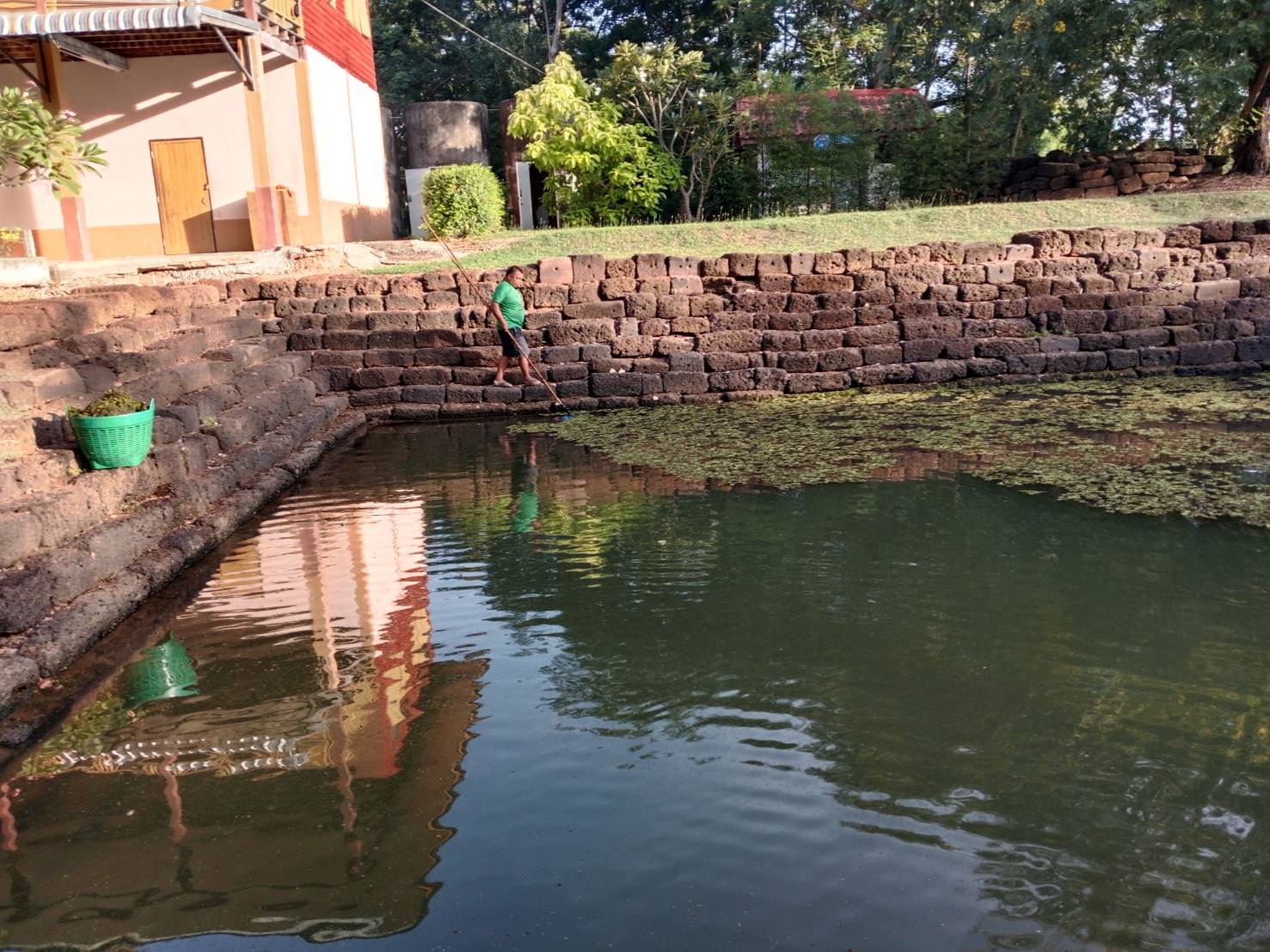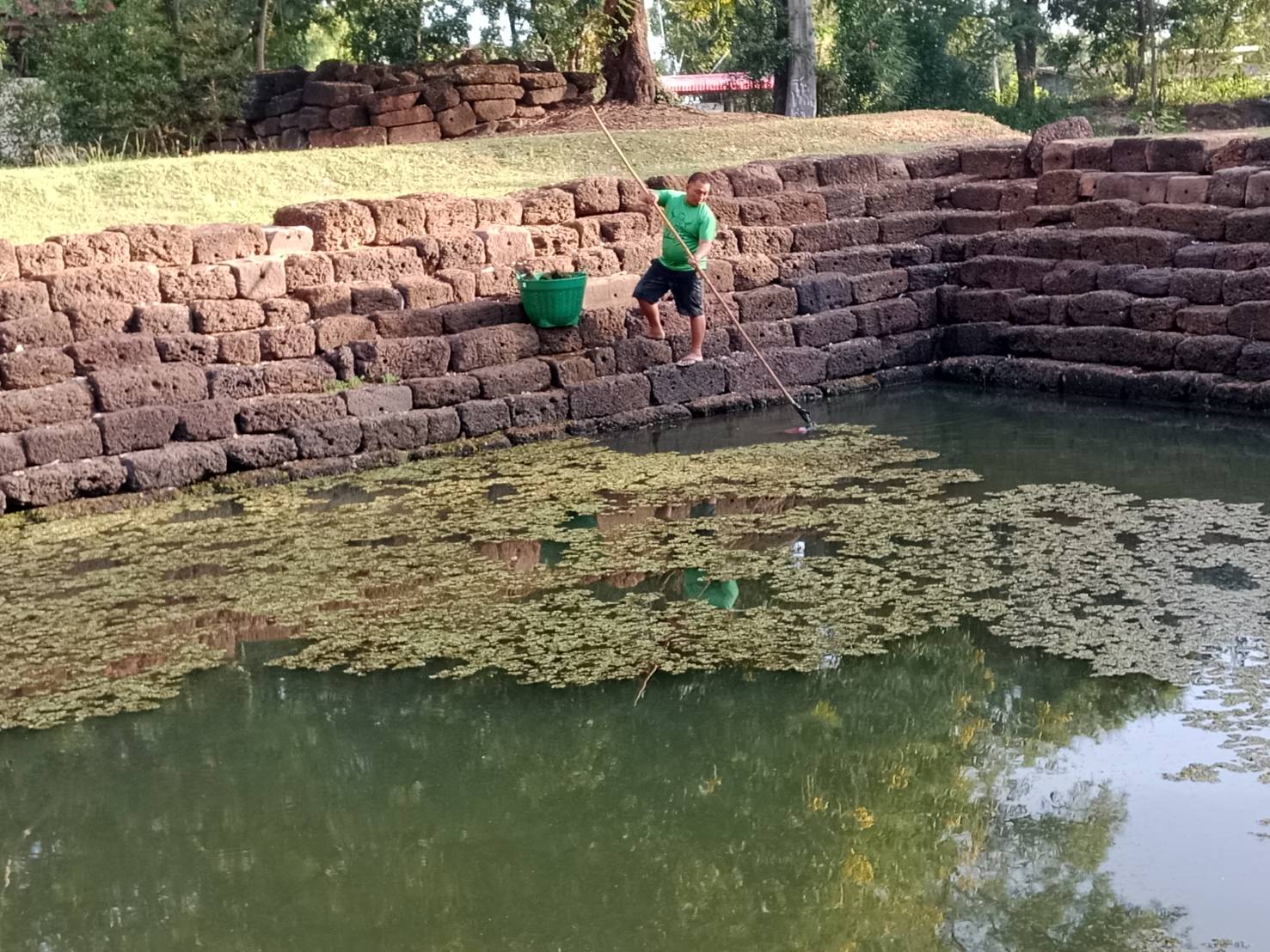 พนักงานดูแลรักษาโบราณสถาน ดำเนินงานกำจัดวัชพืชภายในสระน้ำโบราณปรางค์ครบุรี อำเภอครบุรี จังหวัดนครราชสีมา