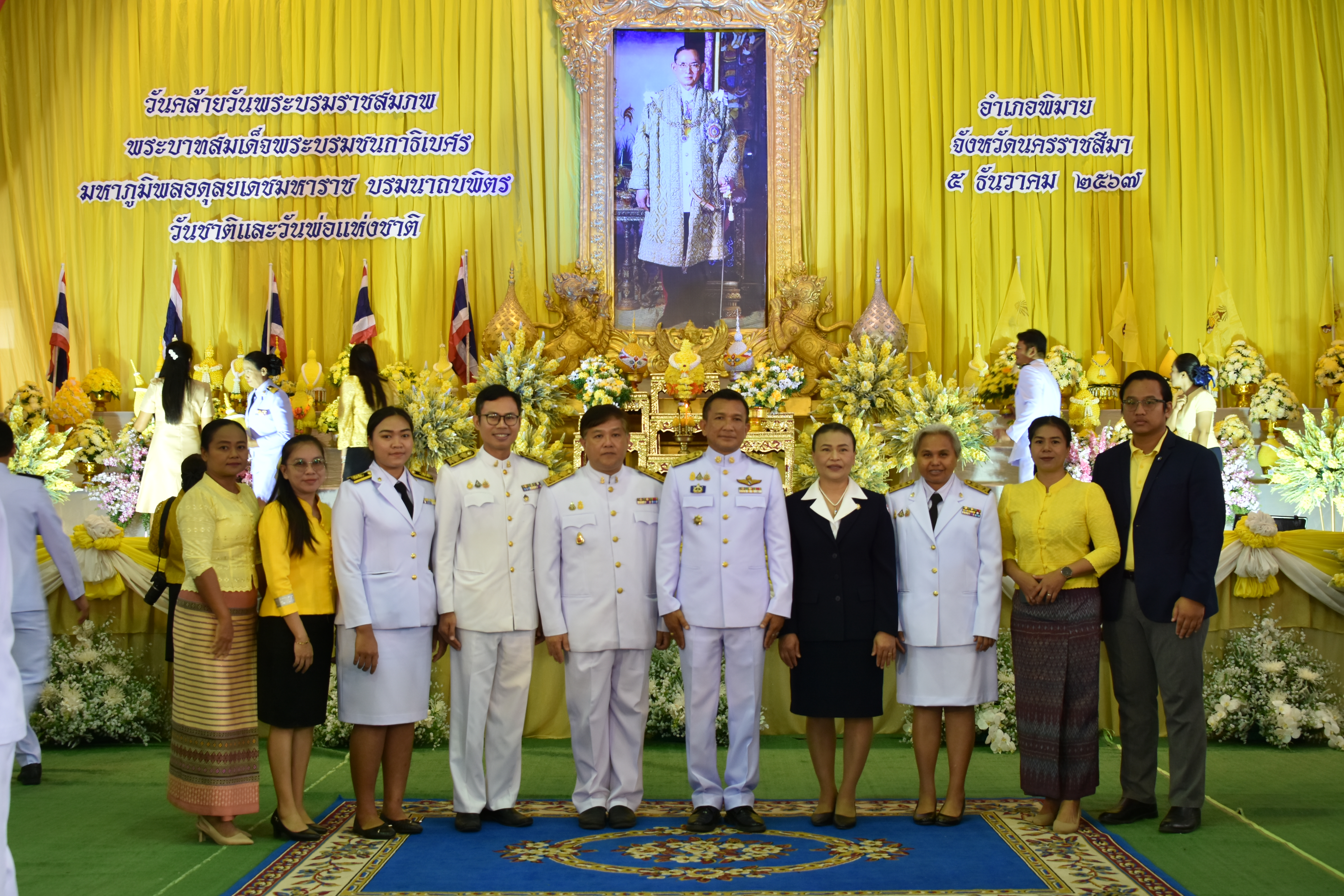 วันพฤหัสบดีที่ ๕ ธันวาคม ๒๕๖๗ นายทศพร ศรีสมาน ผู้อำนวยการสำนักศิลปากรที่ ๑๐ นครราชสีมา พร้อมด้วยหัวหน้าหน่วยงานในพื้นที่ ข้าราชการและเจ้าหน้าที่สำนักศิลปากรที่ ๑๐ นครราชสีมา กรมศิลปากร เข้าร่วมพิธีทำบุญตักบาตร พิธีถวายพานพุ่มดอกไม้ เนื่องในวันคล้ายวันพระบรมราชสมภพของพระบาทสมเด็จพระบรมชนกาธิเบศร มหาภูมิพลอดุลยเดชมหาราช บรมนาถบพิตร วันชาติ และวันพ่อแห่งชาติ ประจำปี ๒๕๖๗ ณ ที่ว่าการอำเภอพิมาย จังหวัดนครราชสีมา