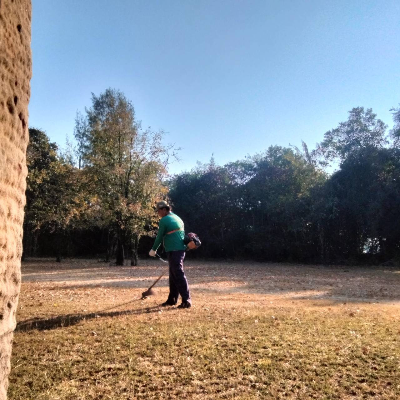 การดำเนินงานถากถางกำจัดวัชพืชและทำความสะอาดพื้นที่โดยรอบโบราณสถานปราสาทเมืองเก่า ตำบลโคราช อำเภอสูงเนิน จังหวัดนครราชสีมา ในวันพฤหัสบดีที่ ๑๙ ธันวาคม ๒๕๖๗
