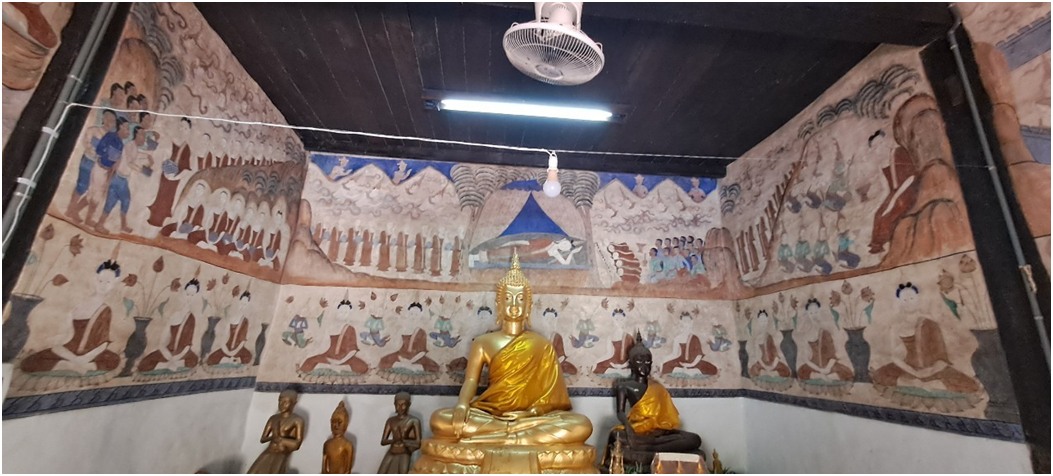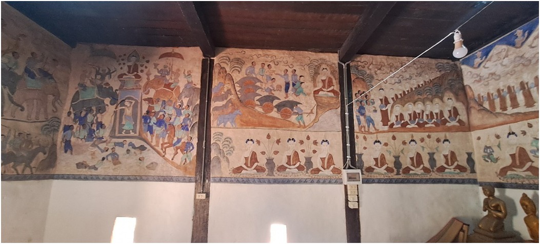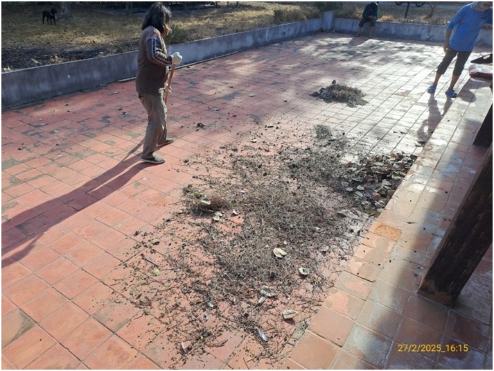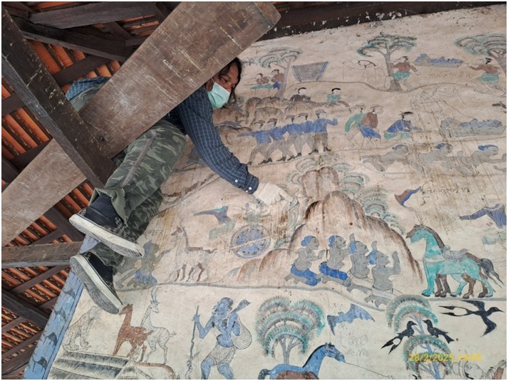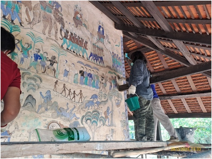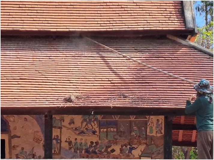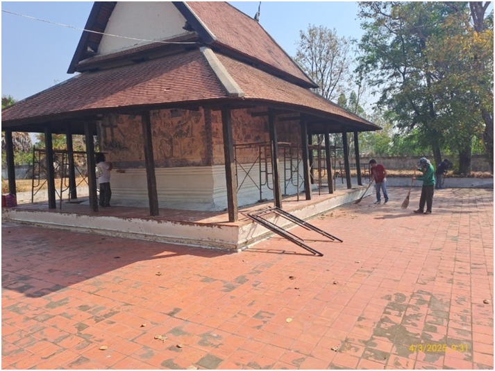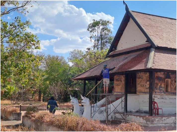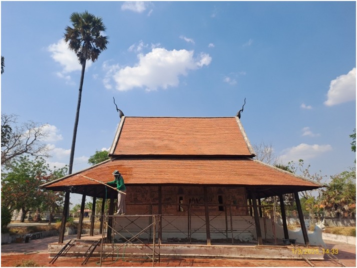 ดำเนินงานทำความสะอาดและกำจัดสิ่งปฏิกูลบนภาพจิตรกรรมฝาผนังภายในและภายนอก อุโบสถวัดป่าเรไร ตำบลดงบัง อำเภอนาดูน จังหวัดมหาสารคาม