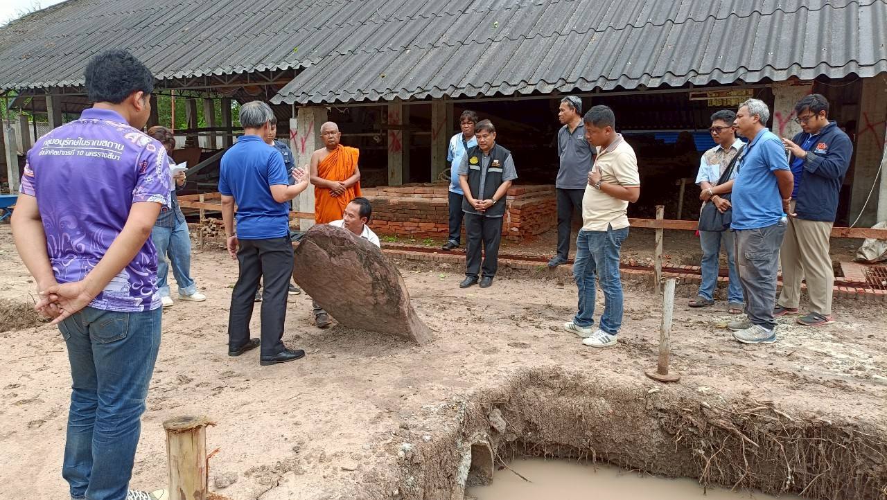 วันศุกร์ที่ 18 เมษายน 2568 นายกิตติพันธ์ พานสุวรรณ ที่ปรึกษาอธิบดีกรมศิลปากร (ด้านการบูรณะโบราณสถานและวิศวกรรม) พร้อมด้วย นายเสน่ห์ มหาผล ผู้เชี่ยวชาญเฉพาะด้านวิทยาศาสตร์ (วิทยาศาสตร์การอนุรักษ์) นายทศพร ศรีสมาน ผู้อำนวยการสำนักศิลปากรที่ 10 นครราชสีมา และผู้ที่เกี่ยวข้อง ลงพื้นที่เพื่อติดตามความคืบหน้าพร้อมทั้งให้คำแนะนำในการดำเนินงานโครงการอนุรักษ์และพัฒนาโบราณสถานพระนอน วัดธรรมจักรเสมาราม ตำบลเสมา อำเภอสูงเนิน จังหวัดนครราชสีมา