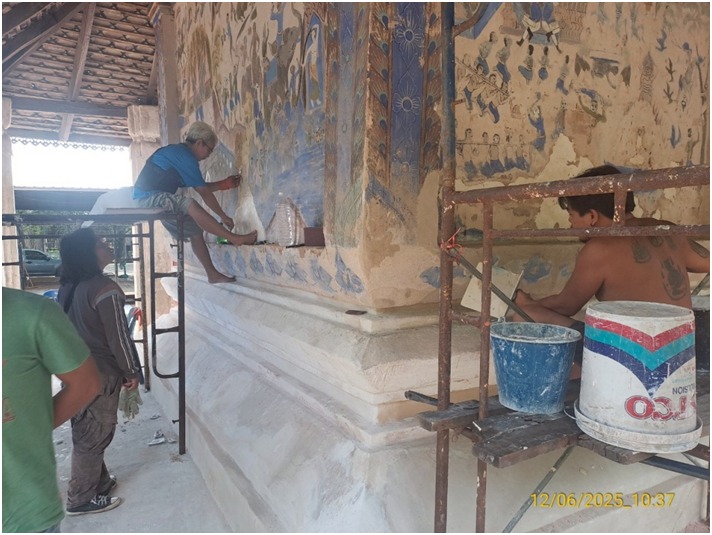 ความคืบหน้าการดำเนินงานโครงการอนุรักษ์จิตรกรรมภายในและภายนอกอุโบสถวัดท่าเรียบ ตำบลนาโพธิ์ อำเภอนาโพธิ์ จังหวัดบุรีรัมย์ โดยกลุ่มอนุรักษ์จิตรกรรมและประติมากรรม กองโบราณคดี กรมศิลปากร