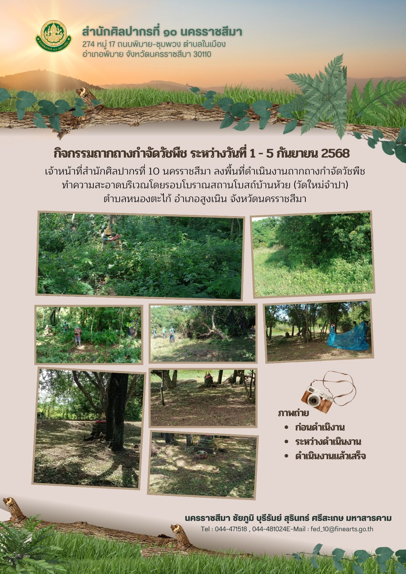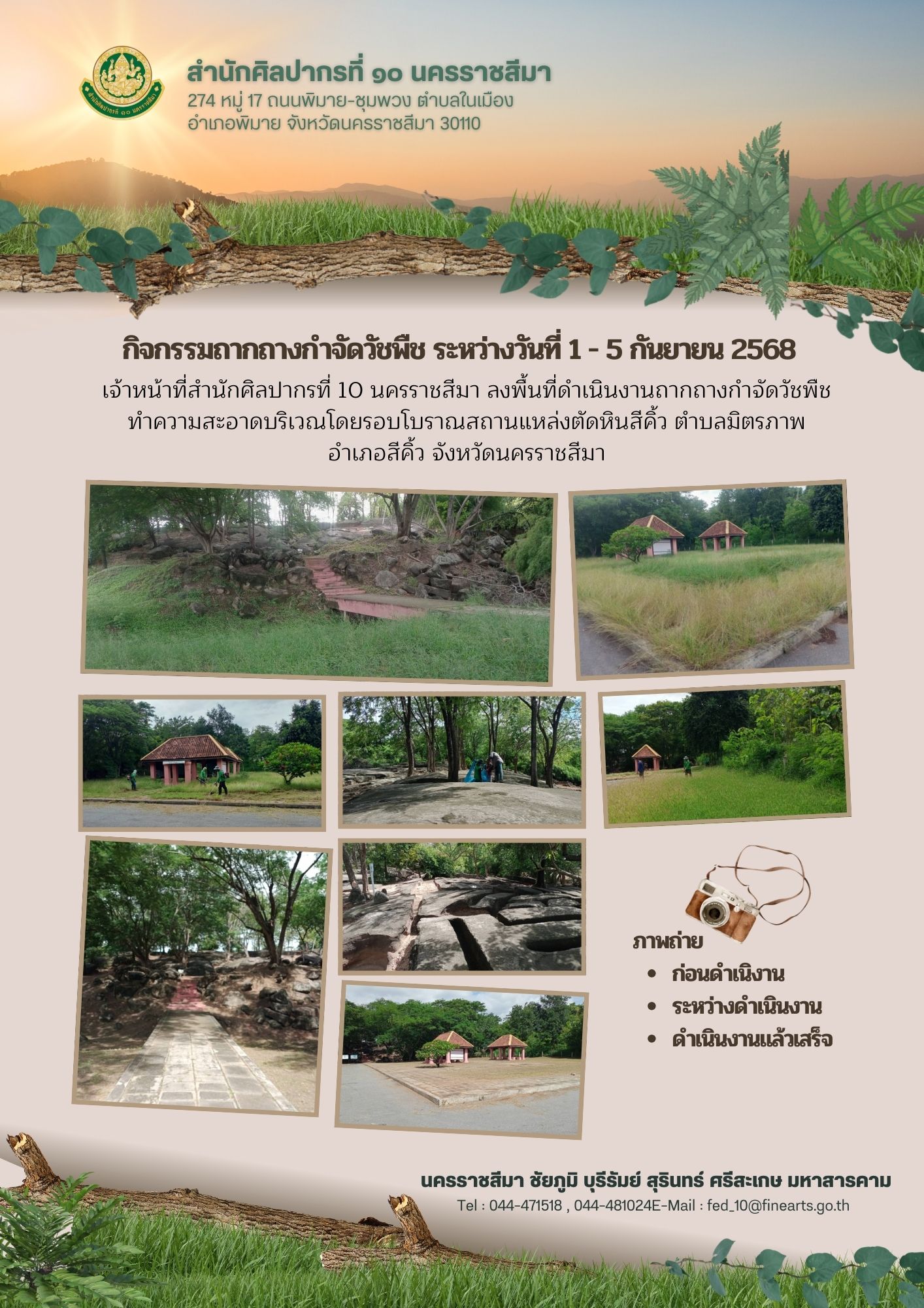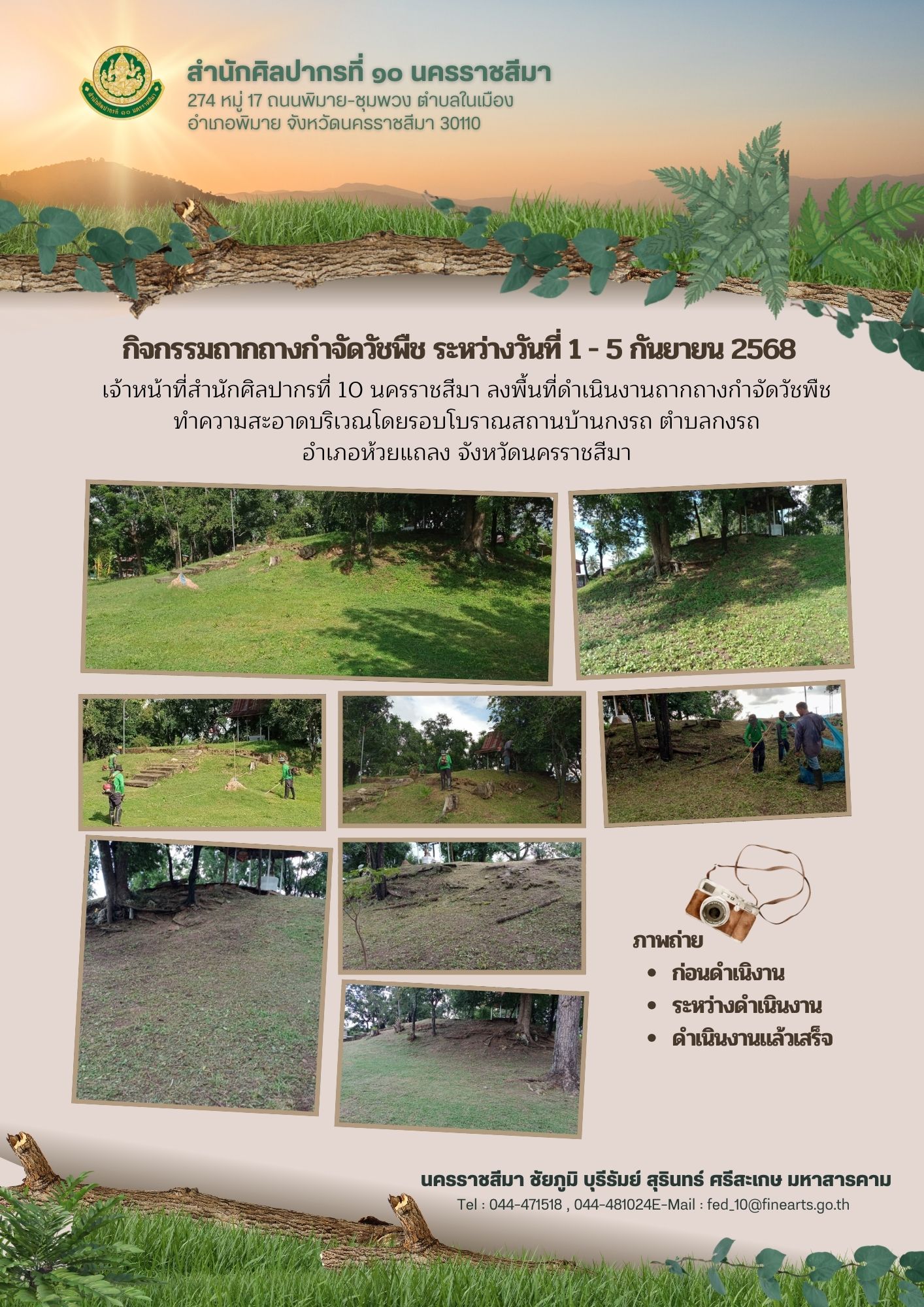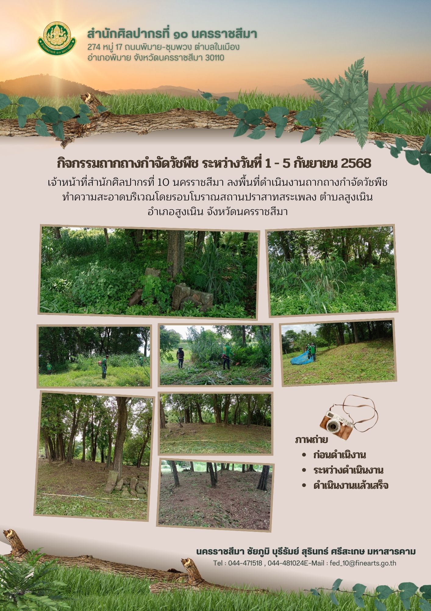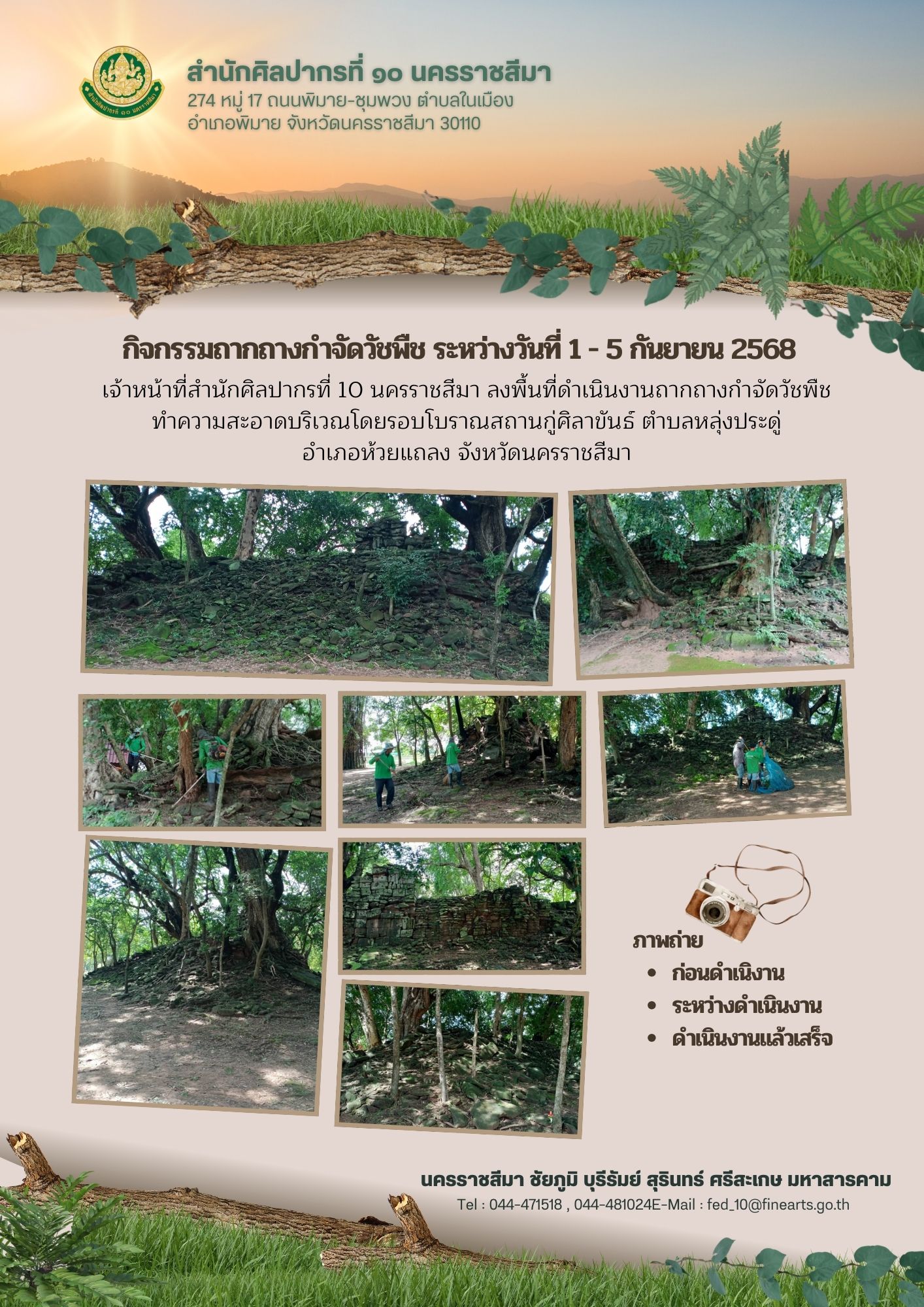 เจ้าหน้าที่สำนักศิลปากรที่ 10 นครราชสีมา ลงพื้นที่ดำเนินงานถากถางกำจัดวัชพืช ทำความสะอาดบริเวณโดยรอบโบราณสถาน ระหว่างวันที่ 1-5 กันยายน 2568