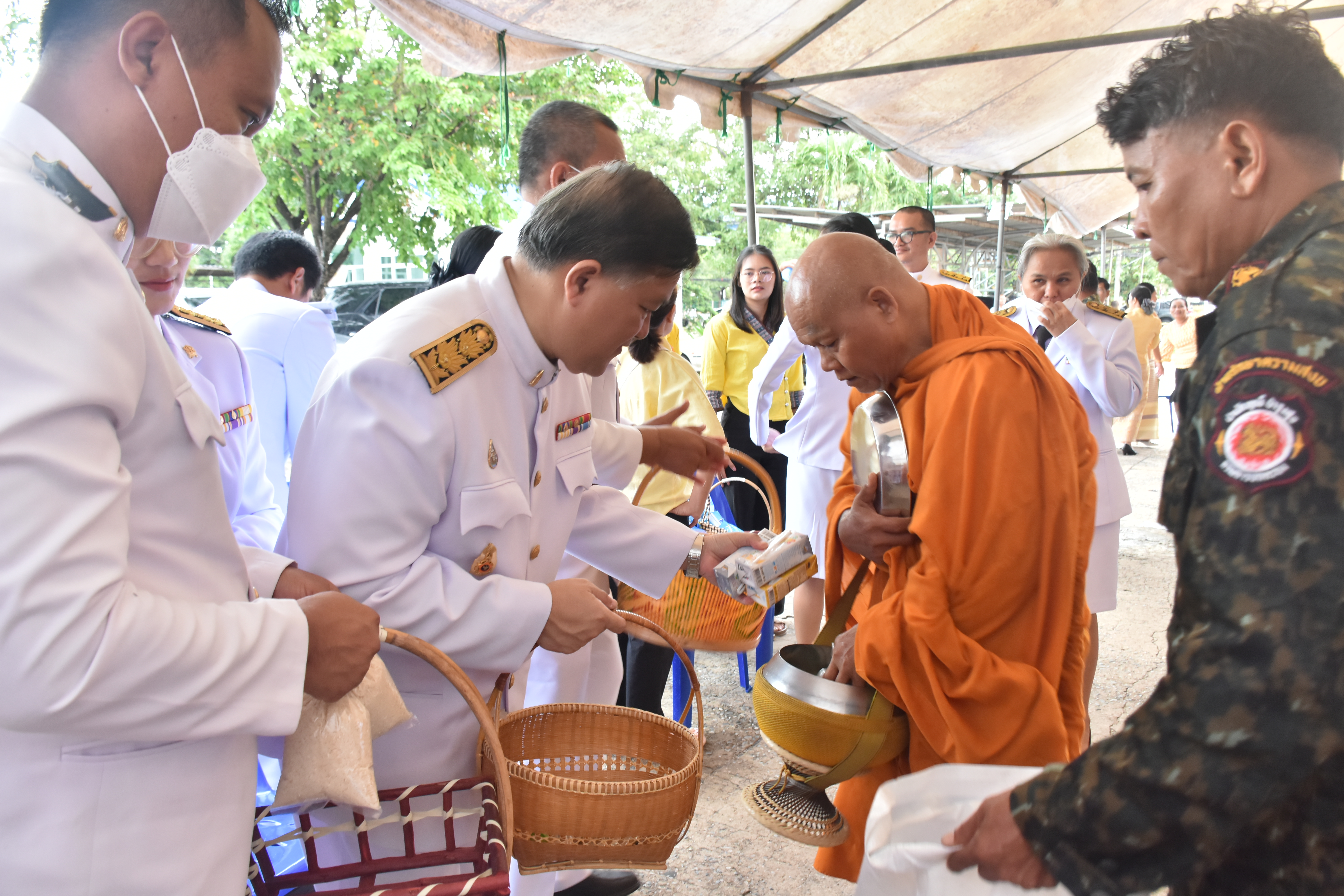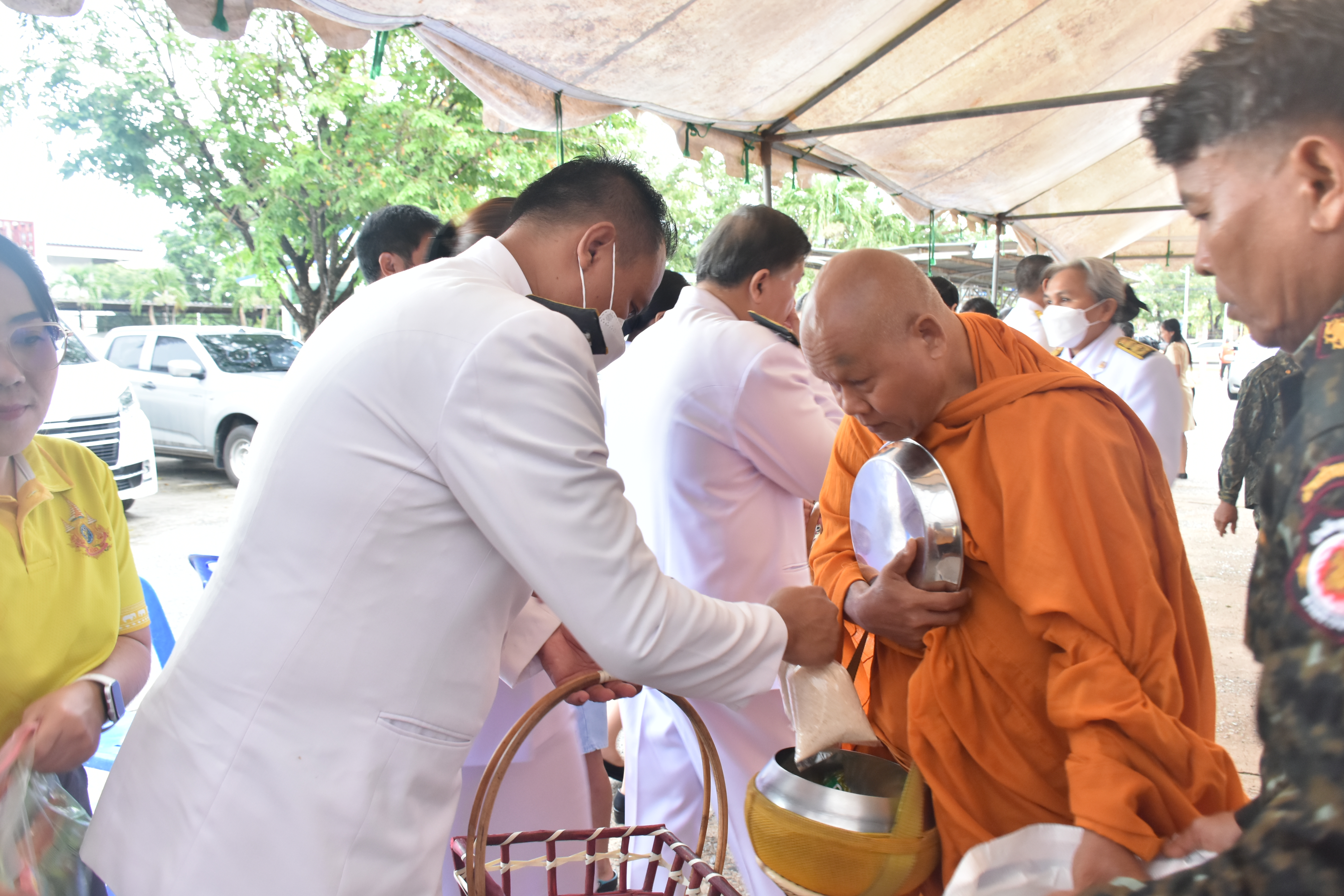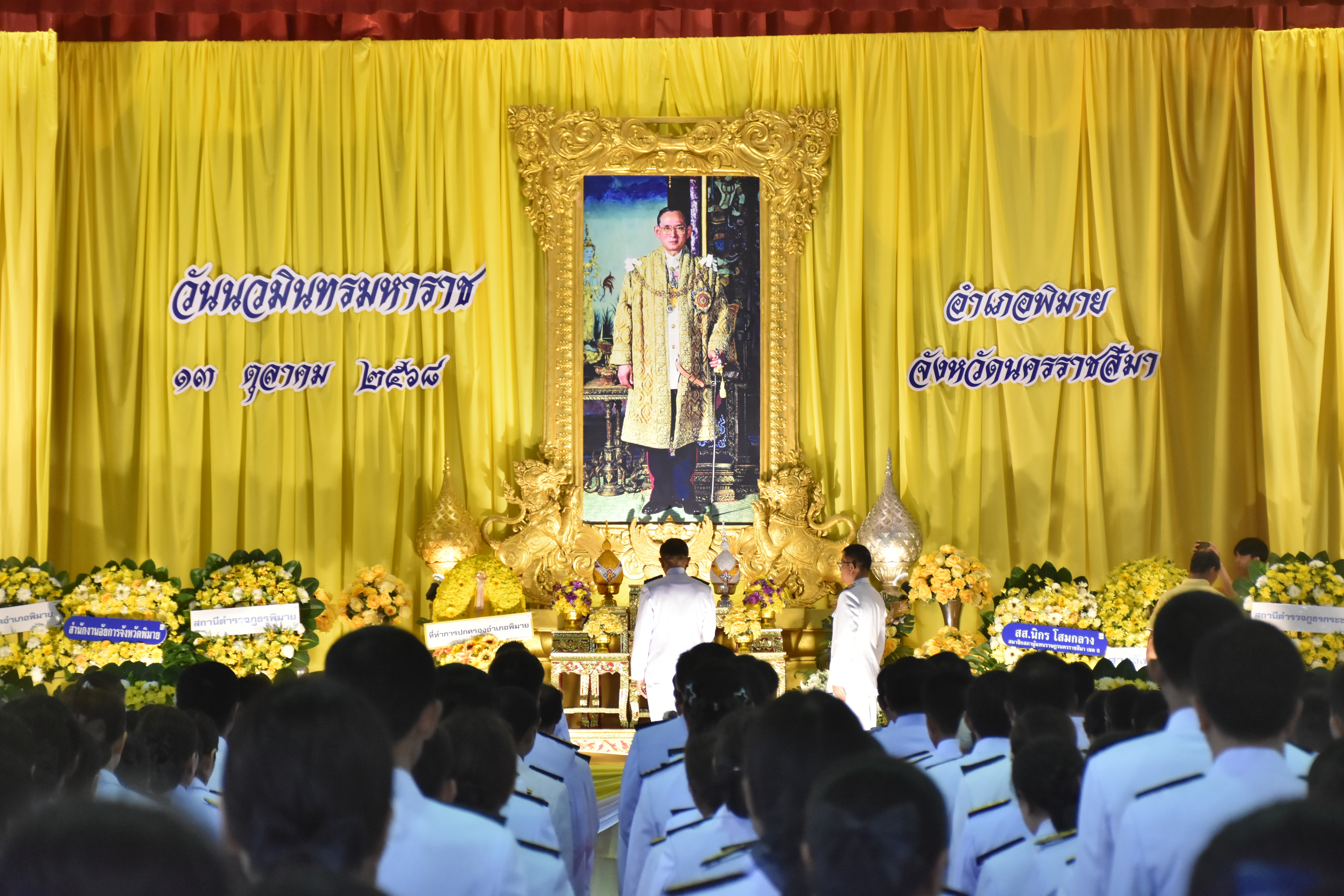 พิธีตักบาตรข้าวสารอาหารแห้ง และพิธีวางพวงมาลาเนื่องในวันนวมินทรมหาราช ณ หอประชุมที่ว่าการอำเภอพิมาย จังหวัดนครราชสีมา