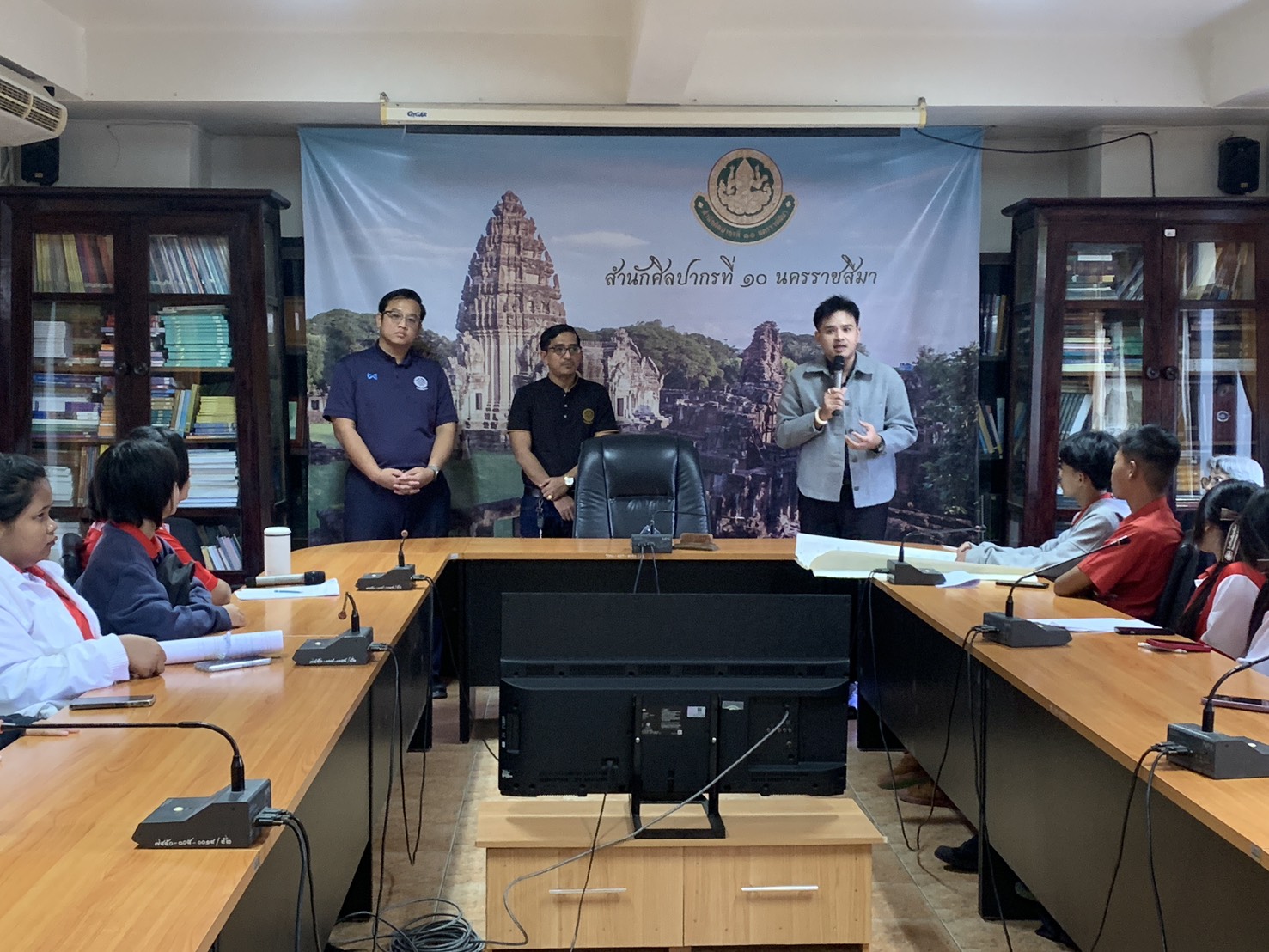 เมื่อวันที่ 20 พฤศจิกายน 2568 สำนักศิลปากรที่ 10 นครราชสีมา โดยกลุ่มโบราณคดีได้มอบหมายให้นายวีระชาติ พงค์ชนะ นักโบราณคดีชำนาญการและนายวรรณพงษ์ ปาละกะวงษ์ ณ อยุธยา นักโบราณคดีชำนาญการ เป็นวิทยากรบรรยายเรื่องความสำคัญ วิธีวิทยาและกระบวนการทำงานทางโบราณคดี ตลอดจนการจัดการหลักฐานทางโบราณคดีให้กับนักเรียนระดับชั้นมัธยมศึกษาปีที่ 4 (แผนการเรียนนิติรัฐ) จากโรงเรียนพิมายวิทยา พร้อมคณะครู จำนวน 40 คน