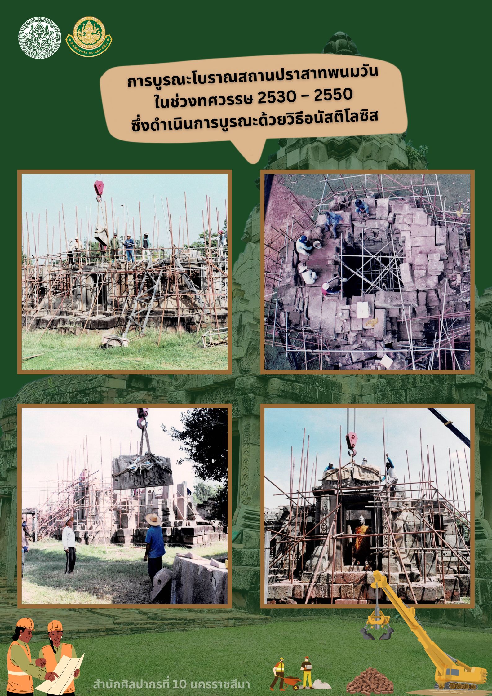 บรรยากาศการบูรณะโบราณสถานปราสาทพนมวัน ตำบลบ้านโพธิ์ อำเภอเมือง จังหวัดนครราชสีมา ในช่วงทศวรรษ 2530 – 2550 ซึ่งดำเนินการบูรณะด้วยวิธีอนัสติโลซิส ที่กรมศิลปากรควบคุม กำกับ ดูแล อีกทั้งปราสาทพนมวันแห่งนี้ ยังเป็นโรงเรียนสำหรับการบูรณะโบราณสถานประเภทหินของข้าราชการ เจ้าหน้าที่ของกรมศิลปากรอีกด้วย