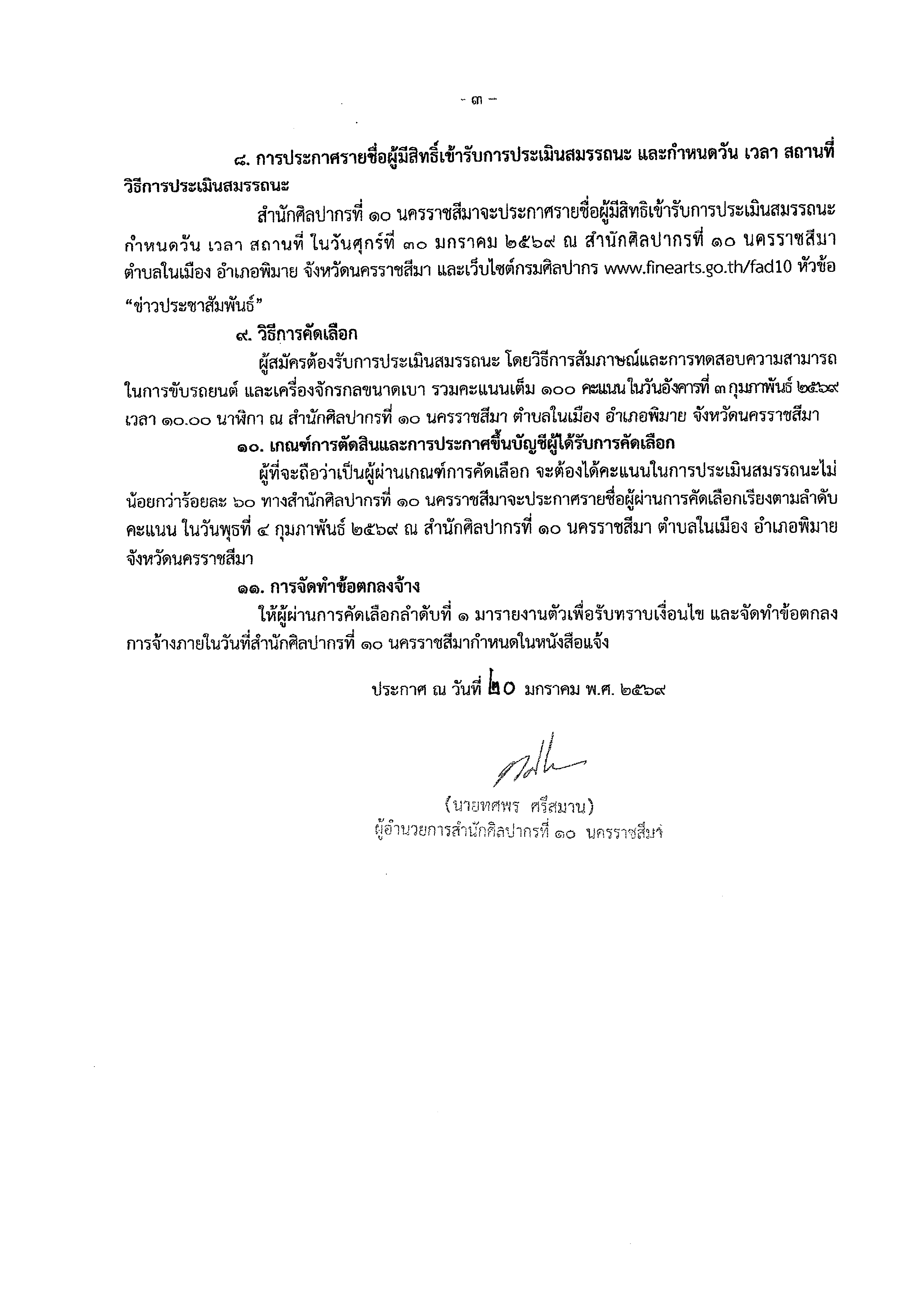 ประกาศสำนักศิลปากรที่ ๑๐ นครราชสีมา เรื่อง รับสมัครคัดเลือกบุคคลเพื่อจัดจ้างเป็นจ้างเหมาบริการปฏิบัติงานขับรถยนต์ ประจำสำนักศิลปากรที่ ๑๐ นครราชสีมา (จำนวน ๒ อัตรา)