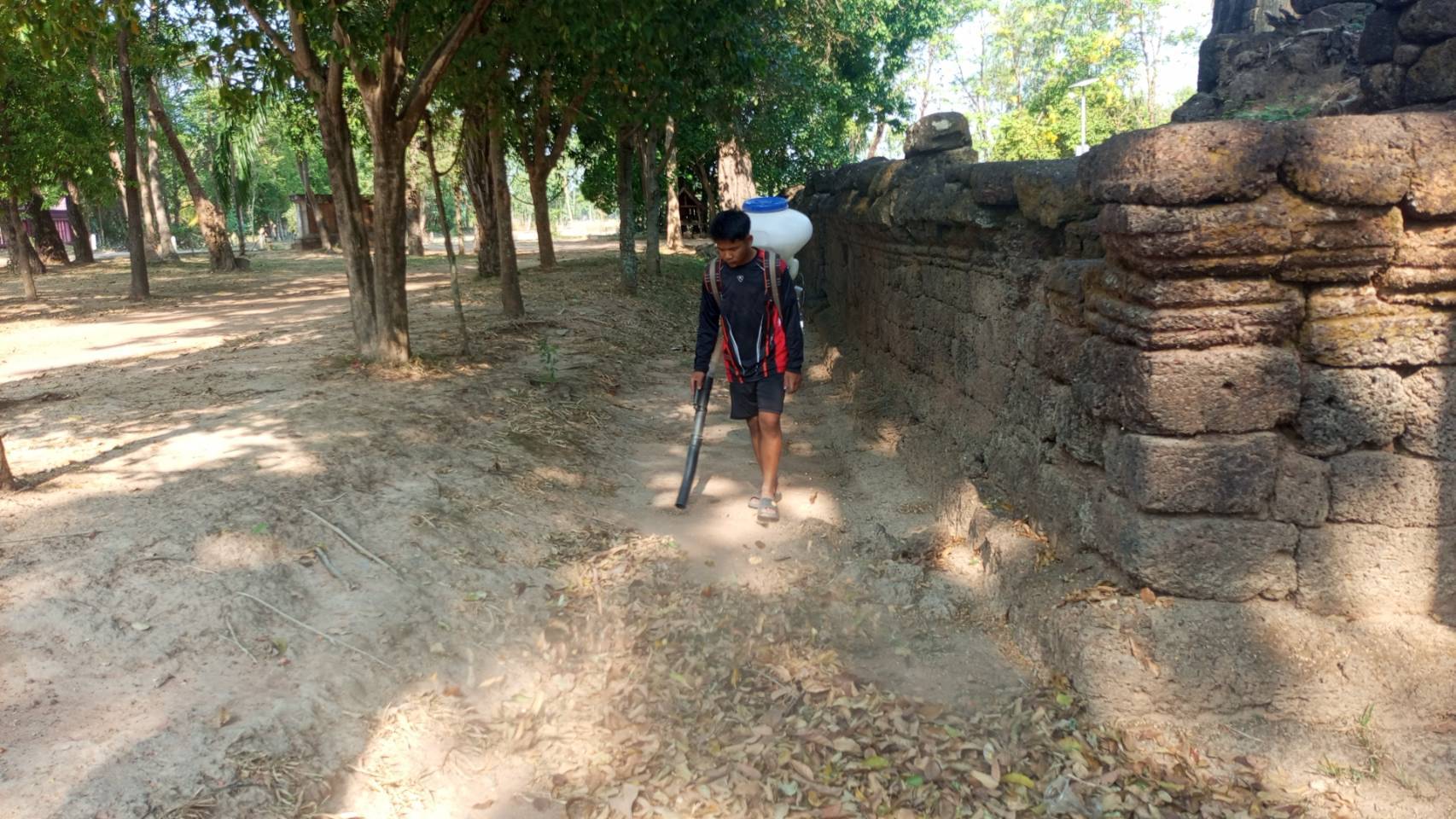 การดำเนินงานถากถางกำจัดวัชพืชบริเวณโดยรอบโบราณสถานปราสาททามจาน ตำบลสมอ อำเภอปรางค์กู่ จังหวัดศรีสะเกษ ในวันอาทิตย์ที่ 12 เมษายน 2569