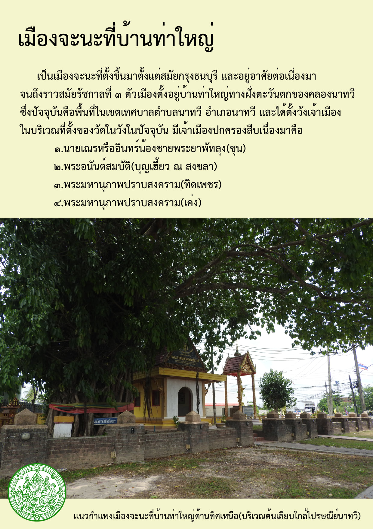 เป็นเมืองจะนะที่ตั้งขึ้นมาตั้งแต่สมัยกรุงธนบุรี และอยู่อาศัยต่อเนื่องมาจนถึงราวสมัยรัชกาลที่ ๓ ตัวเมืองตั้งอยู่บ้านท่าใหญ่ทางฝั่งตะวันตกของคลองนาทวี ซึ่งปัจจุบันคือพื้นที่ในเขตเทศบาลตำบลนาทวี อำเภอนาทวี และได้ตั้งวังเจ้าเมืองในบริเวณที่ตั้งของวัดในวังในปัจจุบัน มีเจ้าเมืองปกครองสืบเนื่องมาคือ นายเณรหรืออินทร์น้องชายพระยาพัทลุง(ขุน) พระอนันต์สมบัติ(บุญเฮี้ยว ณ สงขลา) พระมหานุภาพปราบสงคราม(ทิดเพชร) และพระมหานุภาพปราบสงคราม(เค่ง)