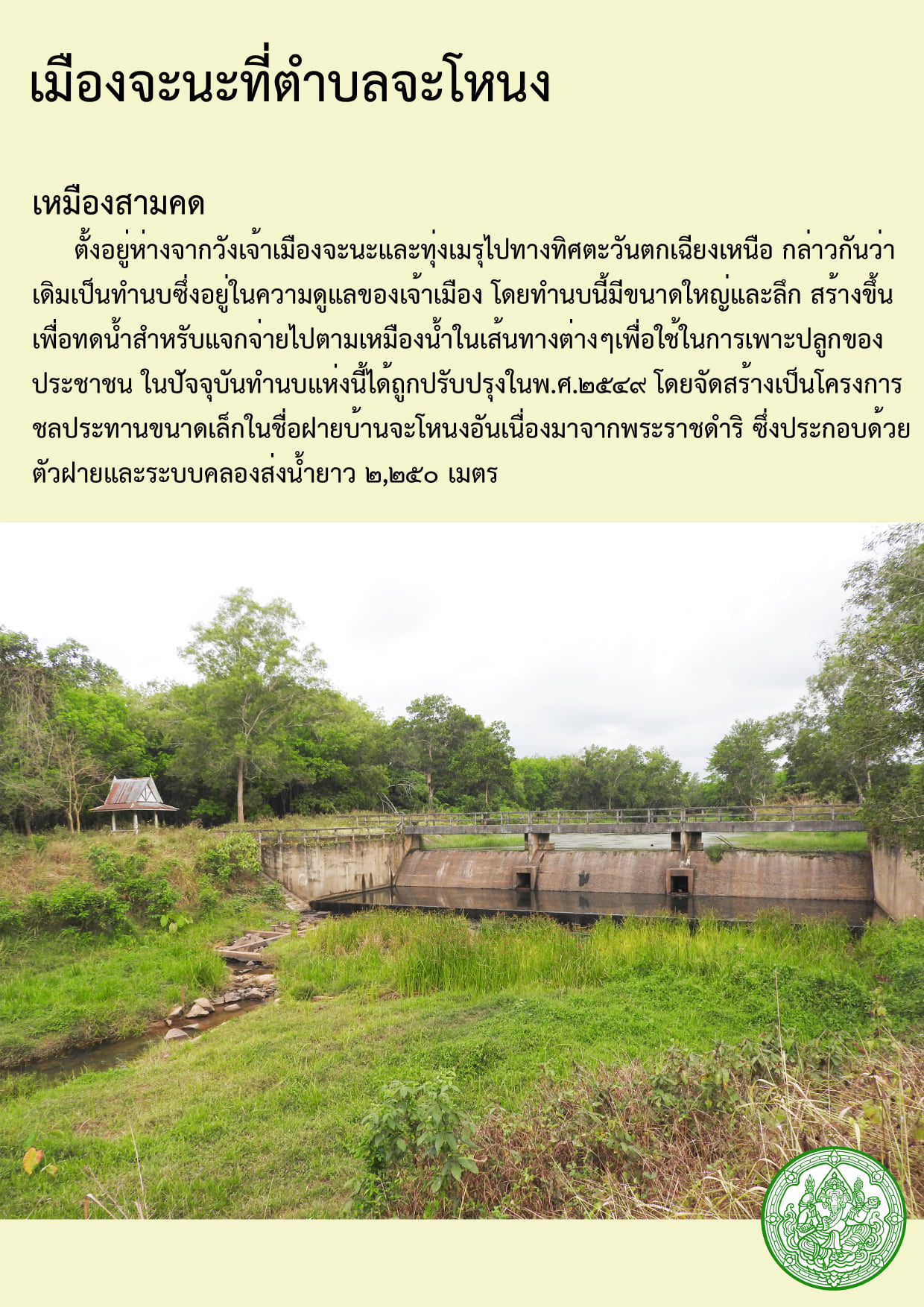 ๕.เหมืองสามคด ตั้งอยู่ห่างจากวังเจ้าเมืองจะนะและทุ่งเมรุไปทางทิศตะวันตกเฉียงเหนือ กล่าวกันว่าเดิมเป็นทำนบซึ่งอยู่ในความดูแลของเจ้าเมือง โดยทำนบนี้มีขนาดใหญ่และลึก สร้างขึ้นเพื่อทดน้ำสำหรับแจกจ่ายไปตามเหมืองน้ำในเส้นทางต่างๆเพื่อใช้ในการเพาะปลูกของประชาชน ในปัจจุบันทำนบแห่งนี้ได้ถูกปรับปรุงในพ.ศ.๒๕๔๙ โดยจัดสร้างเป็นโครงการชลประทานขนาดเล็กในชื่อฝายบ้านจะโหนงอันเนื่องมาจากพระราชดำริ ซึ่งประกอบด้วยตัวฝายและระบบคลองส่งน้ำยาว ๒,๒๕๐ เมตร