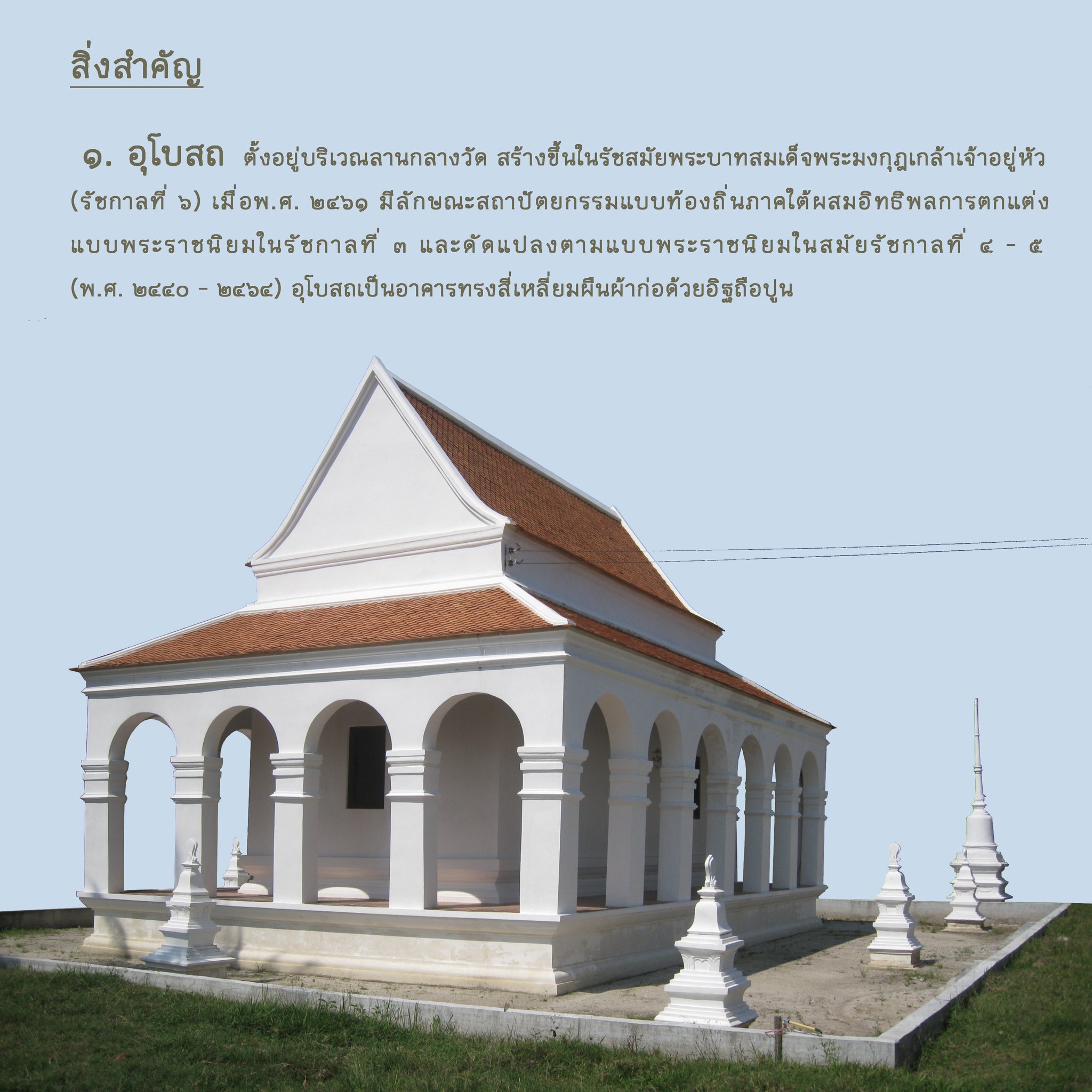 ๑. อุโบสถ ตั้งอยู่บริเวณลานกลางวัด สร้างขึ้นในรัชสมัยพระบาทสมเด็จพระมงกุฎเกล้าเจ้าอยู่หัว (รัชกาลที่ ๖) เมื่อพ.ศ. ๒๔๖๑ มีลักษณะสถาปัตยกรรมแบบท้องถิ่นภาคใต้ผสมอิทธิพลการตกแต่งแบบพระราชนิยมในรัชกาลที่ ๓ และดัดแปลงตามแบบพระราชนิยมในสมัยรัชกาลที่ ๔ - ๕ (พ.ศ. ๒๔๔๐ - ๒๔๖๔) อุโบสถเป็นอาคารทรงสี่เหลี่ยมผืนผ้าก่อด้วยอิฐถือปูน