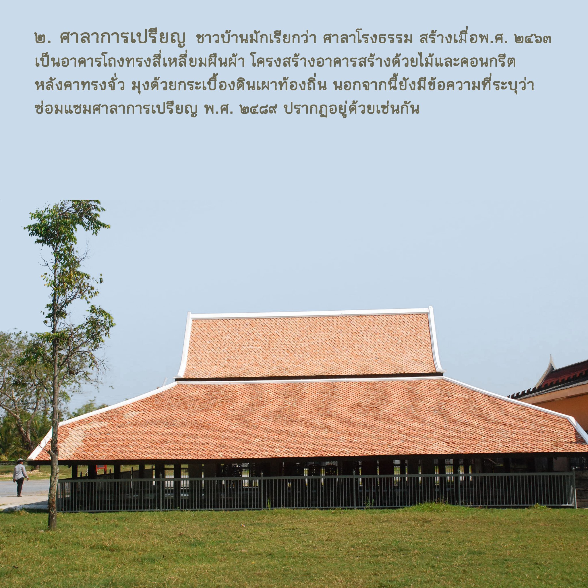 ๒. ศาลาการเปรียญ ชาวบ้านมักเรียกว่า ศาลาโรงธรรม สร้างเมื่อพ.ศ. ๒๔๖๓ เป็นอาคารโถงทรงสี่เหลี่ยมผืนผ้า โครงสร้างอาคารสร้างด้วยไม้และคอนกรีต หลังคาทรงจั่วมุงด้วยกระเบื้องดินเผาท้องถิ่น นอกจากนี้ยังมีข้อความที่ระบุว่าซ่อมแซมศาลาการเปรียญ พ.ศ. ๒๔๘๙ ปรากฏอยู่ด้วยเช่นกัน