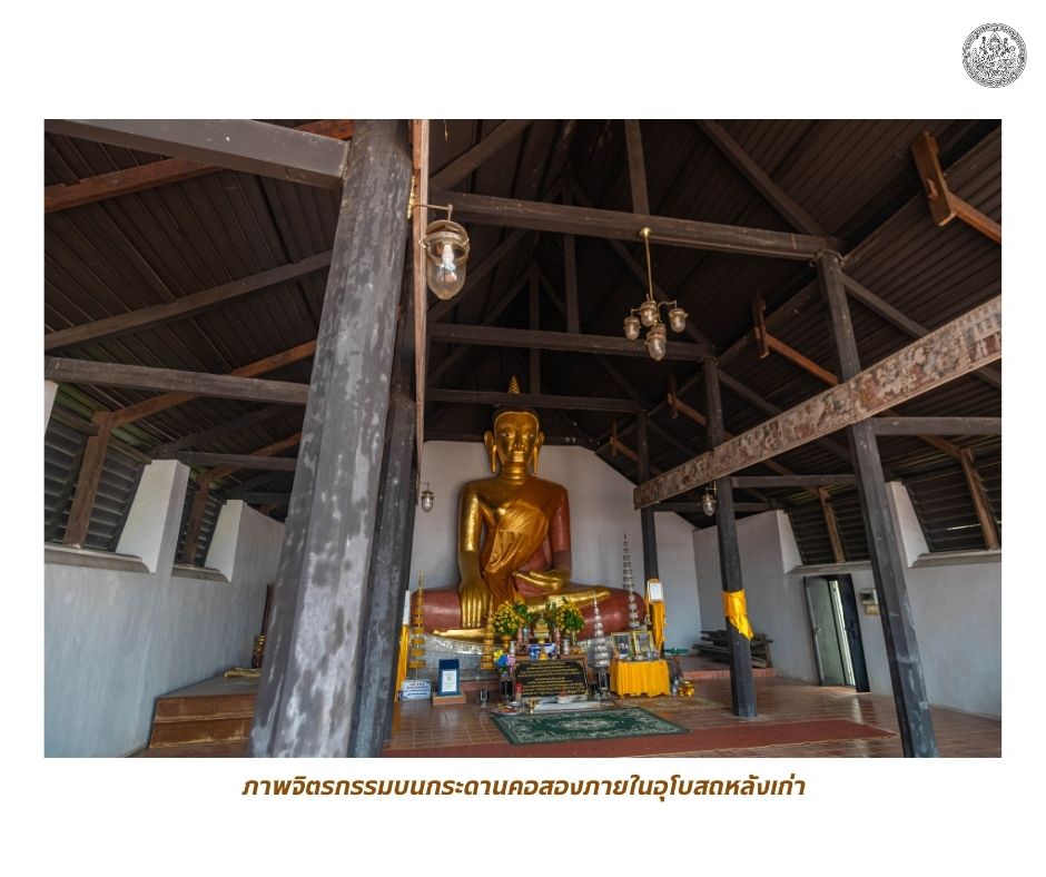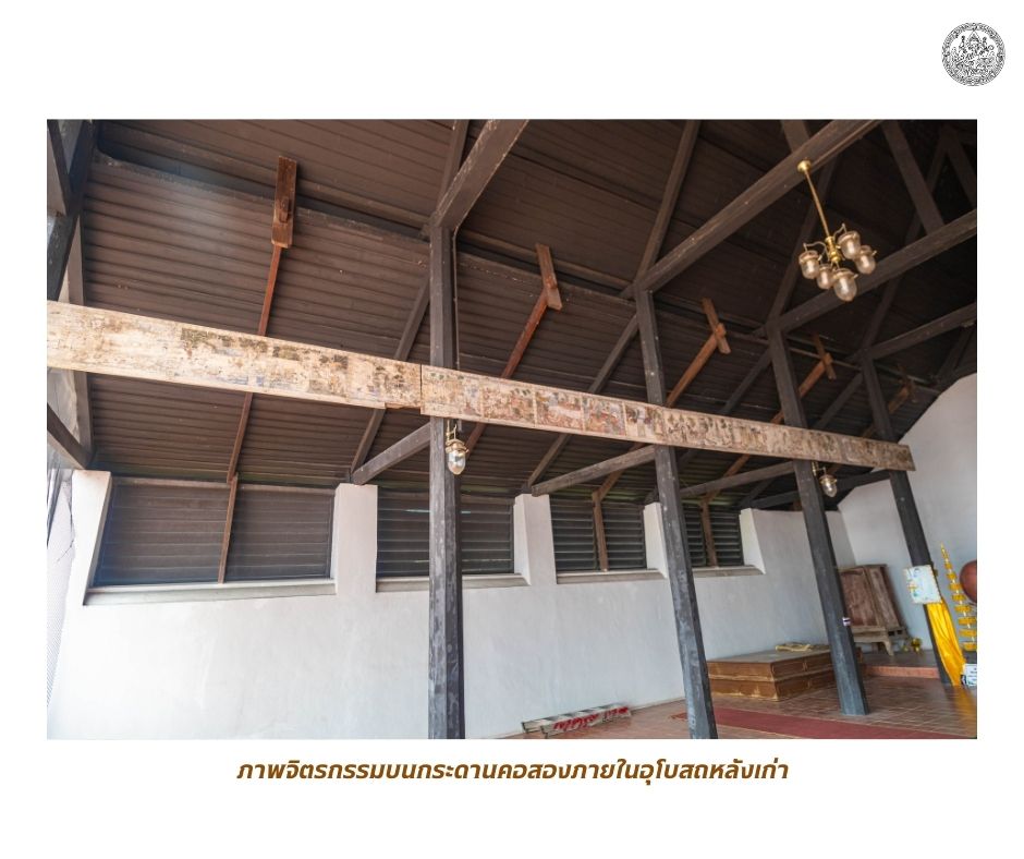 ภายในอุโบสถหลังเก่ามีภาพจิตรกรรมเขียนบนไม้กระดานคอสอง เขียนด้วยสีฝุ่นบนไม้ มีภาพทั้งหมด ๔๐ ห้อง ฝั่งทิศใต้เขียนเรื่องพุทธประวัติ ฝั่งทิศเหนือเขียนเรื่องทศชาติชาดก