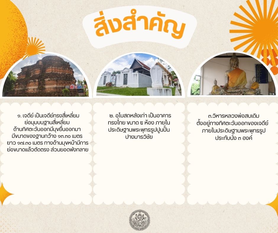 โบราณสถานสําคัญภายในวัดได้แก่ เจดีย์ขนาดใหญ่ก่อด้วยอิฐและหินปะการัง ส่วนยอดพังทลาย ได้รับการขุดแต่งและบูรณะโดย หน่วยศิลปากรที่ ๘ เมื่อ พ.ศ. ๒๕๓๐ อุโบสถหลังเก่ามีลักษณะเป็นอาคารทรงไทย ขนาด ๕ ห้อง ภายในประดิษฐานพระพุทธรูปปูนปั้นปางมารวิชัยลงรักปิดทอง จีวรทาสีชาด และมีภาพจิตรกรรมแบบไทยประเพณีเขียนบนไม้กระดานคอสอง เล่าเรื่องพุทธประวัติและทศชาติชาดก บางภาพปรากฏภาพชาวตะวันตกทำให้กำหนดอายุได้ว่าน่าจะเขียนขึ้นในช่วงสมัยรัชกาลที่ ๔ เป็นต้นมา โดยรอบอุโบสถปักใบเสมา สลักลวดลาย นอกจากนี้ทางด้านทิศใต้ของอุโบสถยังเคยมีเนินโบราณสถาน ปัจจุบันได้สร้างอาคารขนาดเล็ก บนเนินนี้ ภายในประดิษฐานพระพุทธรูปประทับนั่ง ๓ องค์ เรียกว่า วิหารหลวงพ่อสบเดิม.