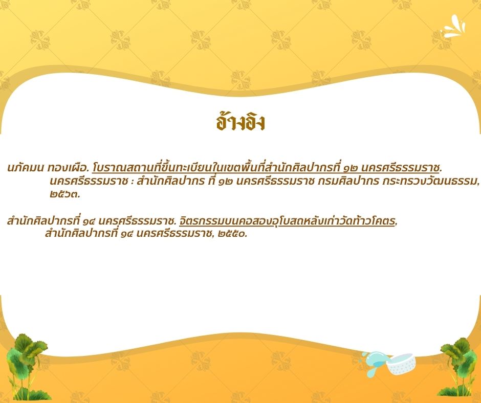 นภัคมน ทองเผือ. โบราณสถานที่ขึ้นทะเบียนในเขตพื้นที่สำนักศิลปากรที่ ๑๒ นครศรีธรรมราช. นครศรีธรรมราช: สำนักศิลปากรที่ ๑๒ นครศรีธรรมราช กรมศิลปากร กระทรวงวัฒนธรรม, ๒๕๖๓