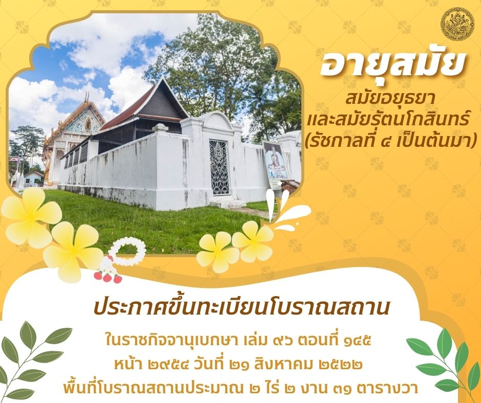 ประกาศขึ้นทะเบียนโบราณสถาน ในราชกิจจานุเบกษา เล่ม ๙๖ ตอนที่ ๑๔๕ หน้า ๒๙๕๔ วันที่ ๒๑ สิงหาคม ๒๕๒๒