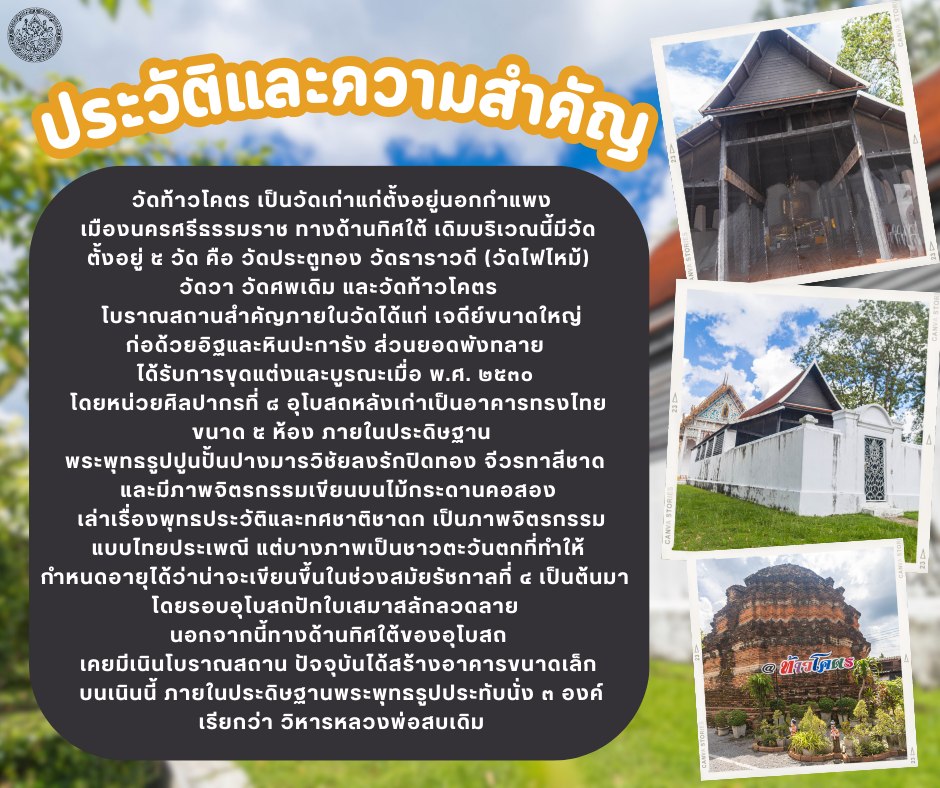 วัดท้าวโคตร เป็นวัดเก่าแก่ตั้งอยู่นอกกําแพงเมืองนครศรีธรรมราช ทางด้านทิศใต้ เดิมบริเวณนี้มีวัด ตั้งอยู่ ๕ วัด คือ วัดประตูทอง วัดธาราวดี (วัดไฟไหม้) วัดวา วัดศพเดิม และวัดท้าวโคตร