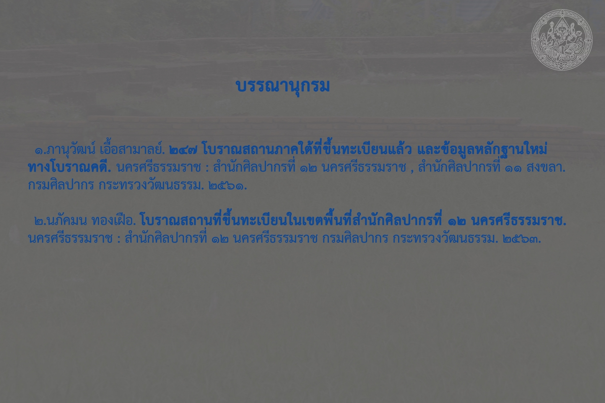 ๑.ภาณุวัฒน์ เอื้อสามาลย์. ๒๔๗ โบราณสถานภาคใต้ที่ขึ้นทะเบียนแล้ว และข้อมูลหลักฐานใหม่ทางโบราณคดี. นครศรีธรรมราช : สำนักศิลปากรที่ ๑๑ สงขลา , สำนักศิลปากรที่ ๑๒ นครศรีธรรมราช. กรมศิลปากร กระทรวงวัฒนธรรม. ๒๕๖๑.