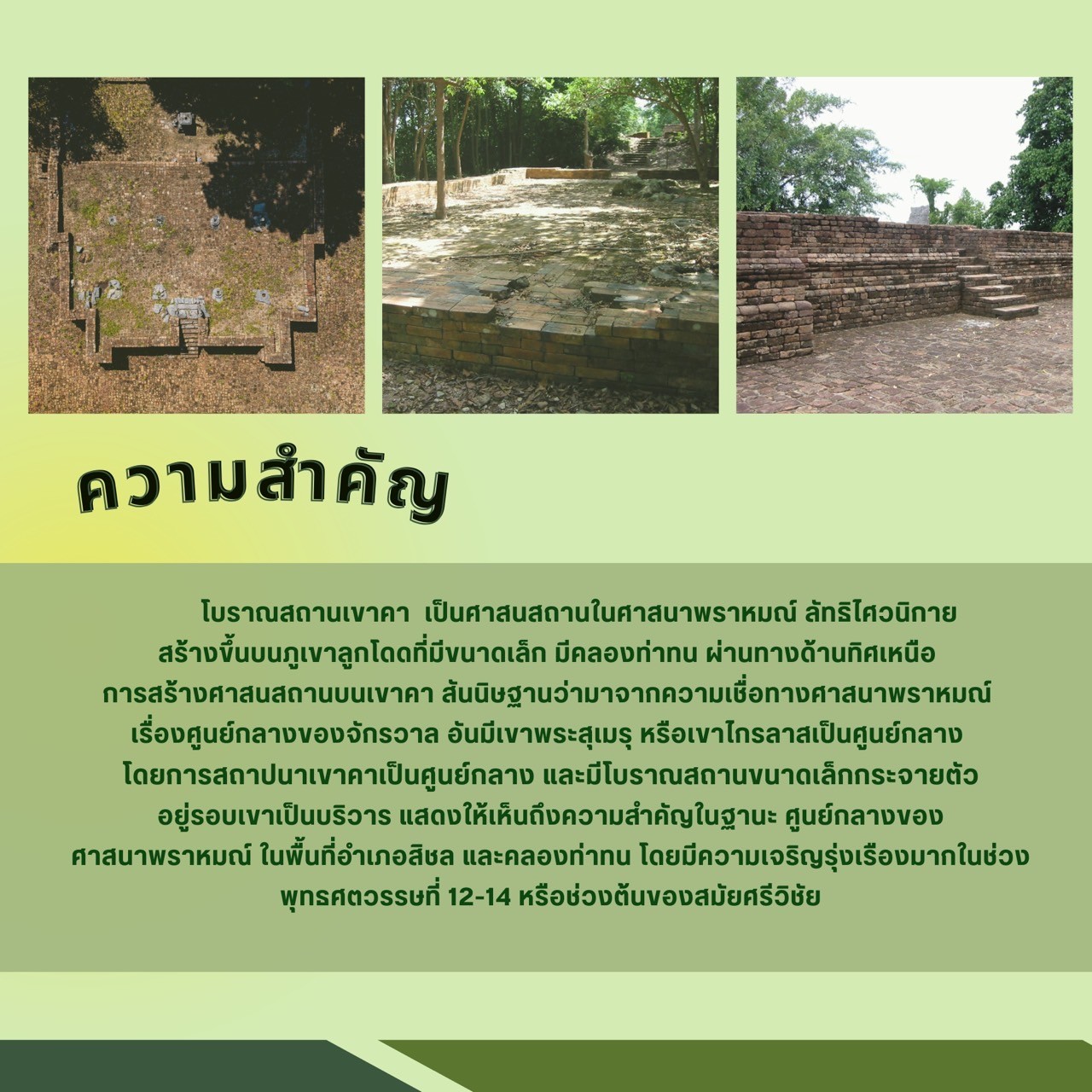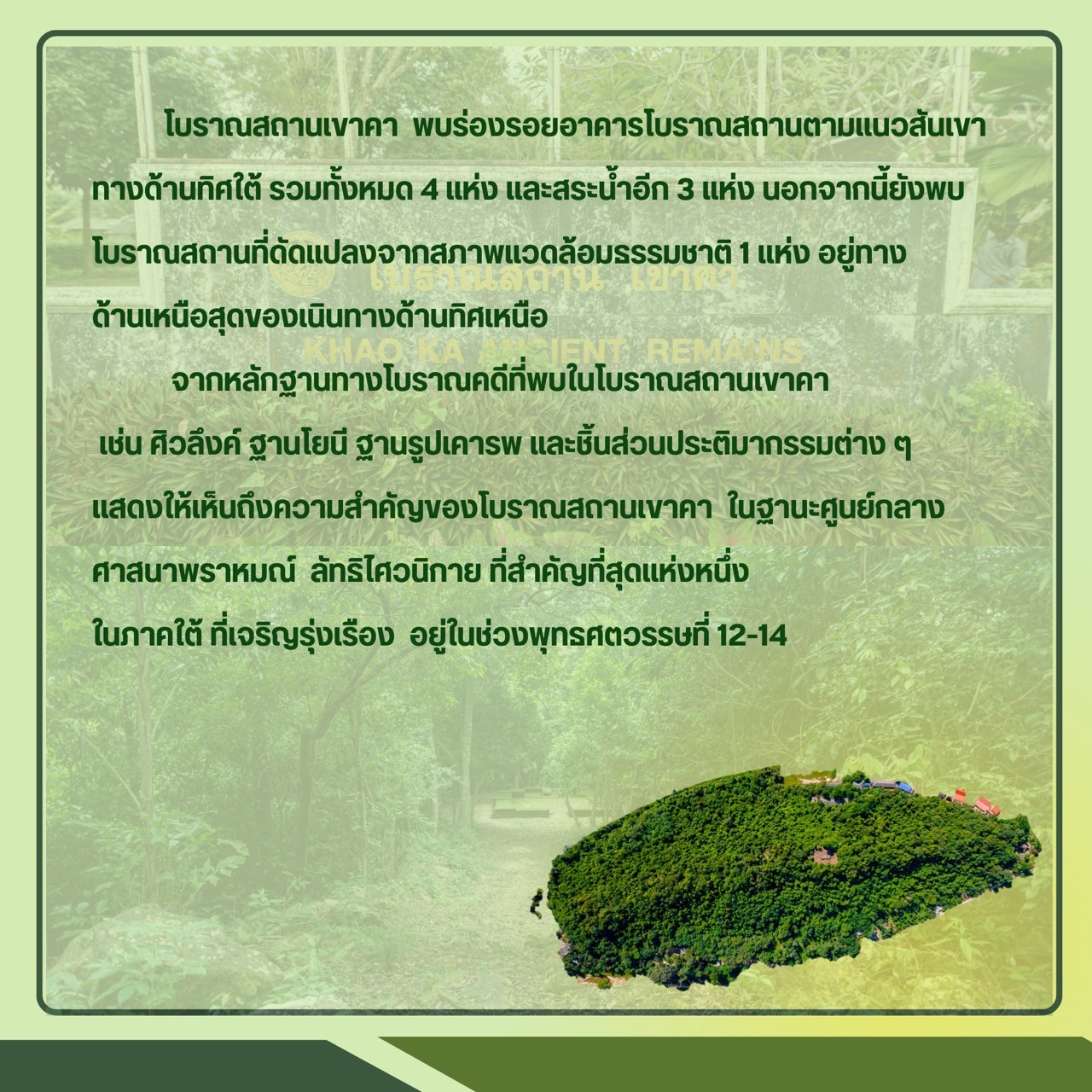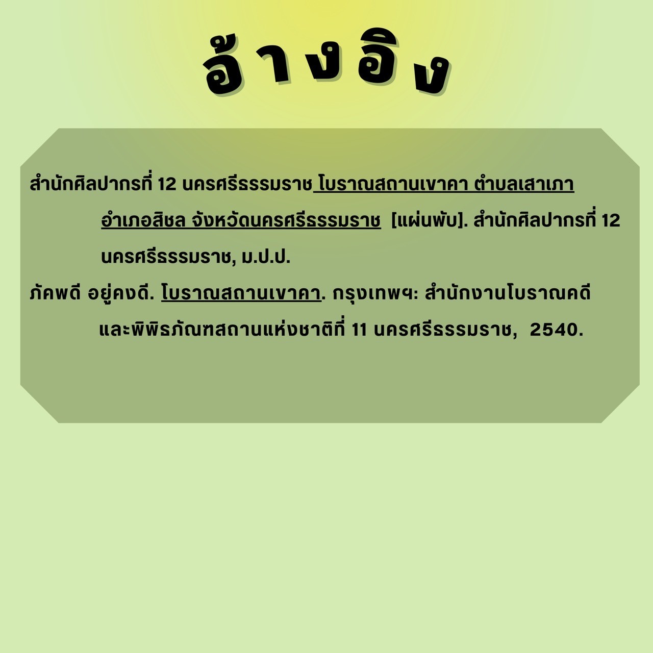 สื่อองค์ความรู้ชุดโบราณสถานเขาคานี้เป็นส่วนหนึ่งของการวิจัย เรื่อง การพัฒนาสื่ออินโฟกราฟฟิก เพื่อประชาสัมพันธ์โบราณสถานเขาคา ตำบลเสาเภา อำเภอสิชล จังหวัดนครศรีธรรมราช ของ นางสาวอัญชลี นะสุด นักศึกษาสาขาวิชาการจัดการวัฒนธรรมเชิงเศรษฐกิจสร้างสรรค์ คณะมนุษยศาสตร์และสังคมศาสตร์ มหาวิทยาลัยราชภัฏนครศรีธรรมราช