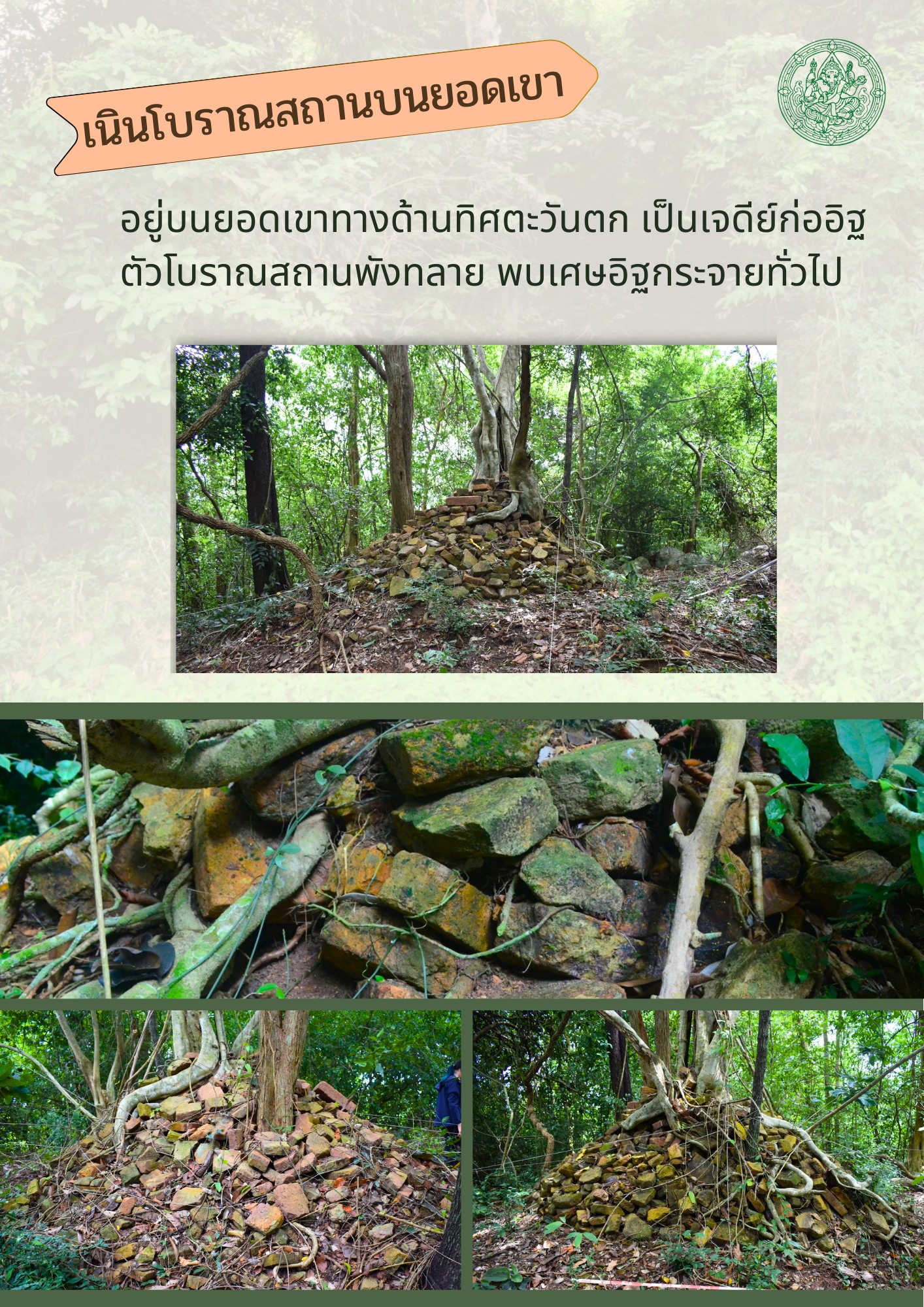 บริเวณยอดเขาทางทิศตะวันตก พบเนินโบราณสถานมีลักษณะเป็นเนินดินขนาดเล็ก ตั้งอยู่บนยอดสูงสุดของภูเขา ที่เป็นพื้นที่แคบ ๆ บริเวณเนินดินพบเศษอิฐกระจัดกระจายอยู่ทั่วไป มีต้นไม้ขนาดย่อมขึ้นปกคลุม โดยรากไม้ได้ชอนไชลงไปภายในเนินโบราณสถาน เนื่องจากมีการพังทลายอย่างมากจึงไม่ทราบรูปทรงที่ชัดเจนของโบราณสถาน