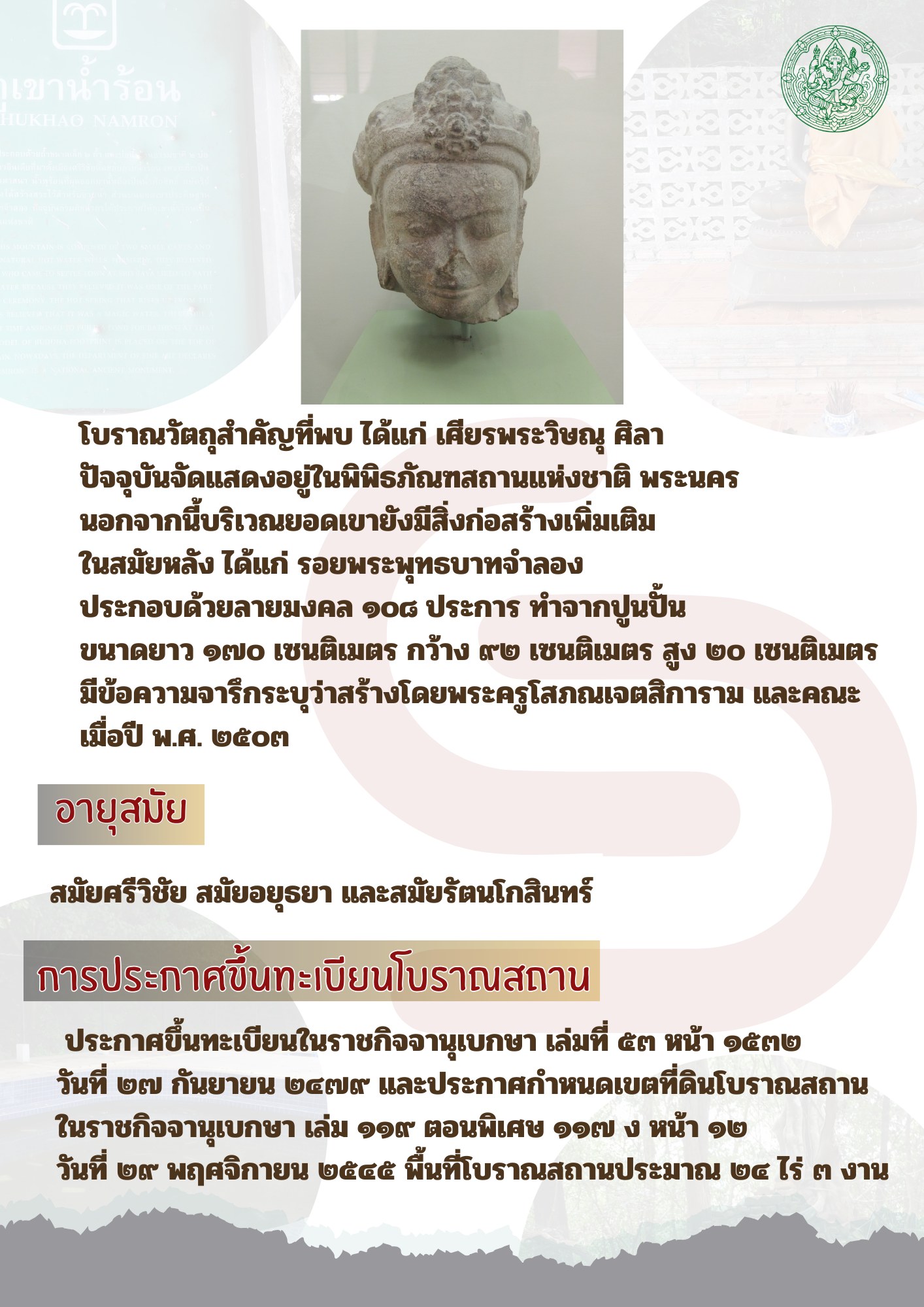 โบราณสถานเขาน้ำร้อน ได้รับการประกาศขึ้นทะเบียนโบราณสถานในราชกิจจานุเบกษา เล่มที่ ๕๓ หน้า ๑๕๓๒