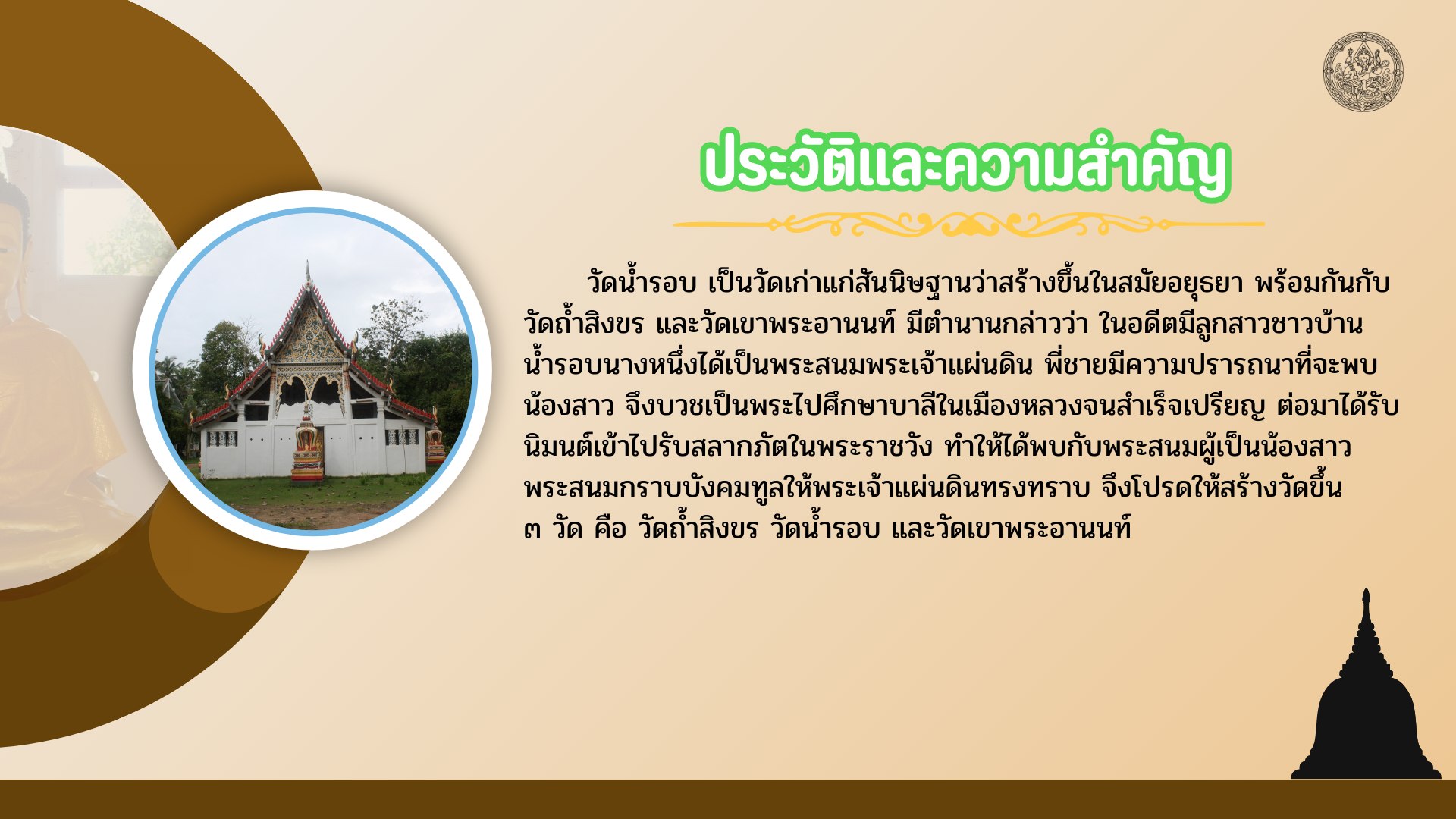 วัดน้ำรอบ เป็นวัดเก่าแก่ สันนิษฐานว่าสร้างในสมัยอยุธยา พร้อมกันกับวัดถ้ำสิงขร และวัดเขาพระอานนท์ มีตำนานกล่าวว่า ในอดีตมีลูกสาวชาวบ้านน้ำรอบนางหนึ่งได้เป็นพระสนมในพระเจ้าแผ่นดิน พี่ชายมีความปรารถนาที่จะพบน้องสาวจึงบวชเป็นพระไปศึกษาบาลีในเมืองหลวงจนสำเร็จเปรียญ และต่อมาได้รับนิมนต์เข้าไปรับสลากภัตในพระราชวัง ทำให้ได้พบกับพระสนมผู้เป็นน้องสาว พระสนมกราบบังคมทูลให้พระเจ้าแผ่นดินทรงทราบ จึงโปรดให้สร้างวัดขึ้น ๓ วัดคือ วัดถ้ำสิงขร วัดน้ำรอบ และวัดเขาพระอานนท์