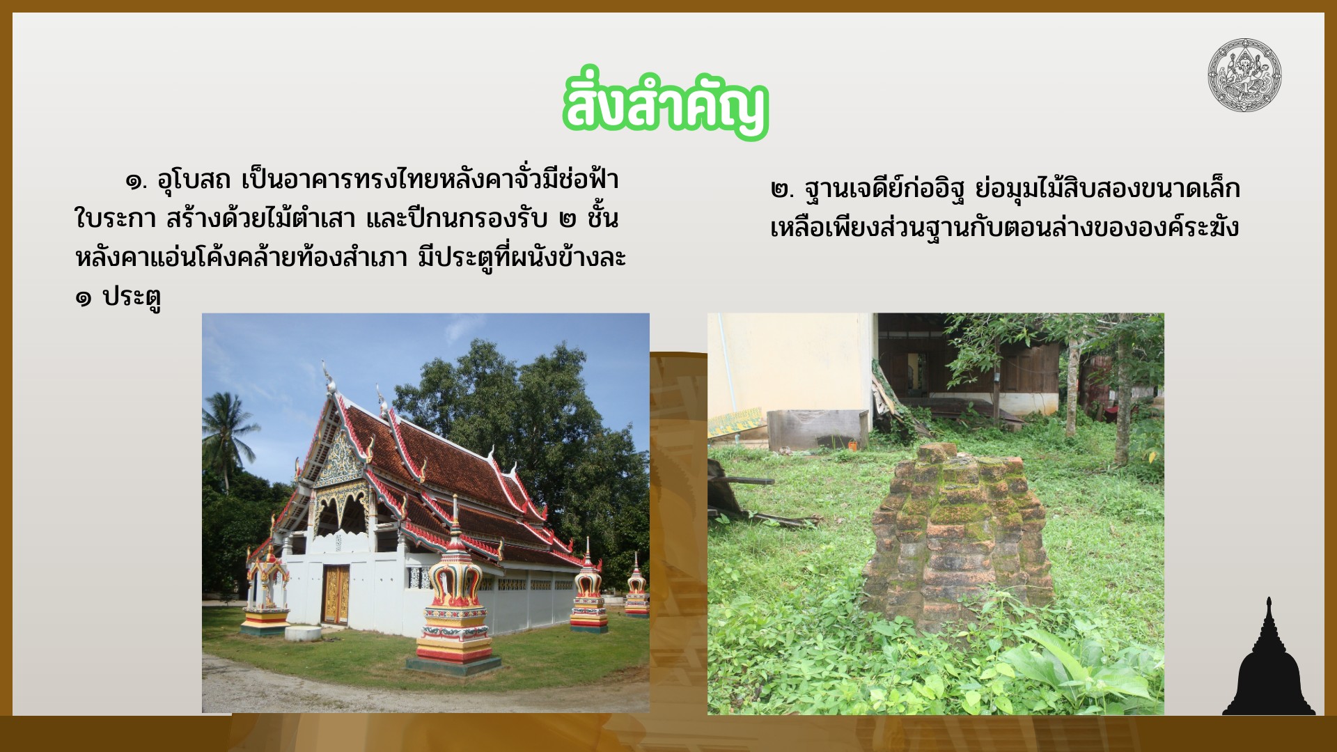 สิ่งสำคัญภายในวัด ได้แก่ อุโบสถ สร้างด้วยไม้ตำเสา เป็นอาคารทรงไทยหลังคาจั่วมีช่อฟ้าใบระกาและปีกนกรองรับ ๒ ชั้น หลังคาแอ่นโค้งคล้ายท้องสำเภาผนังโบสถ์เป็นผนังเตี้ย ก่ออิฐฉาบปูนตำ อิฐก่อขึ้นมาจากพื้น ไม่มีฐานบัวรองรับเหมือนโบสถ์ทั่วไป สันนิษฐานว่าของเดิมอาจเป็นไม้ทั้งหลัง