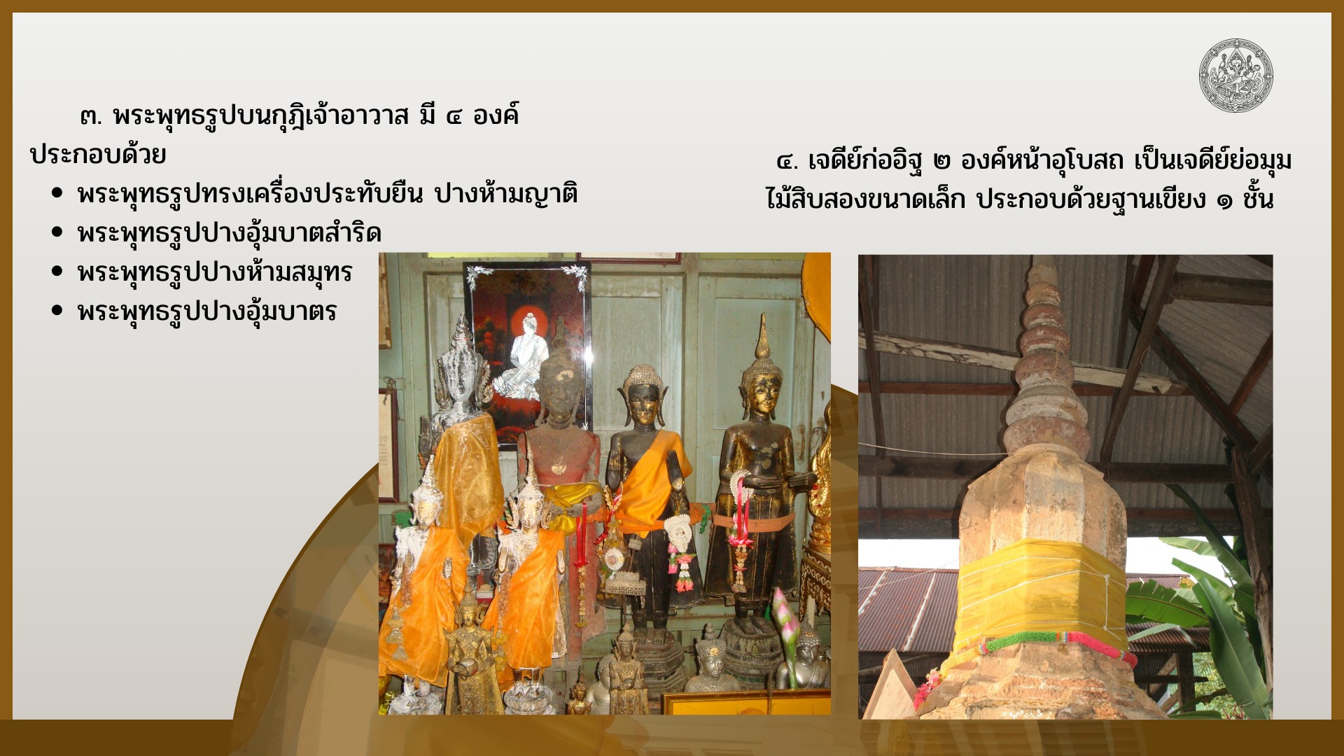 ส่วนโบราณวัตถุที่พบ ได้แก่ พระพุทธรูปทรงเครื่องประทับยืนปางห้ามญาติ พระพุทธรูปปางอุ้มบาตร สำริด พระพุทธรูปปางห้ามสมุทร พระพุทธรูปปางอุ้มบาตรสำริดลงรักปิดทอง และศิลาจารึก ทำจากหินชนวนเป็นจารึกอักษรไทย ภาษาไทย จารึกใน พ.ศ. ๒๓๙๑ สันนิษฐานว่าเป็นเนื้อความย่อจากเอกสารกัลปนา วัดน้ำรอบ