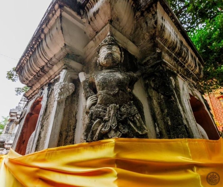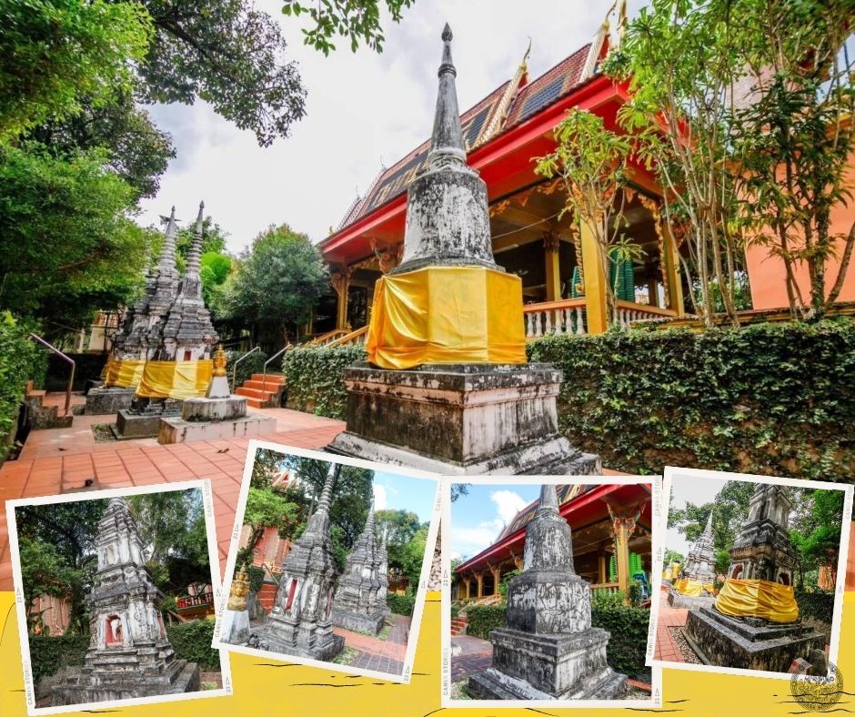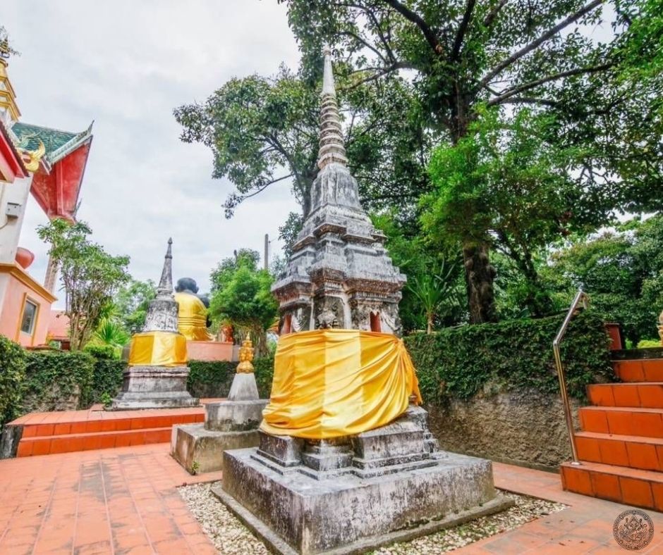 .....โบราณสถานสำคัญภายในวัดได้แก่ เจดีย์ สี่เหลี่ยมย่อมุมไม้สิบสอง จำนวน ๔ องค์ ตั้งเรียงตามแนวทิศตะวันออก – ทิศตะวันตก ซึ่งกรมศิลปากรขุดค้น ขุดแต่งและบรูณะในปี พ.ศ. ๒๕๕๖ ประกอบด้วย เจดีย์องค์ที่ ๑ (องค์ทิศตะวันตกสุด) ขนาดฐานกว้างด้านละ ๑.๖๐ เมตร เจดีย์องค์ที่ ๒ ขนาดฐานกว้างด้านล่ะ ๑.๘๐ เมตร เจดีย์องค์ที่ ๓ ขนาดฐานกว้าง ด้านละ ๑.๓๐ เมตร และเจดีย์องค์ที่ ๔ (องค์ทิศตะวันออกสุด) ขนาดฐานด้านล่ะ ๑.๓๐ เมตร เจดีย์เหล่านี้ เป็นเจดีย์ทรงปราสาทยอด ส่วนเรือนธาตุย่อมุมไม้สิบสอง ส่วนองค์ระฆังเป็นดินเผาแกะสลักลวดลาย มีการประดับตกแต่ง ด้วยลายปูนปั้นที่งดงาม