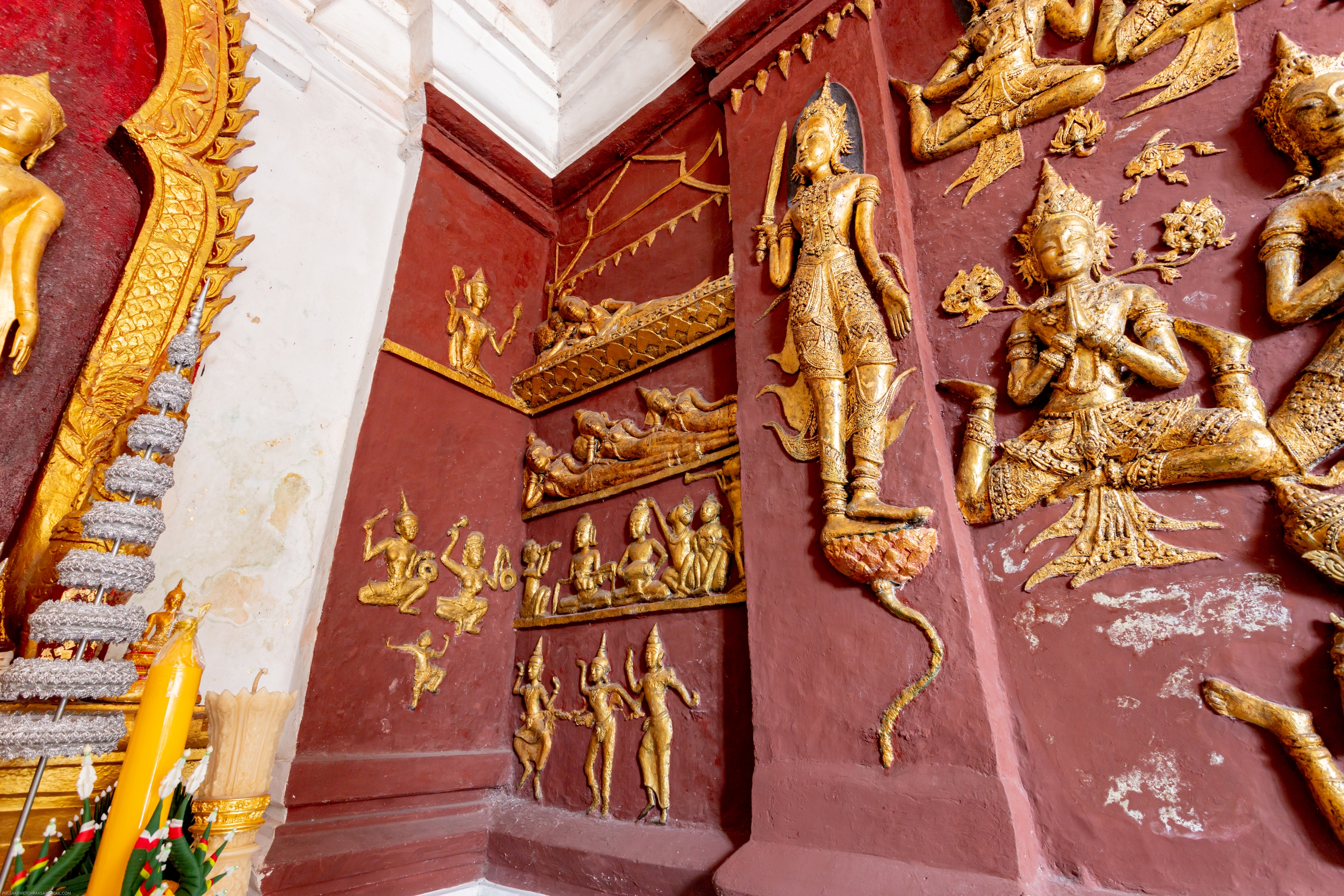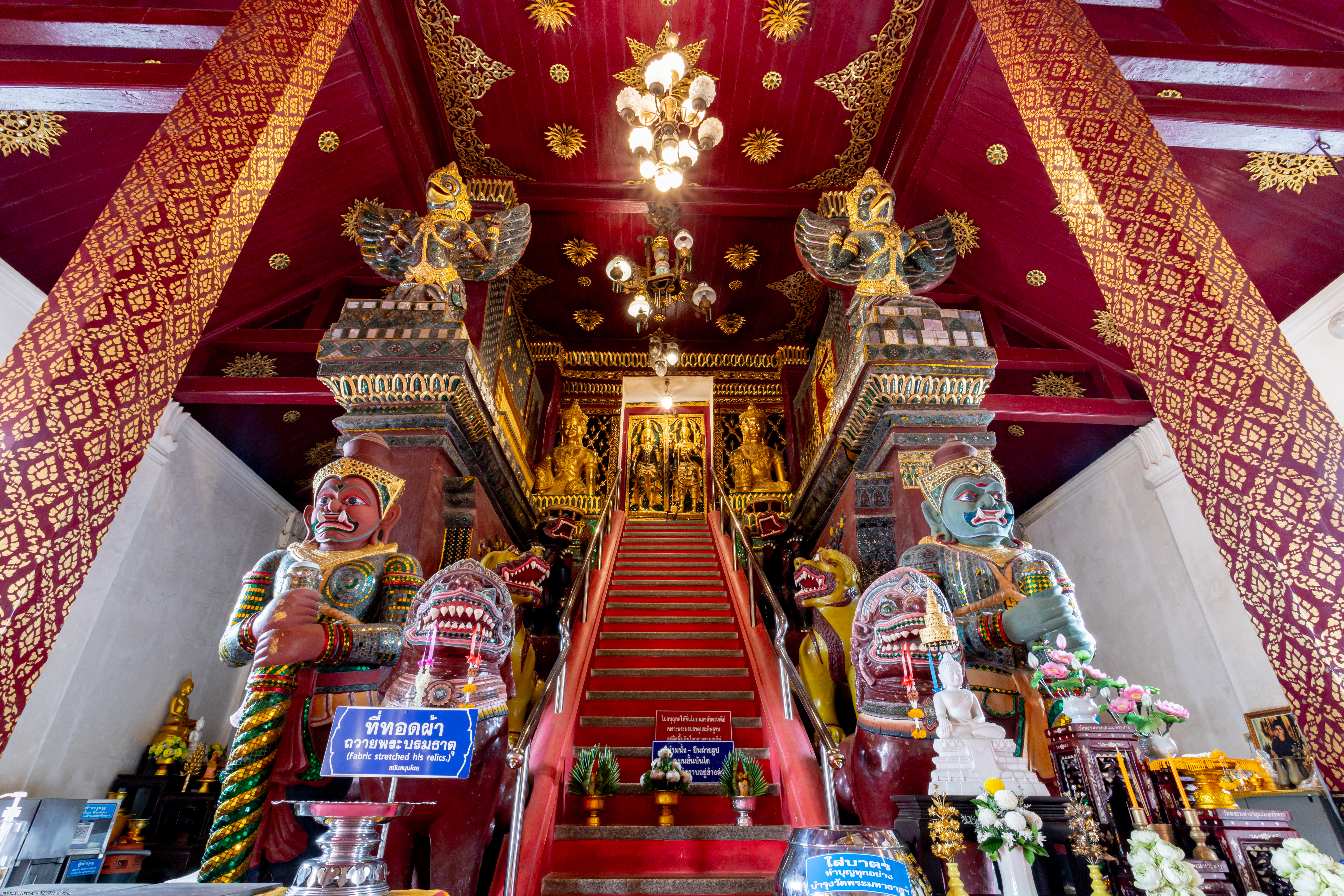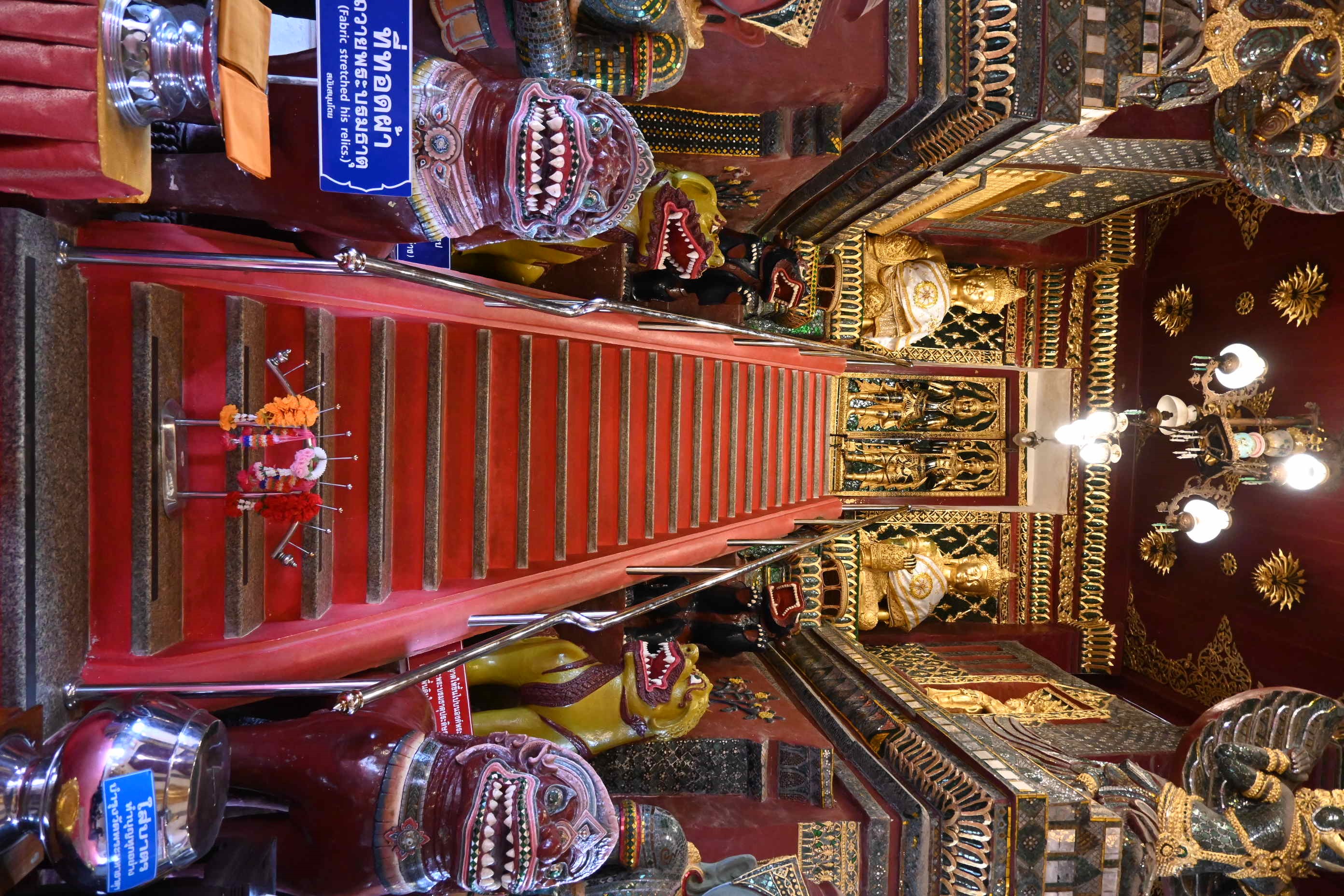 บันไดทางขึ้นลานประทักษิณสำหรับการเดินเวียนรอบองค์ระฆังของพระบรมธาตุเจดีย์ เพื่อบูชา พระบรมสารีริกธาตุและเทพเจ้าในวิหารแห่งนี้ ด้านข้างของบันไดทั้งสองฝั่งที่ขึ้นไปยังพระบรมธาตุเจดีย์ มีรูปปั้นของเหล่าเทวดาผู้พิทักษ์และสัตว์วิเศษต่าง ๆ เช่น จตุโลกบาล (เทพผู้ปกป้องโลกทั้ง 4 ทิศ) ยักษ์ สิงห์ นาค และครุฑ ทำหน้าที่เป็นสัญลักษณ์ในการปกป้องพระบรมสารีริกธาตุและบ่งบอกถึงการขึ้นไปยังอาณาจักรศักดิ์สิทธิ์ ที่สำคัญที่สุดคือรูปปั้นเทวดาผู้พิทักษ์คู่หนึ่งที่ตั้งอยู่ในระดับสูงสุด มีชื่อจารึกว่า ขัตตุคาม (กัตตาระคาม/ สกันทะ) ทางด้านซ้าย และรามเทพ (พระราม) ทางด้านขวา ซึ่งก่อให้เกิดเทวรูปผสมใหม่ที่เรียกว่า จตุคามรามเทพ ที่ได้รับความนิยมอย่างมากในประเทศไทยและต่างประเทศนับตั้งแต่ช่วงทศวรรษที่ 2510 ด้านบนสุดของบันไดทางเข้าพระบรมธาตุเจดีย์มีประตูไม้สองบานที่แกะสลักอย่างประณีต โดยมีภาพเทพเจ้าปรากฏบนแต่ละบาน ภาพทางซ้ายสมเด็จฯ กรมพระยาดำรงราชานุภาพ ทรงเชื่อว่าเป็นพระโพธิสัตว์อวโลกิเตศวร ส่วนทางขวาเป็นพระวิษณุ รูปปั้นทั้งหมดนี้สะท้อนถึงการผสมผสานระหว่างพุทธศาสนาเถรวาทและมหายาน ศาสนาฮินดู และความเชื่อพื้นบ้าน ซึ่งช่วยเสริมสร้างความศักดิ์สิทธิ์ของพระบรมธาตุเจดีย์