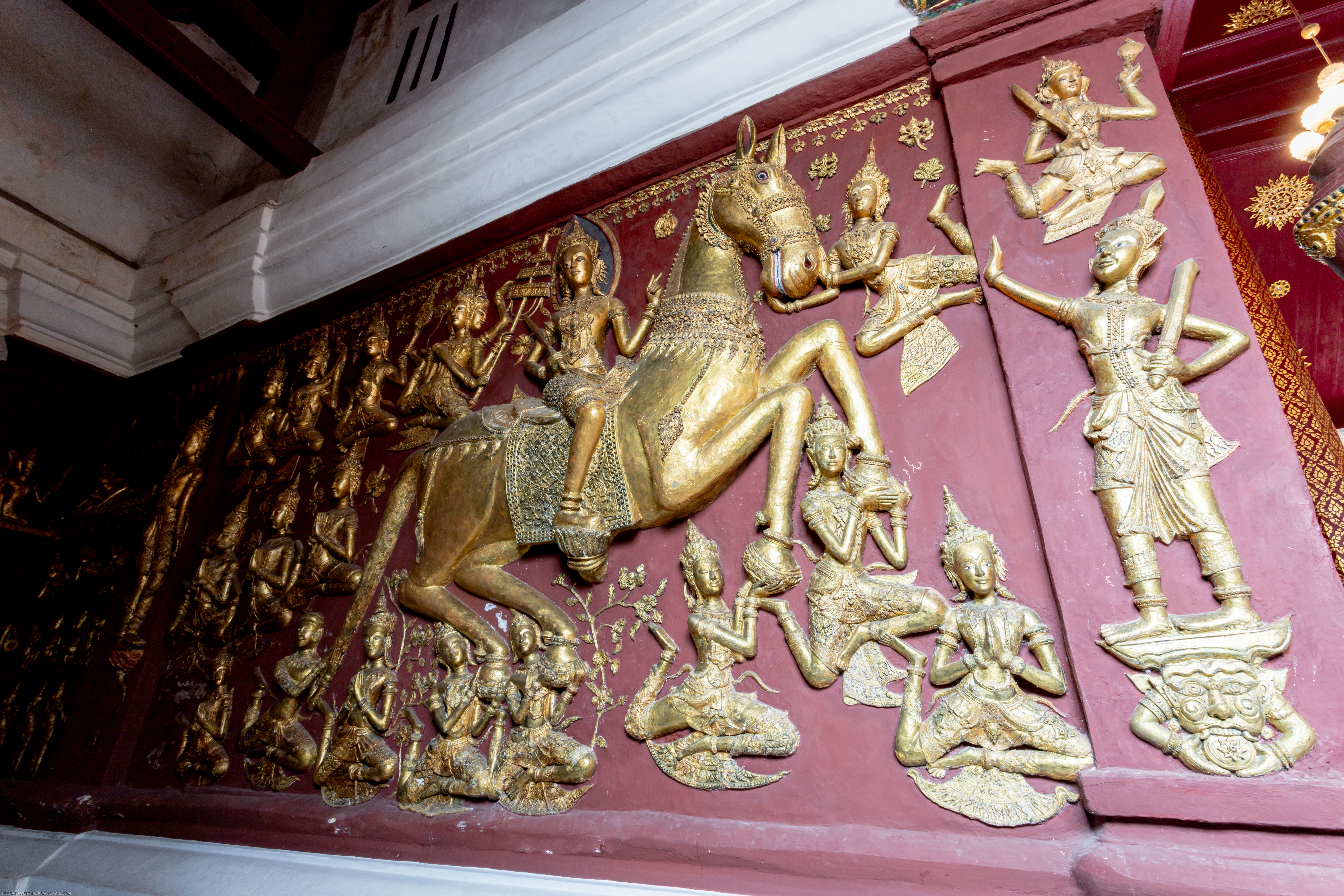 วิหารพระทรงม้าเป็นอาคารมีหลังคาครอบบันไดทางขึ้นเพียงทางเดียวไปยังลานประทักษิณรอบองค์ระฆัง วิหารนี้ตั้งอยู่ทางทิศเหนือของพระบรมธาตุ ตัววิหารมีขนาดกว้าง 10.40 เมตร ยาว 11.10 เมตร และสูง 11.75 เมตร หลังคาวิหารสร้างจากไม้และมุงด้วยกระเบื้องดินเผา โดยออกแบบให้ใช้ร่วมกับวิหารเขียนทางด้านทิศเหนือ กำแพงอิฐที่ขนาบบันไดอิฐทางขึ้นพระบรมธาตุเจดีย์ได้รับการประดับด้วยประติมากรรมปูนปั้นนูนสูง แสดงภาพพุทธประวัติตอนสำคัญ ๆ ของพระพุทธเจ้าในสมัยพุทธกาล โดยตอนที่สำคัญที่สุดคือมหาภิเนษกรมณ์ หรือวันที่เจ้าชายสิทธัตถะทรงออกผนวช ละทิ้งพระราชวังอันสุขสบายและชีวิตเจ้าชายเพื่อแสวงหาการตรัสรู้และการหลุดพ้นทางจิตวิญญาณเพื่อมวลมนุษยชาติ ในภาพนี้มีเจ้าชายทรงม้ากันฑกะ ซึ่งมีเหล่าเทวดาช่วยอุ้มกีบเท้าของม้าไว้เพื่อไม่ให้เกิดเสียงดัง ฉากนี้เองที่เป็นที่มาของชื่อ วิหารพระทรงม้า อันหมายถึง พระผู้ทรงม้า ประติมากรรมชิ้นนี้ถือว่าเป็นประติมากรรมนูนสูง ที่ใหญ่ที่สุดในบรรดางานศิลปะลักษณะนี้ และเป็นหนึ่งในผลงานศิลปะที่โดดเด่นที่สุดในสมัยอยุธยา ตอนปลาย (พ.ศ. 2231 - 2310) ซึ่งเป็นช่วงเวลาที่มีการสร้างสรรค์ประติมากรรมส่วนใหญ่ของวิหารนี้ ประติมากรรมนี้ได้รับการศึกษาและชื่นชมจากสมเด็จฯ กรมพระยาดำรงราชานุภาพ และสมเด็จฯ เจ้าฟ้ากรมพระยานริศรานุวัดติวงศ์ ซึ่งทั้งสองพระองค์ได้รับการยกย่องจากองค์การยูเนสโกให้เป็นบุคคลสำคัญของโลกและบุคคลสำคัญทางวัฒนธรรมนานาชาติ