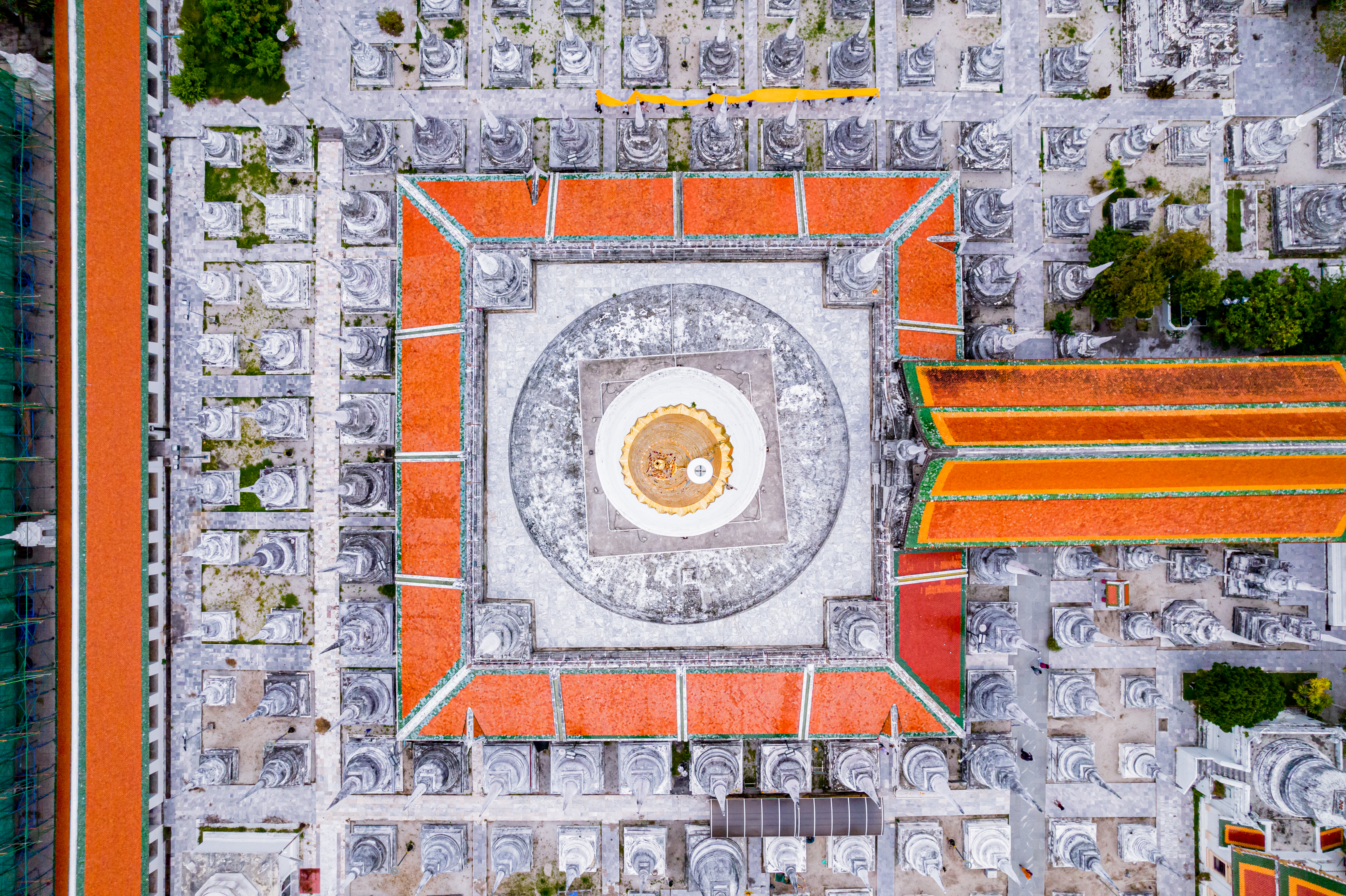 พระบรมธาตุเจดีย์สร้างขึ้นโดยได้รับอิทธิพลทางสถาปัตยกรรมจากอินเดียและอินโดนีเซีย (ชวา ภาคกลาง) การออกแบบแผนผังของสิ่งปลูกสร้างขนาดใหญ่นี้ได้รับการวางแผนอย่างรอบคอบเพื่อแสดงถึงแผนผังมณฑลสามมิติ (แผนผังจักรวาลอันศักดิ์สิทธิ์) โดยมีชั้นแนวนอนสามชั้นเป็นสี่เหลี่ยมที่ประกอบไปด้วยเจดีย์รายล้อมรอบฐานสี่เหลี่ยมขนาดใหญ่ของพระบรมธาตุเจดีย์ มีสัดส่วนโดยประมาณดังนี้ เจดีย์ชั้นในสุดมีความสูง 9.98 เมตร และฐานสี่เหลี่ยมกว้าง 3.75 เมตร เจดีย์ชั้นกลางมีความสูง 7.95 เมตร และฐานสี่เหลี่ยมกว้าง 2.95 เมตร ส่วนเจดีย์ชั้นนอกสุดมีความสูง 7 เมตร และฐานสี่เหลี่ยมกว้าง 2.25 เมตร ความสูงของเจดีย์ราย เหล่านี้จะค่อย ๆ ลดลงจากชั้นในสุดไปยังชั้นนอกสุด ตัวเจดีย์จัดเรียงอย่างสมมาตรและเป็นระเบียบตามแนวรัศมีที่แผ่ออกจากเจดีย์ประธาน ทำให้เกิดรูปลักษณ์ของการขึ้นสู่ภพภูมิที่สูงขึ้นอย่างอัศจรรย์