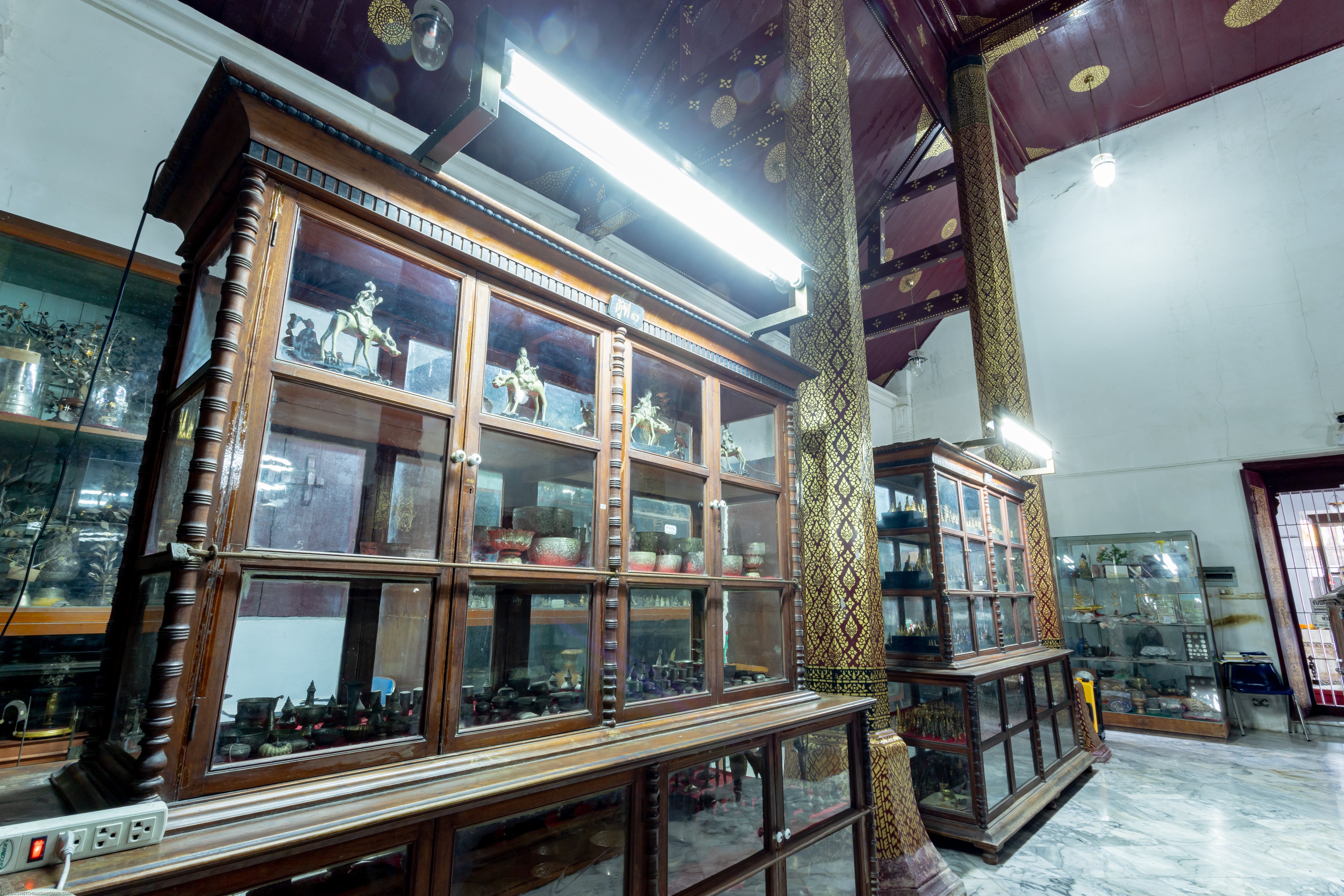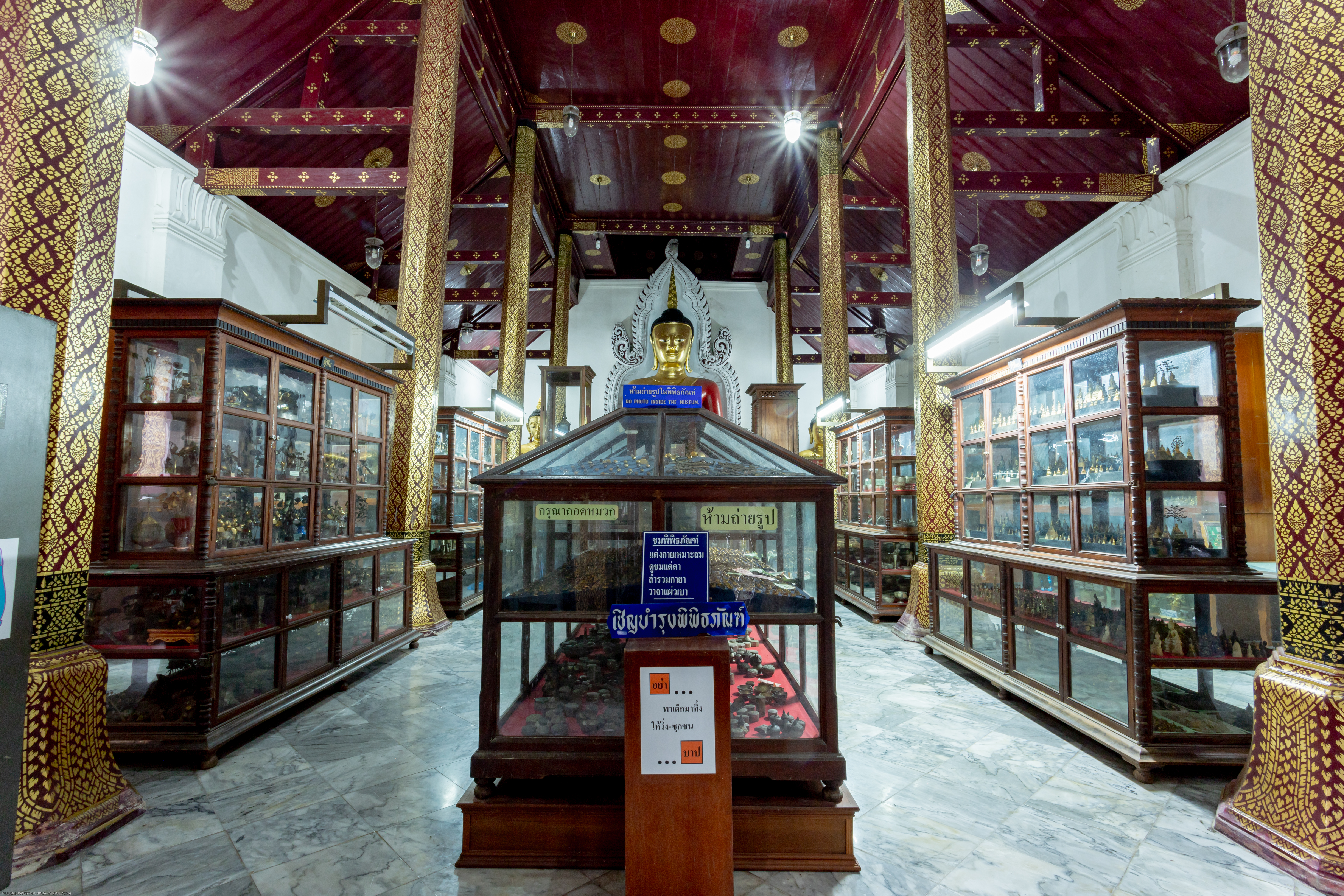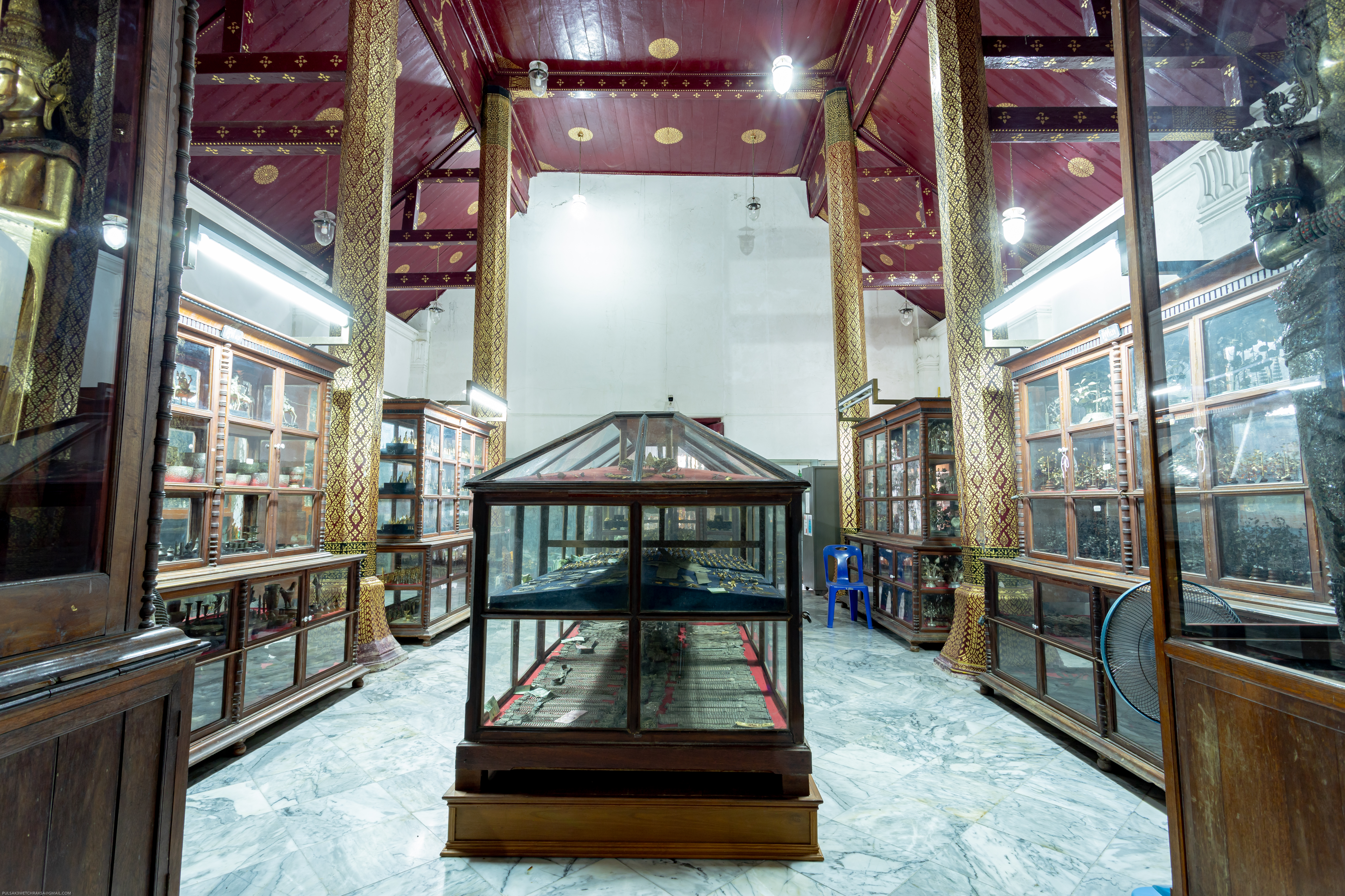 ใน พ.ศ. 2446 วิหารเขียนได้รับการปรับเปลี่ยนให้เป็นพิพิธภัณฑ์ของวัดเพื่อเก็บรักษาวัตถุมงคลและศิลปวัตถุหลายชนิด ภายในพิพิธภัณฑ์แห่งนี้มีศิลปวัตถุสำคัญนับร้อยชิ้น เช่น ดอกไม้และต้นไม้ทำจากเงินและทอง รวมถึงเครื่องประดับเงินและทองหลากหลายประเภท เช่น แหวน สร้อยคอ กำไลข้อมือ กำไลแขน ปิ่นปักผม ตุ้มหู และเข็มขัด นอกจากนี้ยังมีพระพิมพ์ กริช งานสลักจากงาช้าง เสาธง เสาหงส์ เจดีย์จำลอง ศาลาจำลอง เรือสำเภาจำลอง รวงข้าว คันไถ เชี่ยนหมาก ตะบันหมาก และพระพุทธรูปประดับอัญมณี สิ่งที่โดดเด่นในหมู่พระพุทธรูปเหล่านี้ ได้แก่ พระพุทธรูปปางห้ามสมุทรทำจากเงิน และอัญมณี และพระพุทธรูปทองคำถือบาตร วัดพระมหาธาตุมีพิพิธภัณฑ์ที่มีความโดดเด่นอย่างยิ่ง ตั้งอยู่ในวิหารเขียน วิหารโพธิ์ลังกา และอาคารส่วนขยายจากระเบียงคดด้านเหนือ ซึ่งเปิดให้ประชาชน เข้าชมฟรี พิพิธภัณฑ์แห่งนี้เก็บรักษาศิลปวัตถุและโบราณวัตถุจำนวนมากถึง 32,656 รายการ โดยมีงานศิลปะ 84 ชิ้น ที่ได้รับการขึ้นทะเบียนเป็นสมบัติของชาติและประกาศในราชกิจจานุเบกษา รวมทั้งได้รับการคุ้มครองจากรัฐบาล วัตถุมีค่าเหล่านี้ที่ได้รับบริจาคจากเชื้อพระวงศ์และประชาชนทั่วไป เป็นหลักฐานแห่งความศรัทธา วิถีปฏิบัติในการทำกุศลทาน และความเชื่อมโยงทางจิตวิญญาณที่มั่นคงระหว่างอารามแห่งนี้และประชาชน