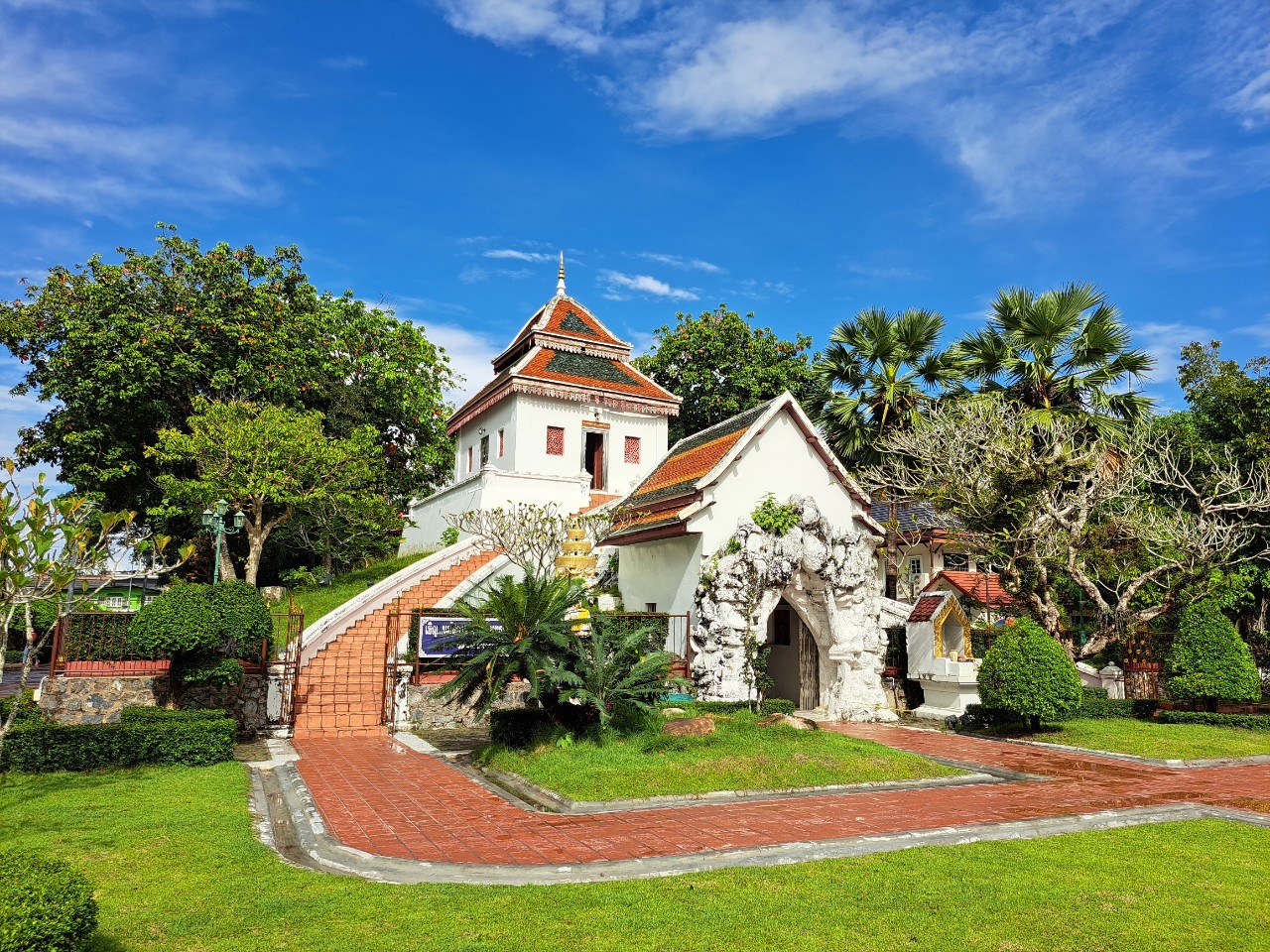 บริเวณฐานของมรฑปพระพุทธบาทมีถ้ำจำลอง ซึ่งขุดลงไปในเนินดินและประดับด้วยชิ้นส่วนสถาปัตยกรรมจากเทวาลัยฮินดูโบราณ มีพระพุทธรูปปางมารวิชัยขัดสมาธิราบชื่อ “พระบุญมาก” อยู่ภายในถ้ำ ด้านหน้าถ้ำมีรูปปั้นพระพุทธรูปมารวิชัยสลักจากหินหยกสีขาวรูปแบบศิลปะพม่า