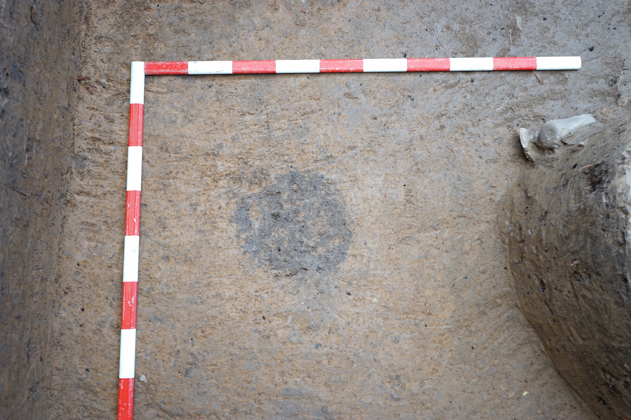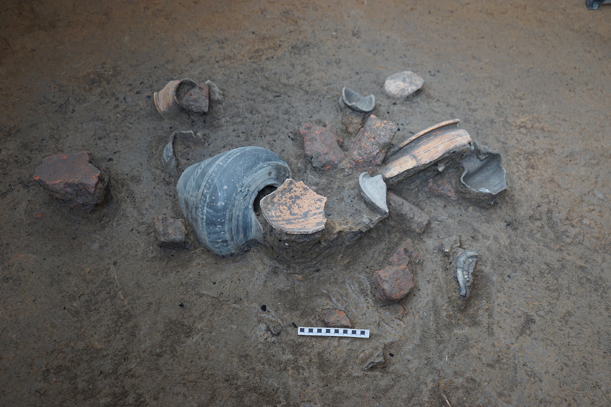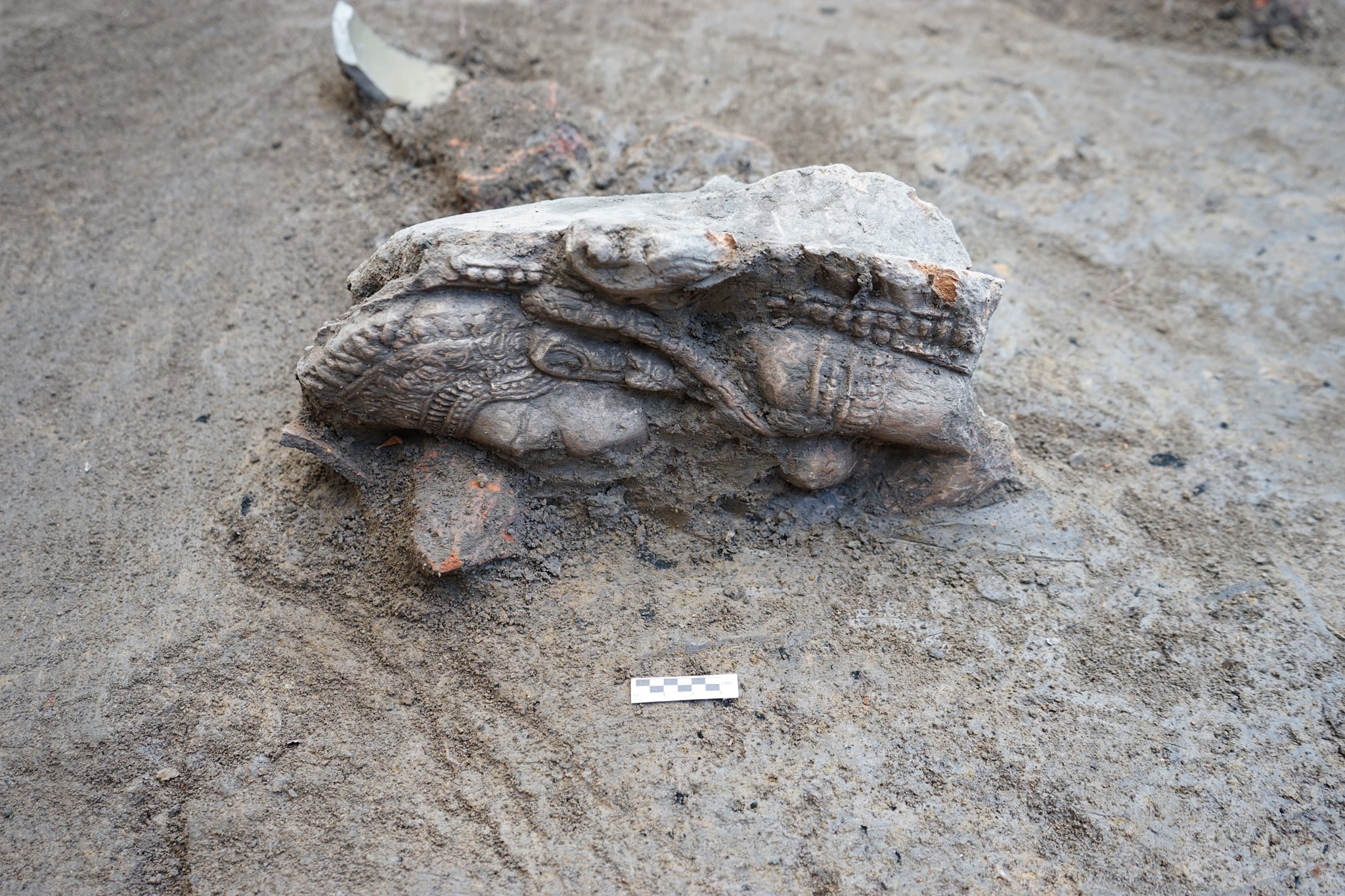 ในระดับที่อยู่ถัดจากชั้นเตาถลุงเหล็กลงไปจากการขุดค้นพบร่องรอยของหลุมเสาไม้ จำนวน 2 หลุม ขนาดเส้นผ่านศูนย์กลาง 25 และ 18 เซนติเมตร และบริเวณเกือบกึ่งกลางหลุมขุดค้นพบร่องรอยคล้ายเป็นหลุมที่ถูกขุดขึ้น ภายในหลุมพบโบราณวัตถุที่มีความหลากหลายในรูปแบบการใช้สอย และอายุสมัย ที่สำคัญได้แก่ ประติมากรรมดินเผารูปนางอัปสรพนมมือ สันนิษฐานว่าเป็นเครื่องประดับส่วนหลังคาสถาปัตยกรรม ลักษณะใบหน้าเป็นรูปค่อนข้างเหลี่ยม คิ้วเป็นสันนูนจมูกใหญ่ ปากกว้างกว้างอมยิ้มเล็กน้อย ใบหูค่อนข้างหนามีติ่งยาวประดับด้วยตุ้มหูรูปดอกไม้ขอบด้านนอกโค้งหยักเป็นรูปคล้ายกะจังรวน สวมเครื่องประดับศีรษะมีกะบังหน้าแบบที่เรียกว่า “เทริด” ศิลปะลพบุรี อายุประมาณพุทธศตวรรษที่ 18 ประติมากรรมดินเผารูปนางอัปสรพนมมือชิ้นนี้ มีรูปแบบคล้ายกับประติมากรรมดินเผารูปใบหน้าบุคคลที่จัดแสดงอยู่ในพิพิธภัณฑสถานแห่งชาติ ชัยนาทมุนี และมีรูปแบบใกล้เคียงกับกระเบื้องเชิงชายที่พบจากวัดพระศรีรัตนมหาธาตุ เมืองเชลียง อำเภอศรีสัชนาลัย จังหวัดสุโขทัย นอกจากนี้ในระดับชั้นดินเดียวกันนี้ยังพบโบราณวัตถุประเภทสิ่งของเครื่องใช้ในชีวิตประจำวัน ได้แก่ ชิ้นส่วนภาชนะดินเผาเนื้อแกร่งจากแหล่งเตาบ้านบางปูน(พุทธศตวรรษที่ (๑๘-๒๑) ชิ้นส่วนเครื่องเคลือบจากแหล่งเตาสุโขทัย และแหล่งเตาศรีสัชนาลัย (พุทธศตวรรษที ๑๘-๒๑) ชิ้นส่วนเครื่องถ้วยจีนเคลือบเขียว สมัยราชวงศ์หยวน (พุทธศตวรรษที่ ๑๙-๒๐) และราชวงศ์หมิง (พุทธศตวรรษที่ ๒๑-๒๒) ชิ้นส่วนลูกกระพรวนสำริด หินบด เศษอิฐชิ้นส่วนเขาสัตว์ตระกูลกวาง และชิ้นส่วนกระดูกสัตว์