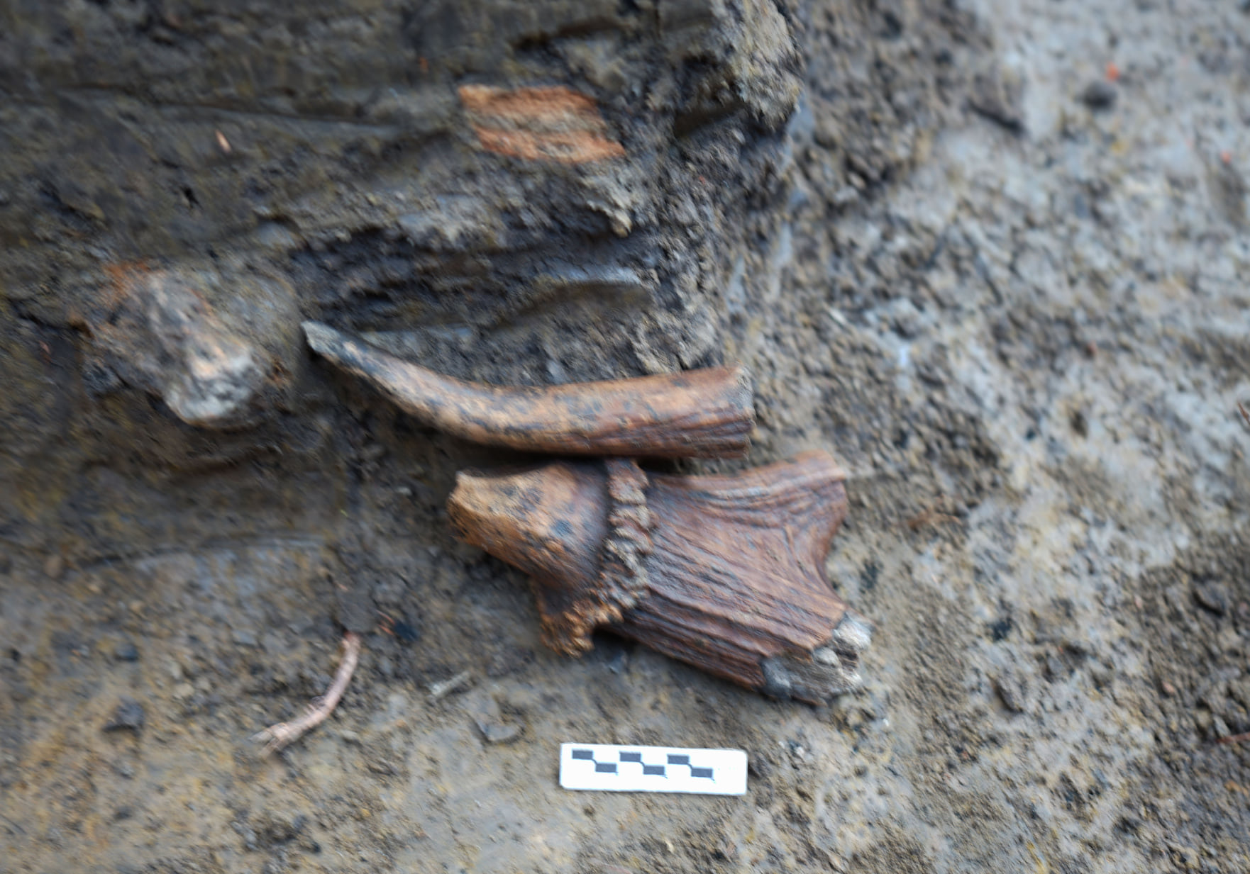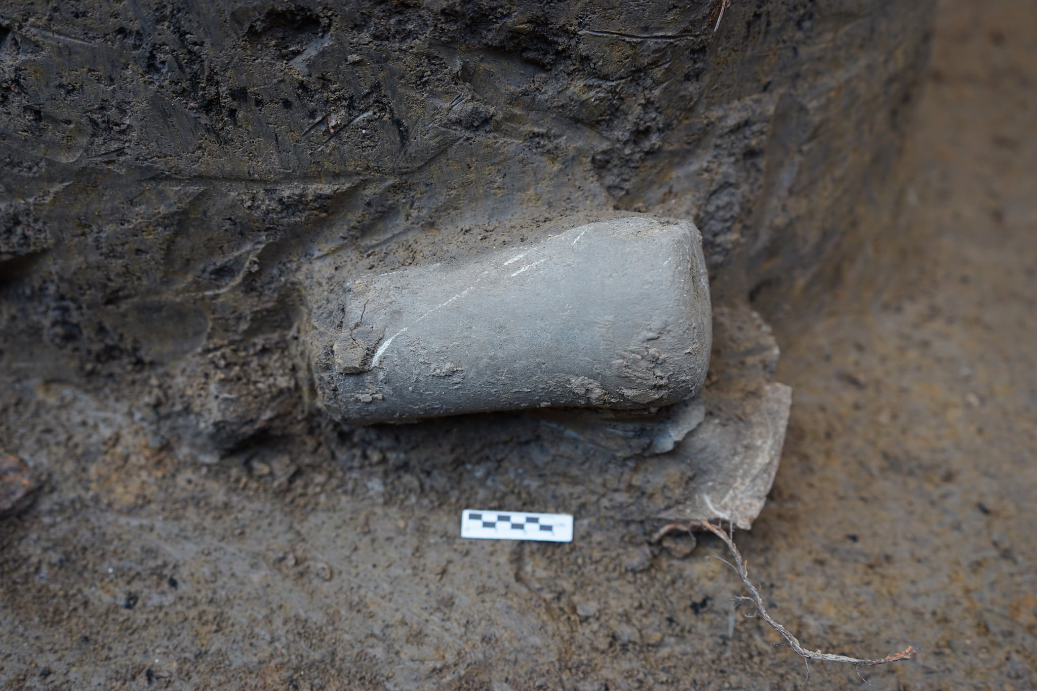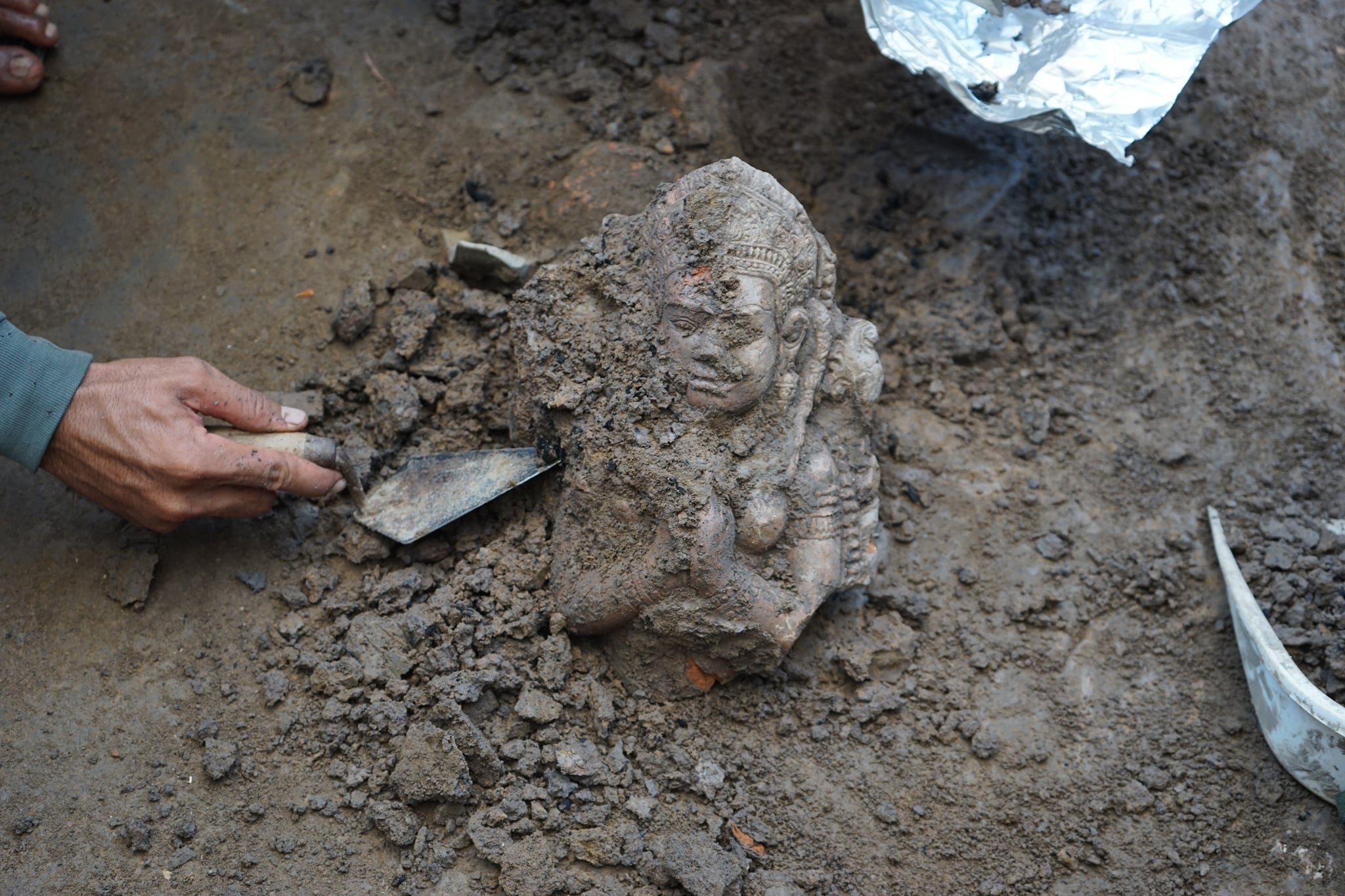 ในระดับที่อยู่ถัดจากชั้นเตาถลุงเหล็กลงไปจากการขุดค้นพบร่องรอยของหลุมเสาไม้ จำนวน 2 หลุม ขนาดเส้นผ่านศูนย์กลาง 25 และ 18 เซนติเมตร และบริเวณเกือบกึ่งกลางหลุมขุดค้นพบร่องรอยคล้ายเป็นหลุมที่ถูกขุดขึ้น ภายในหลุมพบโบราณวัตถุที่มีความหลากหลายในรูปแบบการใช้สอย และอายุสมัย ที่สำคัญได้แก่ ประติมากรรมดินเผารูปนางอัปสรพนมมือ สันนิษฐานว่าเป็นเครื่องประดับส่วนหลังคาสถาปัตยกรรม ลักษณะใบหน้าเป็นรูปค่อนข้างเหลี่ยม คิ้วเป็นสันนูนจมูกใหญ่ ปากกว้างกว้างอมยิ้มเล็กน้อย ใบหูค่อนข้างหนามีติ่งยาวประดับด้วยตุ้มหูรูปดอกไม้ขอบด้านนอกโค้งหยักเป็นรูปคล้ายกะจังรวน สวมเครื่องประดับศีรษะมีกะบังหน้าแบบที่เรียกว่า “เทริด” ศิลปะลพบุรี อายุประมาณพุทธศตวรรษที่ 18 ประติมากรรมดินเผารูปนางอัปสรพนมมือชิ้นนี้ มีรูปแบบคล้ายกับประติมากรรมดินเผารูปใบหน้าบุคคลที่จัดแสดงอยู่ในพิพิธภัณฑสถานแห่งชาติ ชัยนาทมุนี และมีรูปแบบใกล้เคียงกับกระเบื้องเชิงชายที่พบจากวัดพระศรีรัตนมหาธาตุ เมืองเชลียง อำเภอศรีสัชนาลัย จังหวัดสุโขทัย นอกจากนี้ในระดับชั้นดินเดียวกันนี้ยังพบโบราณวัตถุประเภทสิ่งของเครื่องใช้ในชีวิตประจำวัน ได้แก่ ชิ้นส่วนภาชนะดินเผาเนื้อแกร่งจากแหล่งเตาบ้านบางปูน(พุทธศตวรรษที่ (๑๘-๒๑) ชิ้นส่วนเครื่องเคลือบจากแหล่งเตาสุโขทัย และแหล่งเตาศรีสัชนาลัย (พุทธศตวรรษที ๑๘-๒๑) ชิ้นส่วนเครื่องถ้วยจีนเคลือบเขียว สมัยราชวงศ์หยวน (พุทธศตวรรษที่ ๑๙-๒๐) และราชวงศ์หมิง (พุทธศตวรรษที่ ๒๑-๒๒) ชิ้นส่วนลูกกระพรวนสำริด หินบด เศษอิฐชิ้นส่วนเขาสัตว์ตระกูลกวาง และชิ้นส่วนกระดูกสัตว์