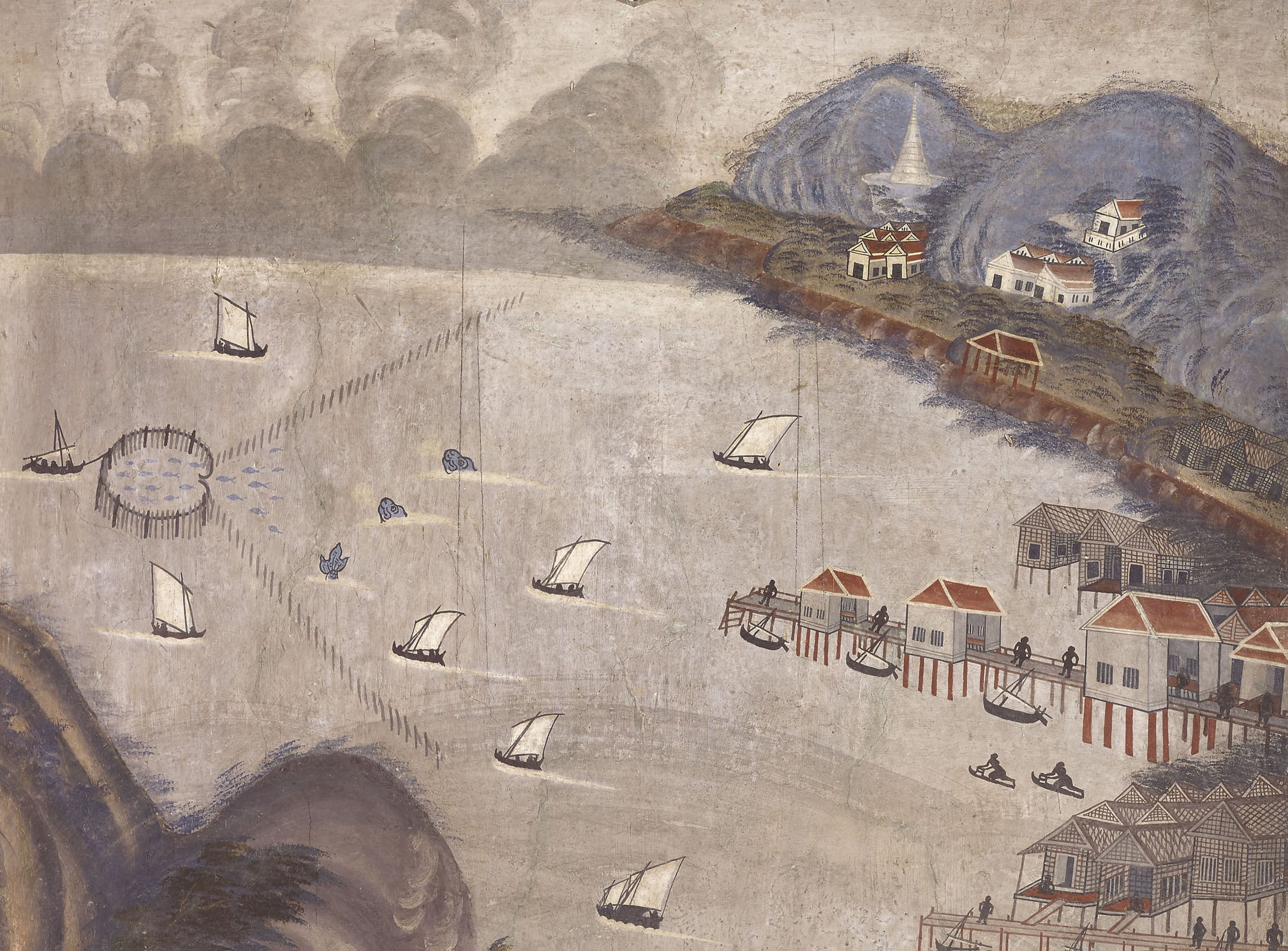 ๓. การเขียนภาพอาคารสิ่งก่อสร้างและวิถีชีวิต มีการเขียนอาคารในรูปแบบทางตะวันตกผสมผสาน เขียนภาพอาคารแบบภาพเปอร์สเปคทีฟ (Perspective)แสดงถึงความลึกทั้งยังใช้เรื่องของสี ร่วมด้วย คือในระยะที่ลึกเข้าไปภายในอาคารจะไล่น้ำหนักของสีใช้สีเข้มทึบดำเพื่อแสดงให้เห็นถึงความลึกเข้าไปภายในเสมือนกับแสงที่ไม่สามารถส่องเข้าไปได้ ทั้งยังมีการเขียนสอดแทรกวิถีชีวิตความเป็นอยู่ของผู้คนในสมัยนั้นเข้าไปในภาพด้วย เช่นชีวิตของชาวเล การทำประมง รูปแบบเรือต่างๆ ซึ่งภาพที่ปรากฏนี้เป็นข้อมูลที่สามารถนำไปศึกษาค้นคว้าในเรื่องของประวัติศาสตร์ต่อไปได้อีกด้วย
